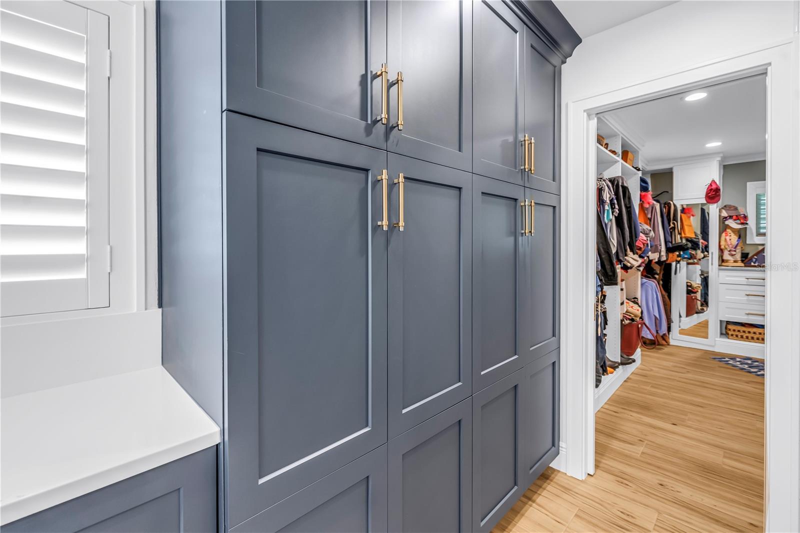 - Built-in Features, Ceiling Fans(s), Eat-in Kitchen, High Ceilings, Kitchen/Family Room Combo, Open Floorplan, Primary Bedroom Main Floor, Solid Surface Counters, Solid Wood Cabinets, Split Bedroom, Stone Counters, Walk-In Closet(s), Wet Bar, Window Treatments
