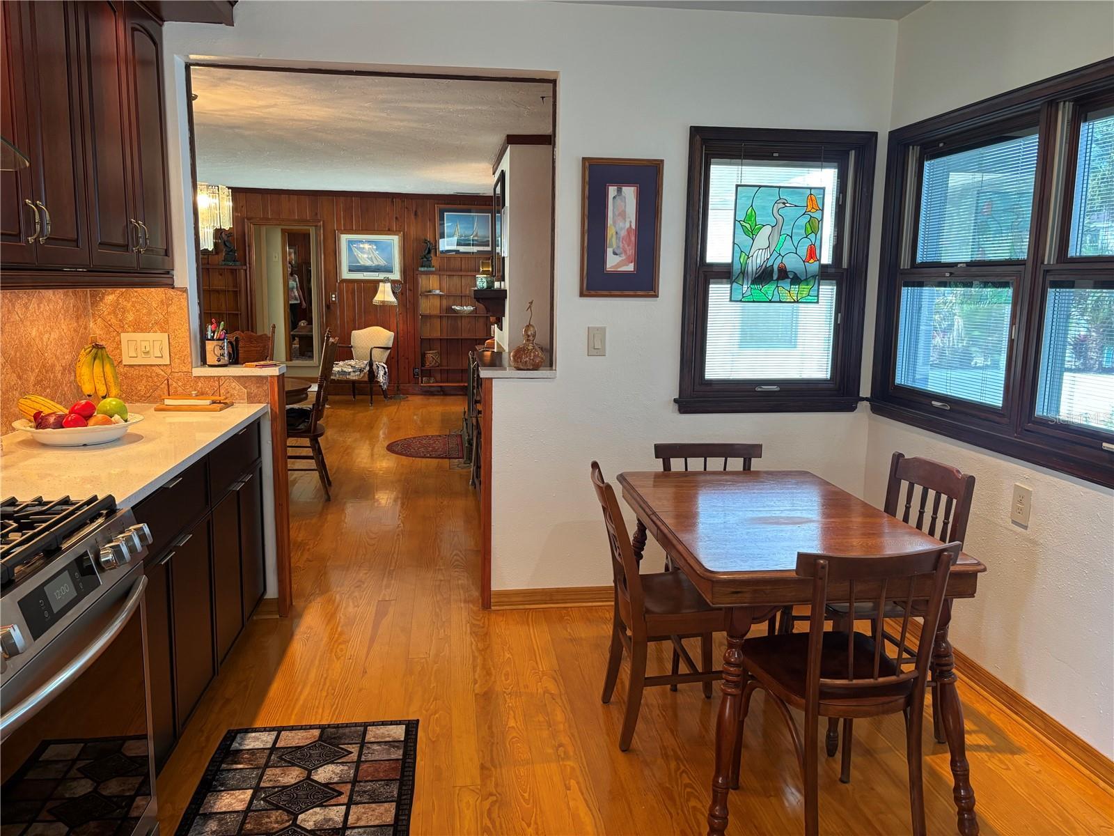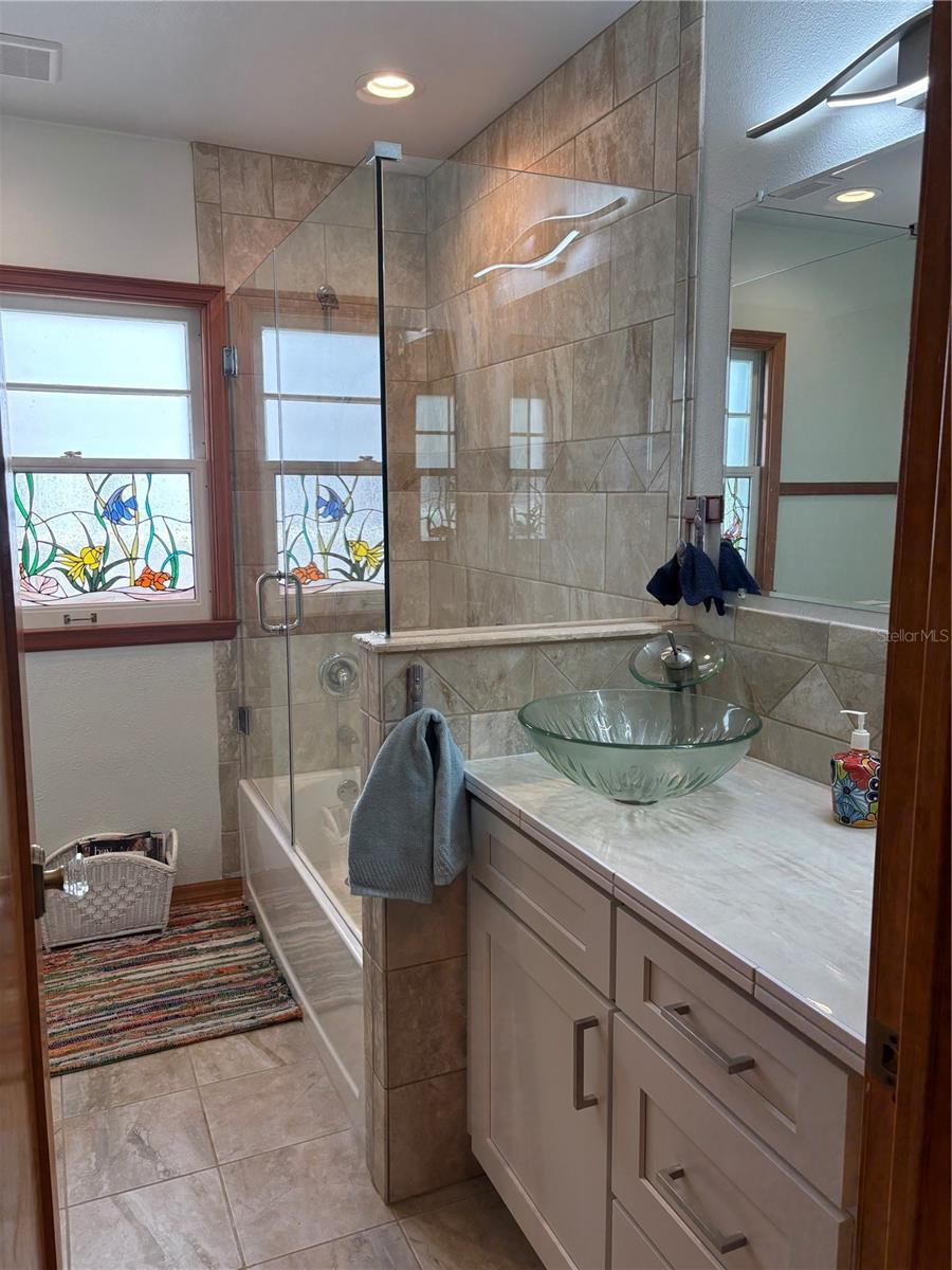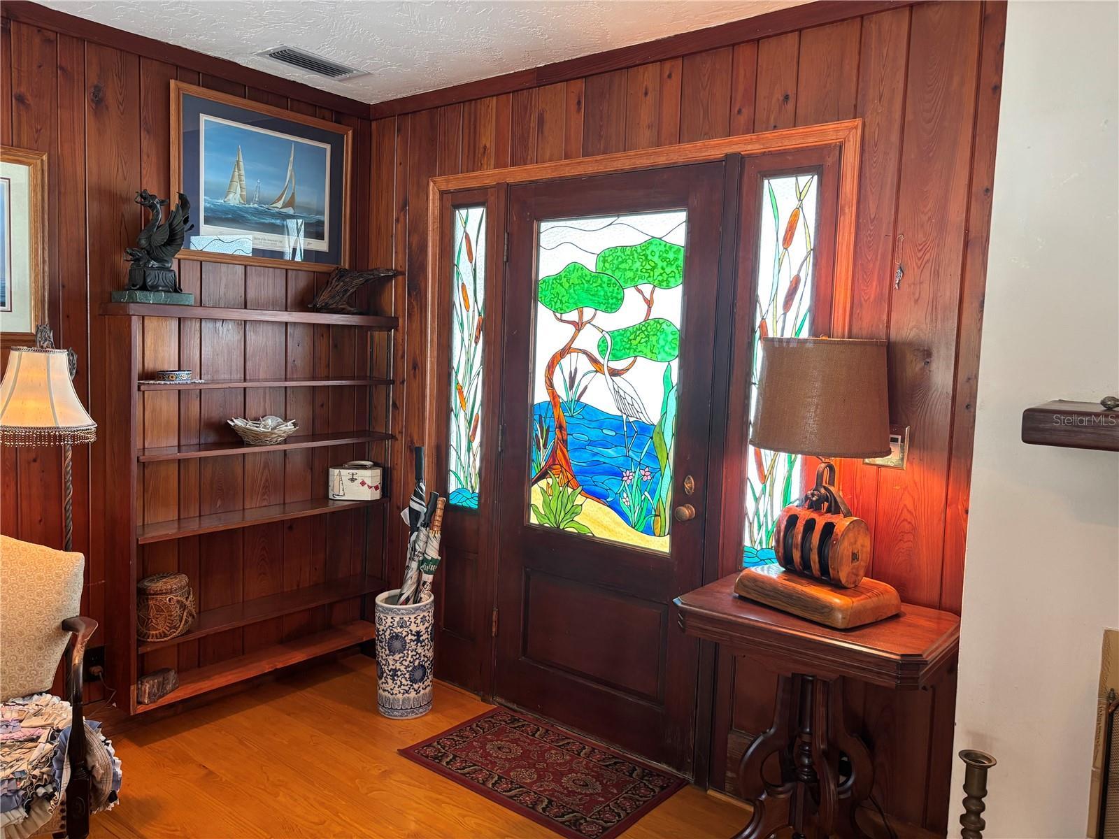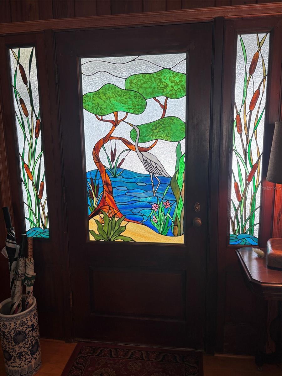 Step into the tropical romance of island life in this richly appointed Clearwater Beach beauty. This vintage home has many custom features including oak wall paneling by master carpenters and stained glass that is absolutely stunning. The location is just off the Intracoastal Waterway with deep water consistently at the dock. The L shaped dock is 62 ft. with Trex decking and a 10,000 lb. lift. The fish are jumping and the dolphins are playing. The home has a new roof (2025), tankless water heater and the a/c is 2014. As you step through the stunning stained glass front door, you are taken in by the water views surrounding the many windows. The elegant great room, primary bedroom and second bedroom all have Pella double glass windows and sliders with slim enclosed shades to afford outstanding views of the great waterfront. The floor plan is open with a split bedroom layout. The primary bedroom is spacious and has the ensuite bath with spectacular stained glass walk-in shower. The chef in the family will love all the new appliances including the gas oven and range, classic tile backsplash, the new stainless single bowl sink, abundance of windows, and surrounding overhead lighting. The dock provides electric and water for your fishermen and boaters. It is a very easy walk to the main beach for the many fabulous restaurants, shops, and tourist boats. It is a few minutes to the Gulf by boat too. The all new gleaming pine wood floors and impervious vintage quarry tile in the great room are a joy to behold. While the fabulous restaurants and shops are all very close, this street is very quiet with very little traffic because it is a cul de sac. The water side is quiet too with just a pelican or egret coming by looking for dinner. Clearwater Beach is the LOCATION LOCATION LOCATION. It is consistently rated in the top beaches of the world. We have the best airport within 45 minutes in Tampa and also we have the St. Pete Clearwater airport. Sports teams abound as do entertainment venues. Tourists plan all year to come to Clearwater Beach for a week and hope to come back year after year. You can have it all. Live in Paradise 24/7 in this classic prime waterfront home and enjoy life to the fullest.