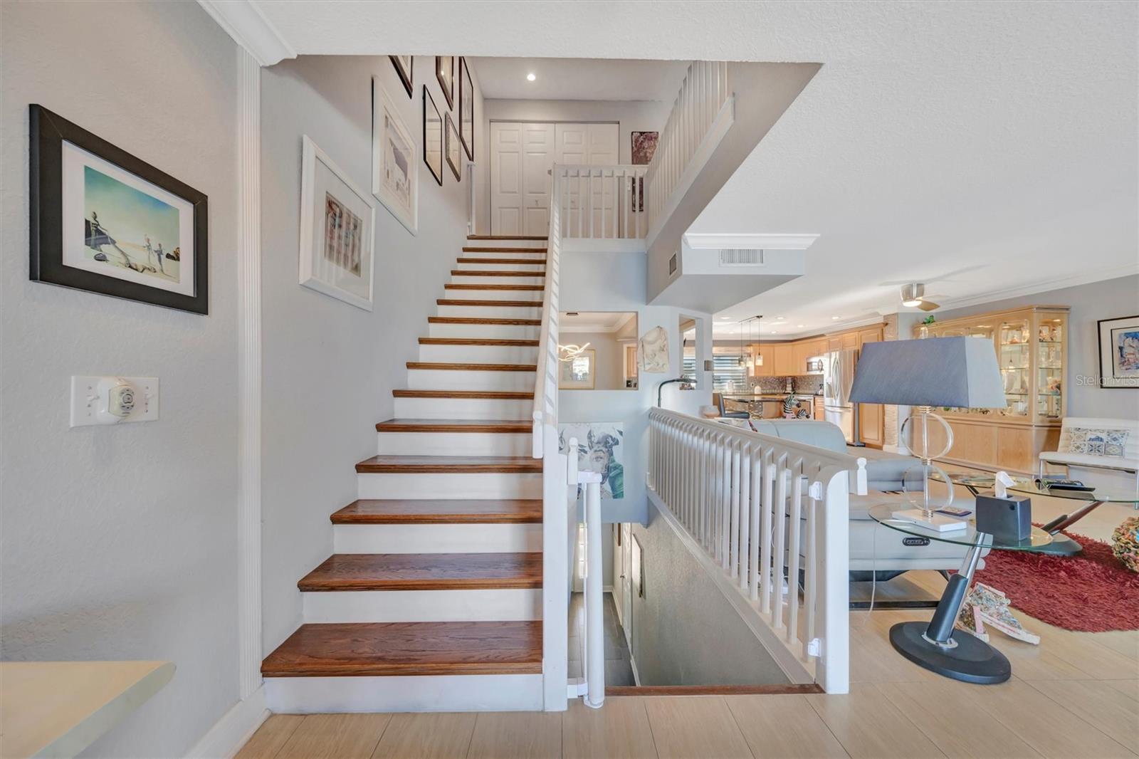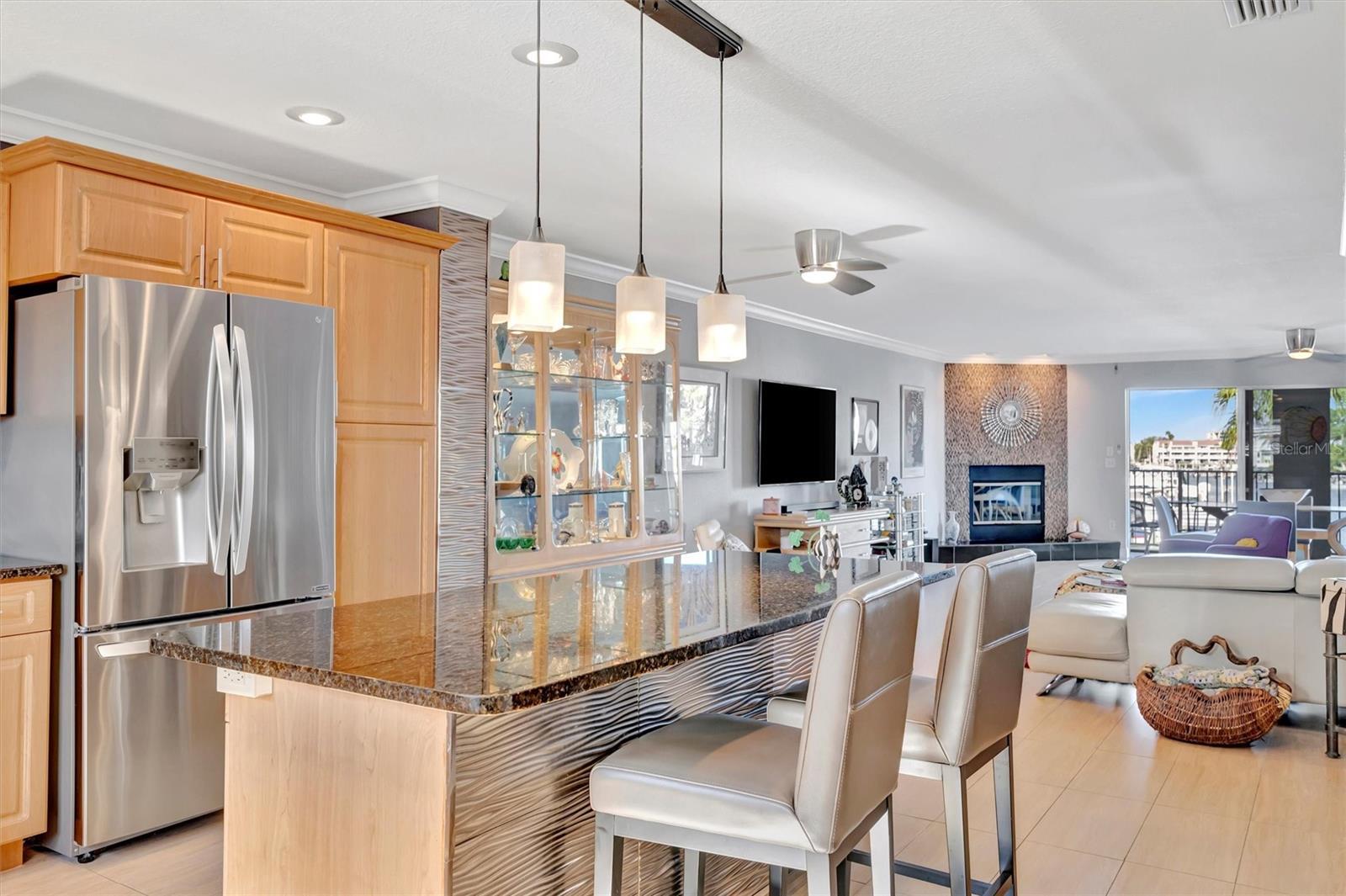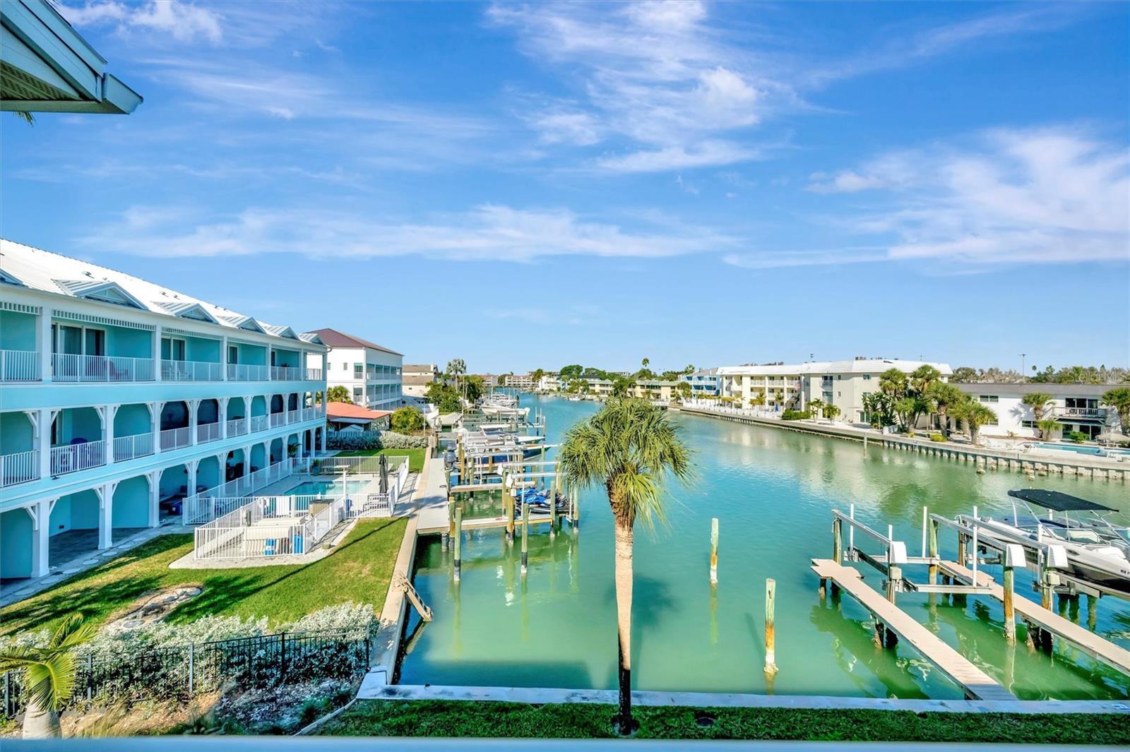 Wide, spacious, and beautifully positioned, this three-bedroom, two-and-a-half-bath waterfront townhome offers the best of Treasure Island living—complete with a private boat slip and lift, balconies on all levels, and less than a five-minute walk to the beach. Designed across three levels, all concrete block, the first floor features an oversized garage that can comfortably accommodate at least three vehicles, along with additional space for storage, water toys, or a workshop. The first level is equipped with 250-amp electrical service, offering expanded capacity that may accommodate additional features such as a hot tub or electric vehicle charging. A motorized awning on the ground level enhances the waterfront area, creating a shaded space ideal for relaxing or entertaining by the dock. Direct access to the water makes boating effortless, with quick passage to the Gulf in under five minutes. The second level is dedicated to open-concept living, finished with ceramic tile floors and designed to capture natural light and water views. Sliding glass doors lead to a large waterfront balcony, extending the living space outdoors. A beautiful fireplace anchors the living room, while hurricane shutters provide added peace of mind. The kitchen is both functional and inviting, offering slide-out cabinetry, abundant storage, a center island with refrigerator and wine bar, a built-in desk area, and a dedicated dining area enhanced by engineered wood flooring—ideal for everyday living and entertaining. The third level hosts the private sleeping quarters, highlighted by a spacious primary suite with its own balcony overlooking the water. The remodeled primary bath features soft-close cabinetry, a deep Kohler soaking tub, a separate water closet, and generous storage. A large walk-in closet with engineered wood flooring completes the retreat. Bedrooms two and three are well-sized and ideal for guests, family, or a home office. Laundry is conveniently located on the upper level. Additional features include a water softener system and thoughtful upgrades throughout. Enjoy boating from your backyard, easy beach access, and the convenience of being close to dining, shopping, and everything Treasure Island has to offer. Schedule your private showing today and experience waterfront living just minutes from the beach.