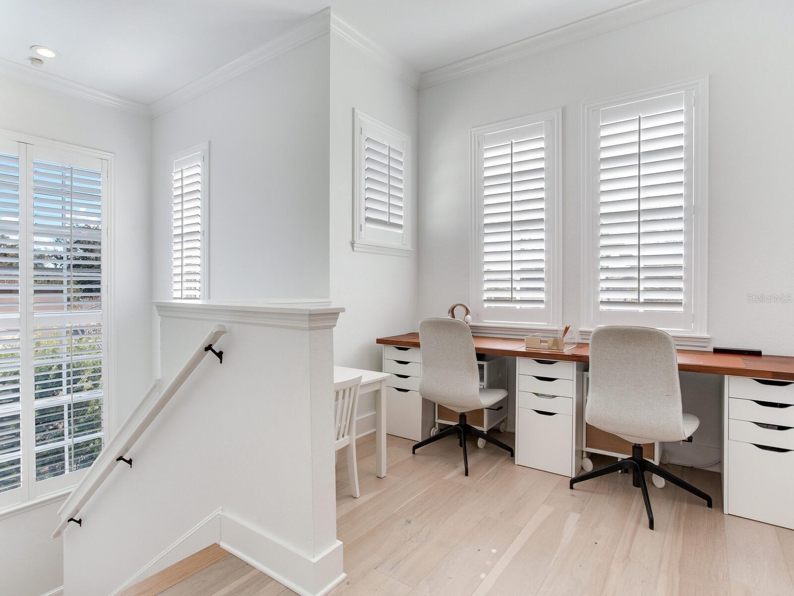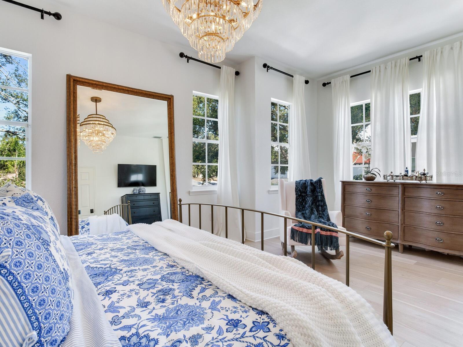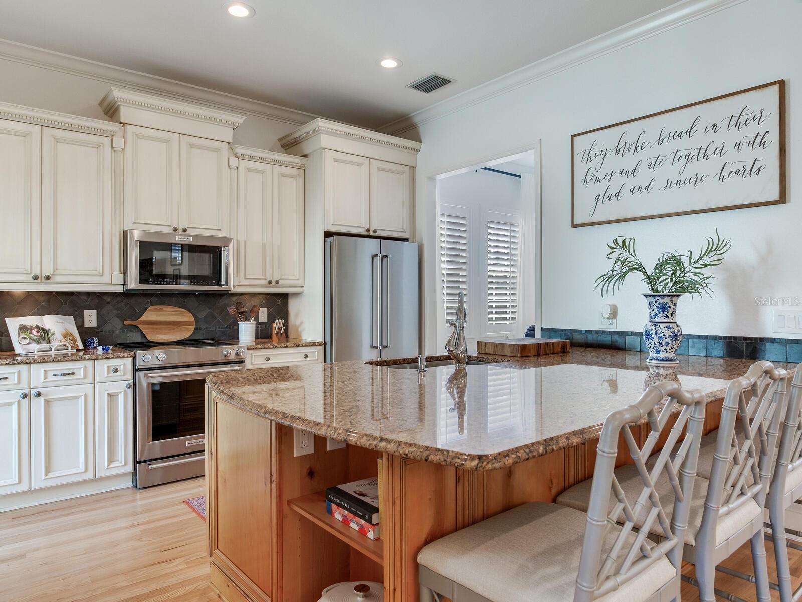 - Crown Molding, Eat-in Kitchen, High Ceilings, Kitchen/Family Room Combo, PrimaryBedroom Upstairs, Split Bedroom, Stone Counters, Thermostat, Walk-In Closet(s), Window Treatments