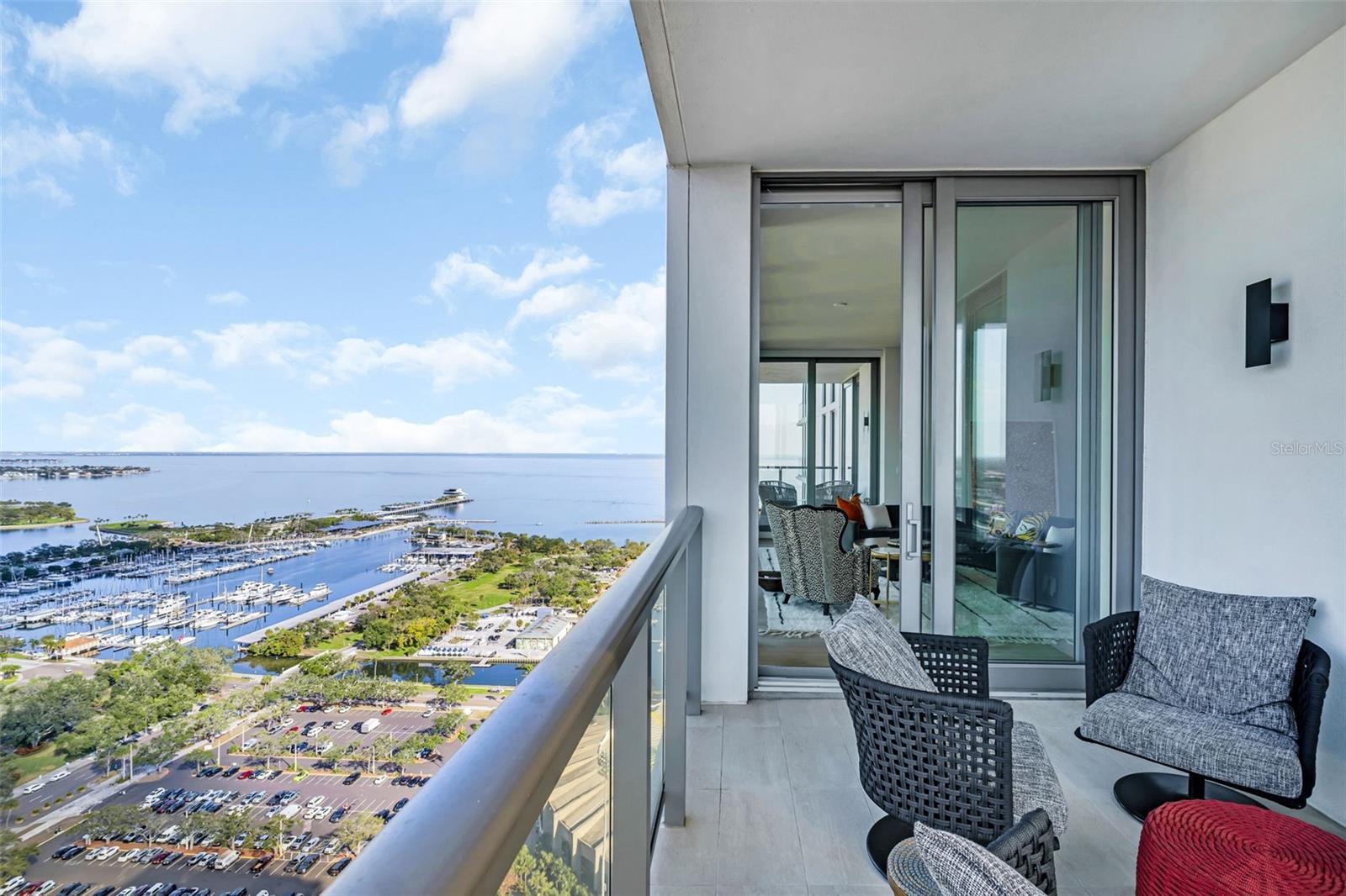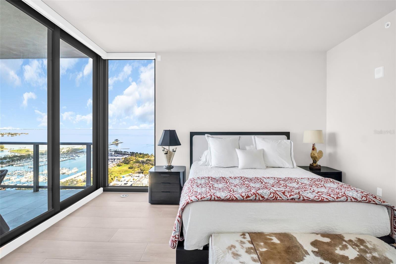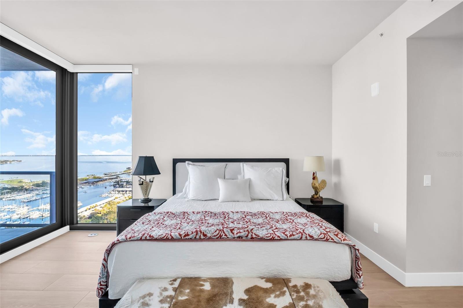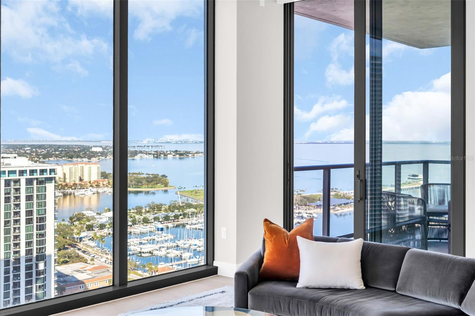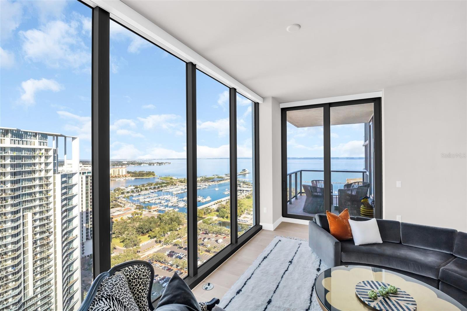 Soaring high above the city on the 31st floor of Saltaire, this exceptional 2-bedroom + den, 3-bath residence offers a refined blend of luxury, sophistication, and modern design. Spanning 2,036 square feet, the home showcases dramatic west-facing water views and captivating eastern city skyline vistas, creating a dynamic living experience from sunrise to sunset. A gracious entry opens into a light-filled, open-concept living space where floor-to-ceiling windows frame sweeping panoramas of Tampa Bay and downtown St. Petersburg. Porcelain plank flooring throughout enhances the home's clean, contemporary aesthetic while providing a seamless flow from room to room. Remote-controlled electric window blinds offer effortless comfort and privacy at the touch of a button. The designer kitchen is both elegant and highly functional, featuring quartz countertops, an induction cooktop, wine refrigerator, and thoughtfully upgraded pull-out shelving systems that maximize storage and organization. Whether hosting guests or enjoying a quiet evening in, the kitchen flows beautifully into the main living and dining areas, all set against a stunning backdrop of sky-high views. The versatile den with full bath provides flexibility as a home office, media room, or guest suite-ideal for today's lifestyles. The primary suite is a serene retreat, offering expansive views, a spa-inspired bath, and refined finishes designed for relaxation. A spacious secondary bedroom with its own bath ensures comfort and privacy for guests or additional household members. This residence includes two secured parking spaces, adding convenience and value in one of downtown's most sought-after towers. As a resident of Saltaire, enjoy access to world-class amenities including concierge services, a state-of-the-art fitness center, and a spectacular amenities deck offering some of the most breathtaking views in the city. Perfectly positioned in the heart of Downtown St. Petersburg, you're moments from acclaimed dining, vibrant cultural venues, waterfront parks, and all the energy that defines luxury urban living. A rare opportunity to own a sky-high, design-forward residence that seamlessly blends waterfront beauty with the excitement of downtown St. Pete.
