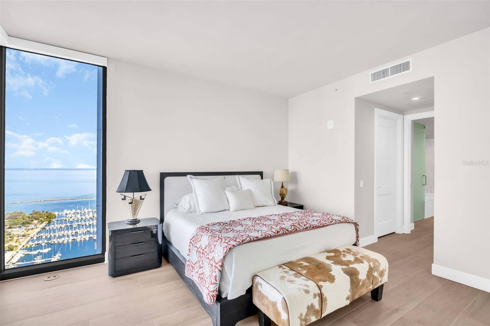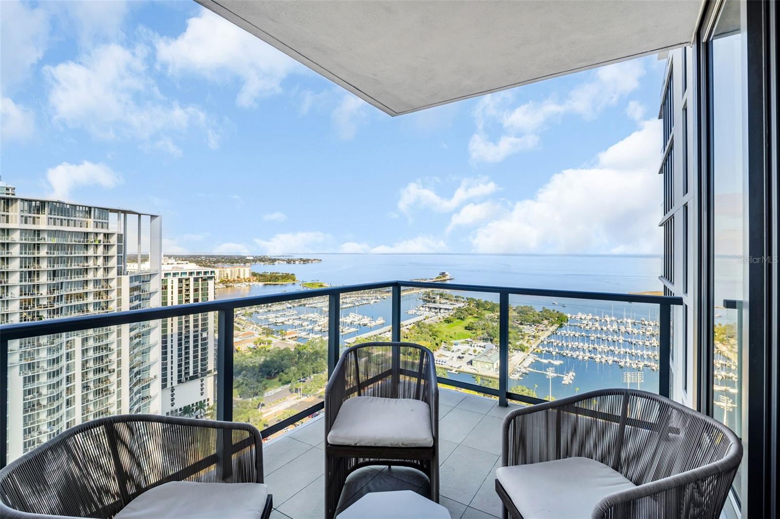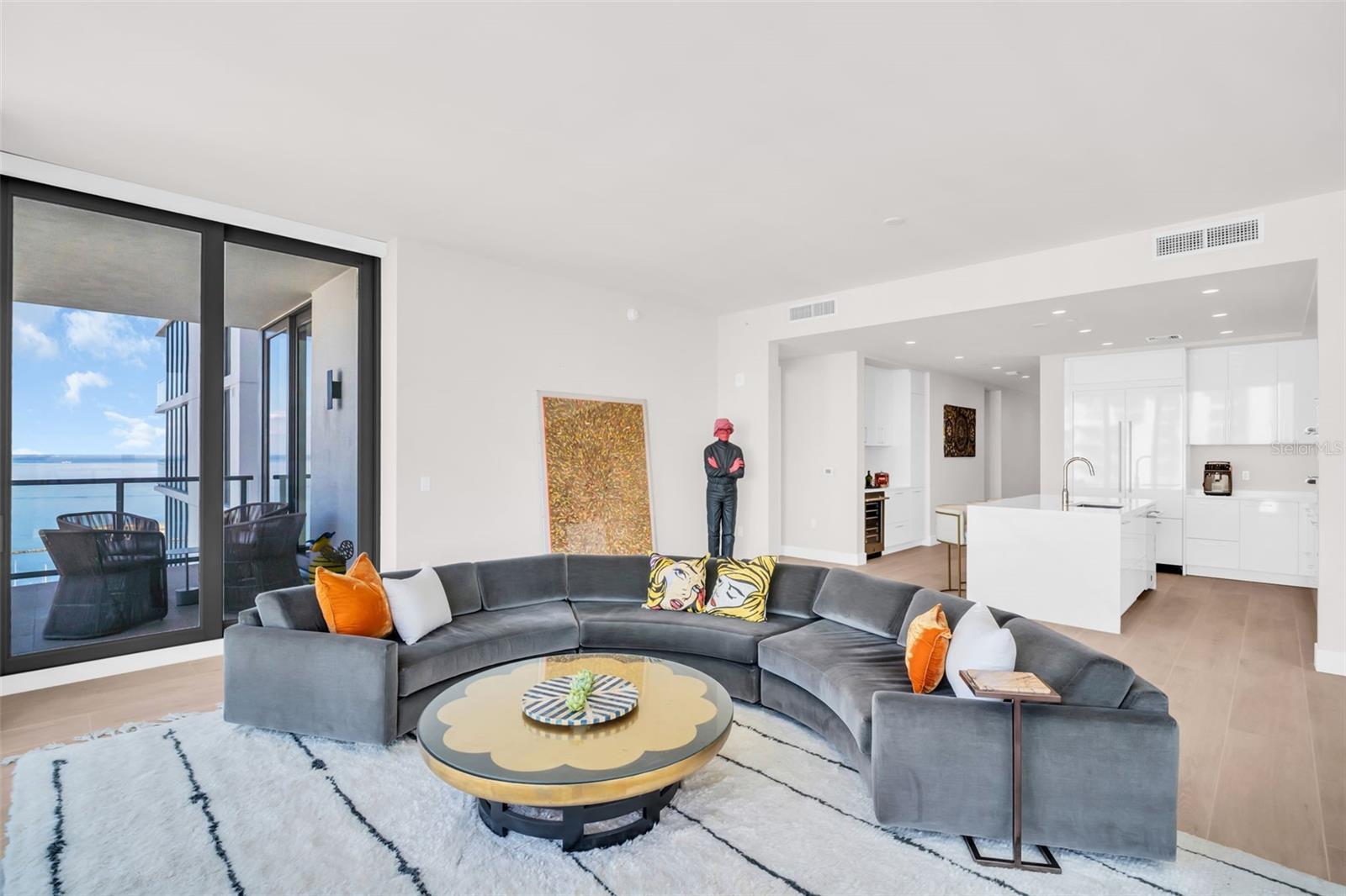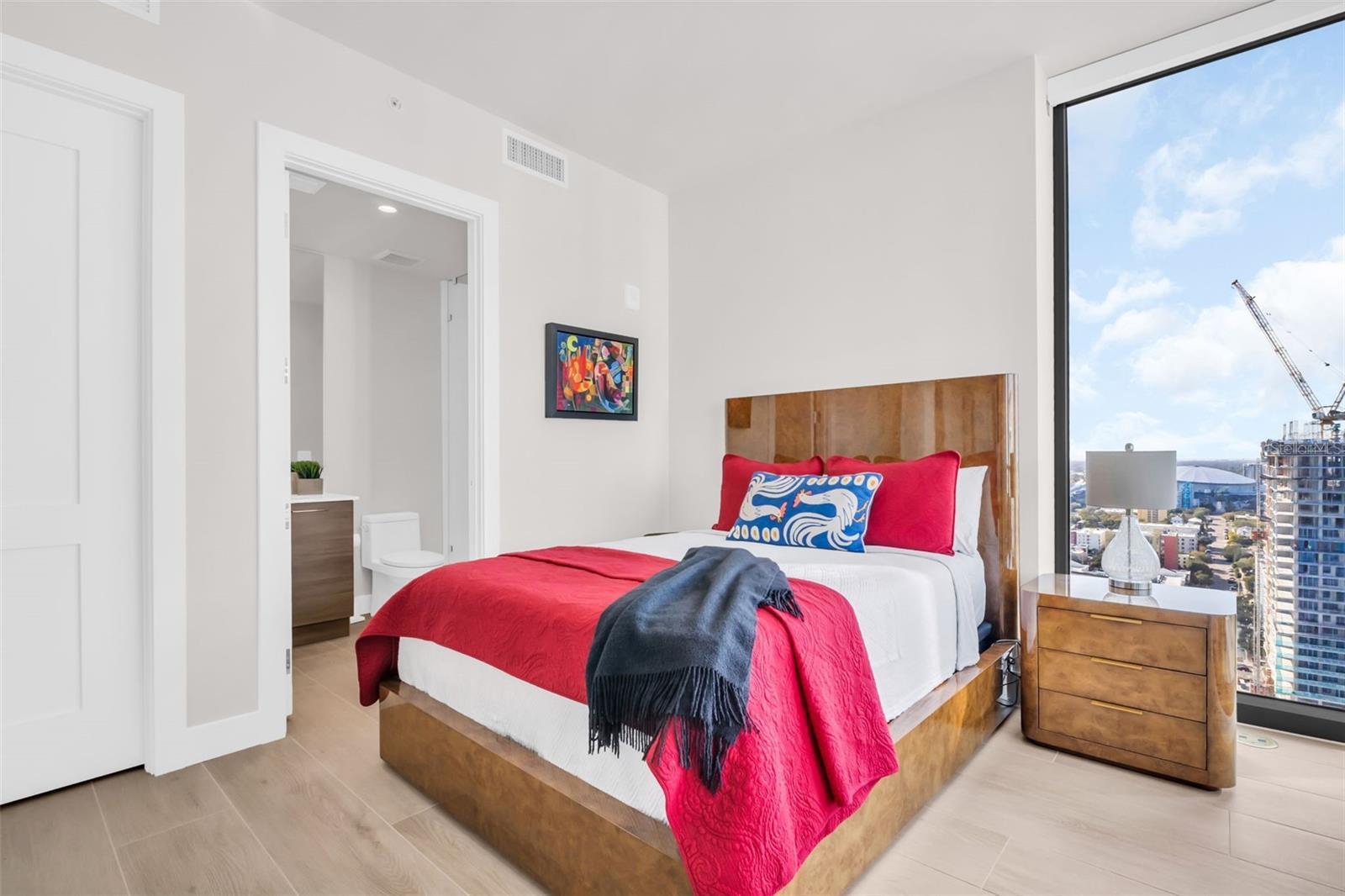 Soaring high above the city on the 31st floor of Saltaire, this exceptional 2-bedroom + den, 3-bath residence offers a refined blend of luxury, sophistication, and modern design. Spanning 2,036 square feet, the home showcases dramatic west-facing water views and captivating eastern city skyline vistas, creating a dynamic living experience from sunrise to sunset. A gracious entry opens into a light-filled, open-concept living space where floor-to-ceiling windows frame sweeping panoramas of Tampa Bay and downtown St. Petersburg. Porcelain plank flooring throughout enhances the home's clean, contemporary aesthetic while providing a seamless flow from room to room. Remote-controlled electric window blinds offer effortless comfort and privacy at the touch of a button. The designer kitchen is both elegant and highly functional, featuring quartz countertops, an induction cooktop, wine refrigerator, and thoughtfully upgraded pull-out shelving systems that maximize storage and organization. Whether hosting guests or enjoying a quiet evening in, the kitchen flows beautifully into the main living and dining areas, all set against a stunning backdrop of sky-high views. The versatile den with full bath provides flexibility as a home office, media room, or guest suite-ideal for today's lifestyles. The primary suite is a serene retreat, offering expansive views, a spa-inspired bath, and refined finishes designed for relaxation. A spacious secondary bedroom with its own bath ensures comfort and privacy for guests or additional household members. This residence includes two secured parking spaces, adding convenience and value in one of downtown's most sought-after towers. As a resident of Saltaire, enjoy access to world-class amenities including concierge services, a state-of-the-art fitness center, and a spectacular amenities deck offering some of the most breathtaking views in the city. Perfectly positioned in the heart of Downtown St. Petersburg, you're moments from acclaimed dining, vibrant cultural venues, waterfront parks, and all the energy that defines luxury urban living. A rare opportunity to own a sky-high, design-forward residence that seamlessly blends waterfront beauty with the excitement of downtown St. Pete.