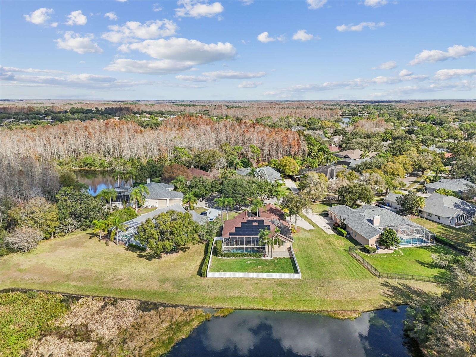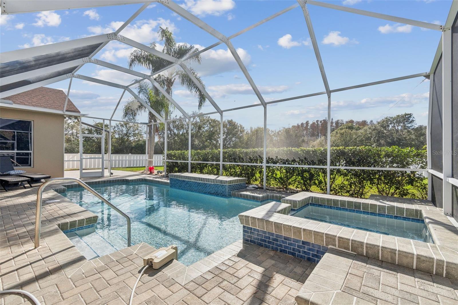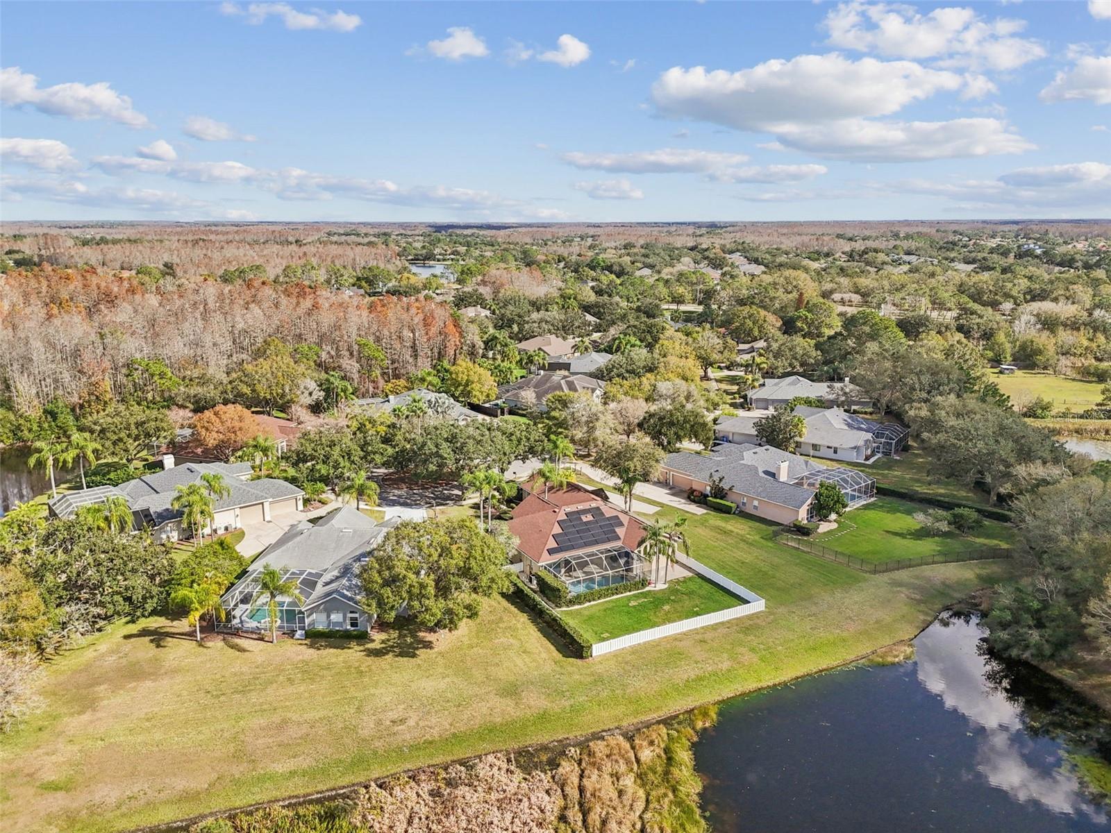 Under contract-accepting backup offers. One or more photo(s) has been virtually staged. Welcome to this stunning executive pool home located in the highly sought-after community of Villarosa, where luxury living meets modern convenience. Situated on nearly half an acre with tranquil pond and conservation views, this expansive 4-bedroom home with office and flex/bonus room, 3 bathrooms, and an oversized 3-car garage is tucked away on a quiet, tree-lined cul-de-sac within the exclusive, gated village of Faberge—a rare collection of just 27 homes, all on approximately half-acre homesites. A beautifully landscaped courtyard leads you to elegant French doors that open into a grand interior featuring soaring coffered ceilings in the formal living and dining rooms. Luxury plank vinyl flooring throughout the home offers both sophistication and durability. At the front of the home, a dedicated executive office with custom desk and shelving provides a polished and private workspace. The owner’s suite is a sanctuary of comfort and style, featuring dual custom walk-in closets and a spa-inspired en-suite bath complete with a deep soaking tub, separate vanities, and refined finishes—your personal retreat at the end of the day. At the heart of the home lies an impressive chef’s kitchen overlooking the expansive family room. Designed for both beauty and performance, the kitchen boasts a large center island, granite countertops, stainless steel appliances, and an inviting eat-in area. A beautifully designed wall of windows fills the adjacent family room with natural light and showcase tranquil views of the outdoor setting. The home’s split-bedroom design offers three additional generously sized bedrooms, one with direct access to a full bath—ideal for guests or multigenerational living. Each bedroom is enhanced with custom closet systems, adding both luxury and organization. Adding even more versatility is a flex/bonus room off the garage, ideal for a game room, media room, home gym, or play space. Step outside to your own private outdoor oasis featuring a sparkling heated pool with spa, a massive fully fenced backyard, and peaceful pond and conservation views. An additional patio area is perfect for relaxing evenings, entertaining guests, or gathering around a firepit. Car enthusiasts and hobbyists will appreciate the oversized, temperature controlled 3-car garage, complete with an EV charging station. Fully owned solar panels, to be paid off by the seller at closing, provide enhanced energy efficiency and reduced utility costs. Recent updates include interior and exterior paint (December 2025), new HVAC (2024), newer water heater, pool resurfacing (2024), and a new fence. Residents of Villarosa enjoy community amenities such as playgrounds, tennis courts, scenic waterfront areas, and open green spaces. This home is located in the highly sought-after A-rated school district of McKitrick Elementary, Martinez Middle, and Steinbrenner High School, all within walking distance. Convenient access to shopping, dining, and major highways makes commuting a breeze. This exceptional home truly has it all—schedule your private showing today and experience Florida living at its finest!