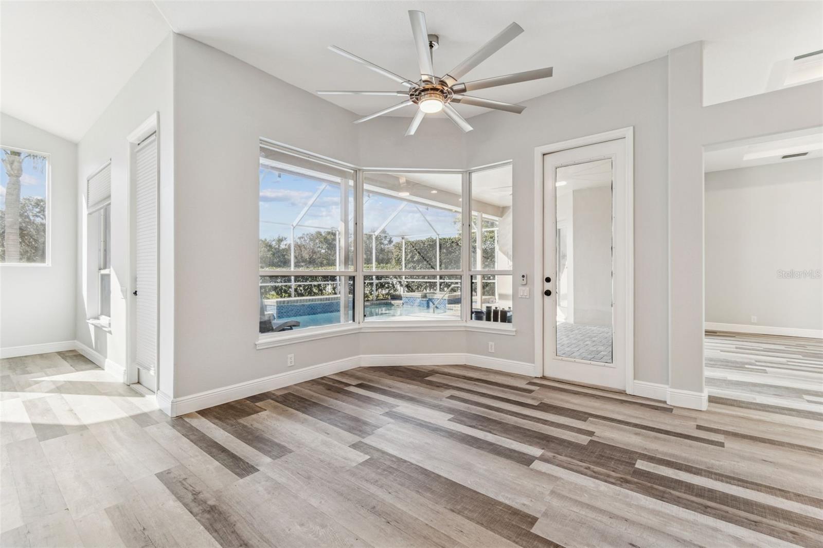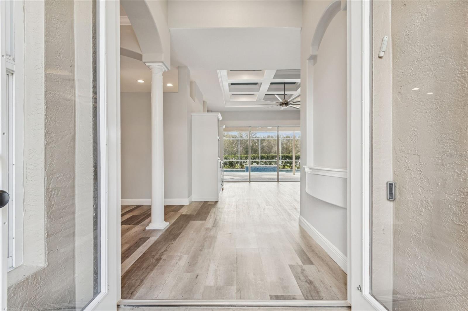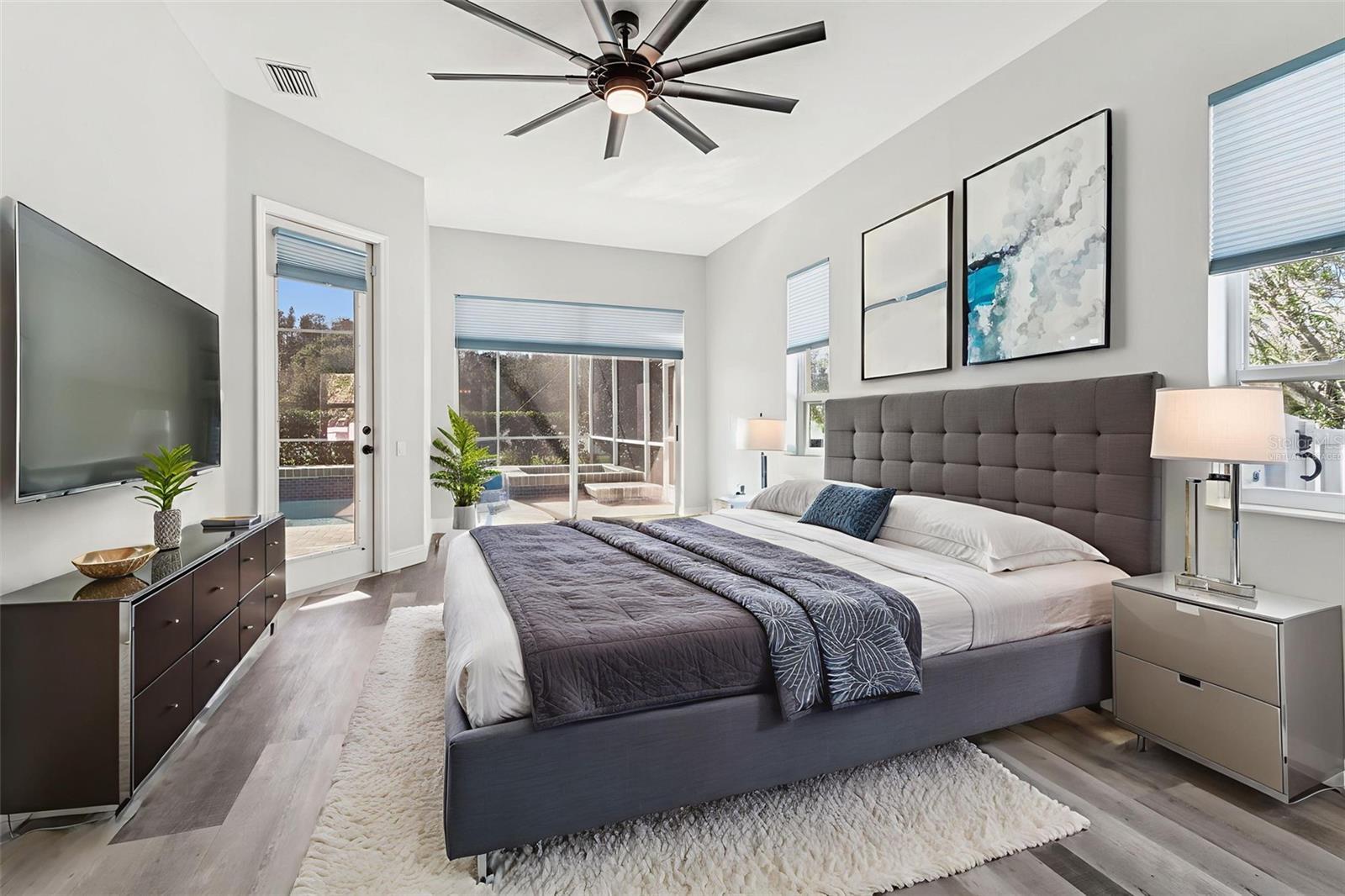 Under contract-accepting backup offers. One or more photo(s) has been virtually staged. Welcome to this stunning executive pool home located in the highly sought-after community of Villarosa, where luxury living meets modern convenience. Situated on nearly half an acre with tranquil pond and conservation views, this expansive 4-bedroom home with office and flex/bonus room, 3 bathrooms, and an oversized 3-car garage is tucked away on a quiet, tree-lined cul-de-sac within the exclusive, gated village of Faberge—a rare collection of just 27 homes, all on approximately half-acre homesites. A beautifully landscaped courtyard leads you to elegant French doors that open into a grand interior featuring soaring coffered ceilings in the formal living and dining rooms. Luxury plank vinyl flooring throughout the home offers both sophistication and durability. At the front of the home, a dedicated executive office with custom desk and shelving provides a polished and private workspace. The owner’s suite is a sanctuary of comfort and style, featuring dual custom walk-in closets and a spa-inspired en-suite bath complete with a deep soaking tub, separate vanities, and refined finishes—your personal retreat at the end of the day. At the heart of the home lies an impressive chef’s kitchen overlooking the expansive family room. Designed for both beauty and performance, the kitchen boasts a large center island, granite countertops, stainless steel appliances, and an inviting eat-in area. A beautifully designed wall of windows fills the adjacent family room with natural light and showcase tranquil views of the outdoor setting. The home’s split-bedroom design offers three additional generously sized bedrooms, one with direct access to a full bath—ideal for guests or multigenerational living. Each bedroom is enhanced with custom closet systems, adding both luxury and organization. Adding even more versatility is a flex/bonus room off the garage, ideal for a game room, media room, home gym, or play space. Step outside to your own private outdoor oasis featuring a sparkling heated pool with spa, a massive fully fenced backyard, and peaceful pond and conservation views. An additional patio area is perfect for relaxing evenings, entertaining guests, or gathering around a firepit. Car enthusiasts and hobbyists will appreciate the oversized, temperature controlled 3-car garage, complete with an EV charging station. Fully owned solar panels, to be paid off by the seller at closing, provide enhanced energy efficiency and reduced utility costs. Recent updates include interior and exterior paint (December 2025), new HVAC (2024), newer water heater, pool resurfacing (2024), and a new fence. Residents of Villarosa enjoy community amenities such as playgrounds, tennis courts, scenic waterfront areas, and open green spaces. This home is located in the highly sought-after A-rated school district of McKitrick Elementary, Martinez Middle, and Steinbrenner High School, all within walking distance. Convenient access to shopping, dining, and major highways makes commuting a breeze. This exceptional home truly has it all—schedule your private showing today and experience Florida living at its finest!