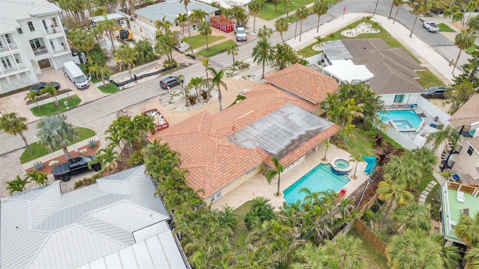 Discover this exceptional rare double lot (approximately 110 ft wide) in the highly sought-after Carlouel neighborhood on Clearwater Beach. The existing residence sustained damage from Hurricane Helene and is now a blank slate ready for full renovation or complete rebuild. Behind the home awaits an outstanding outdoor oasis featuring a spacious paver patio, refreshing pool and spa, and mature, lush tropical landscaping that provides privacy and tranquility. One of the standout features is the expansive garages—one of the largest on the island—capable of accommodating 12+ vehicles w/lifts, making it ideal for car enthusiasts, boat storage, or additional parking needs. This property offers an incredible canvas for your dream coastal home. Just a short walk to private beach access, serene sunsets, and the nearby Carlouel Yacht Club, with the vibrant amenities of Clearwater Beach only minutes away. This is a unique chance to create your perfect island retreat in a prime location.