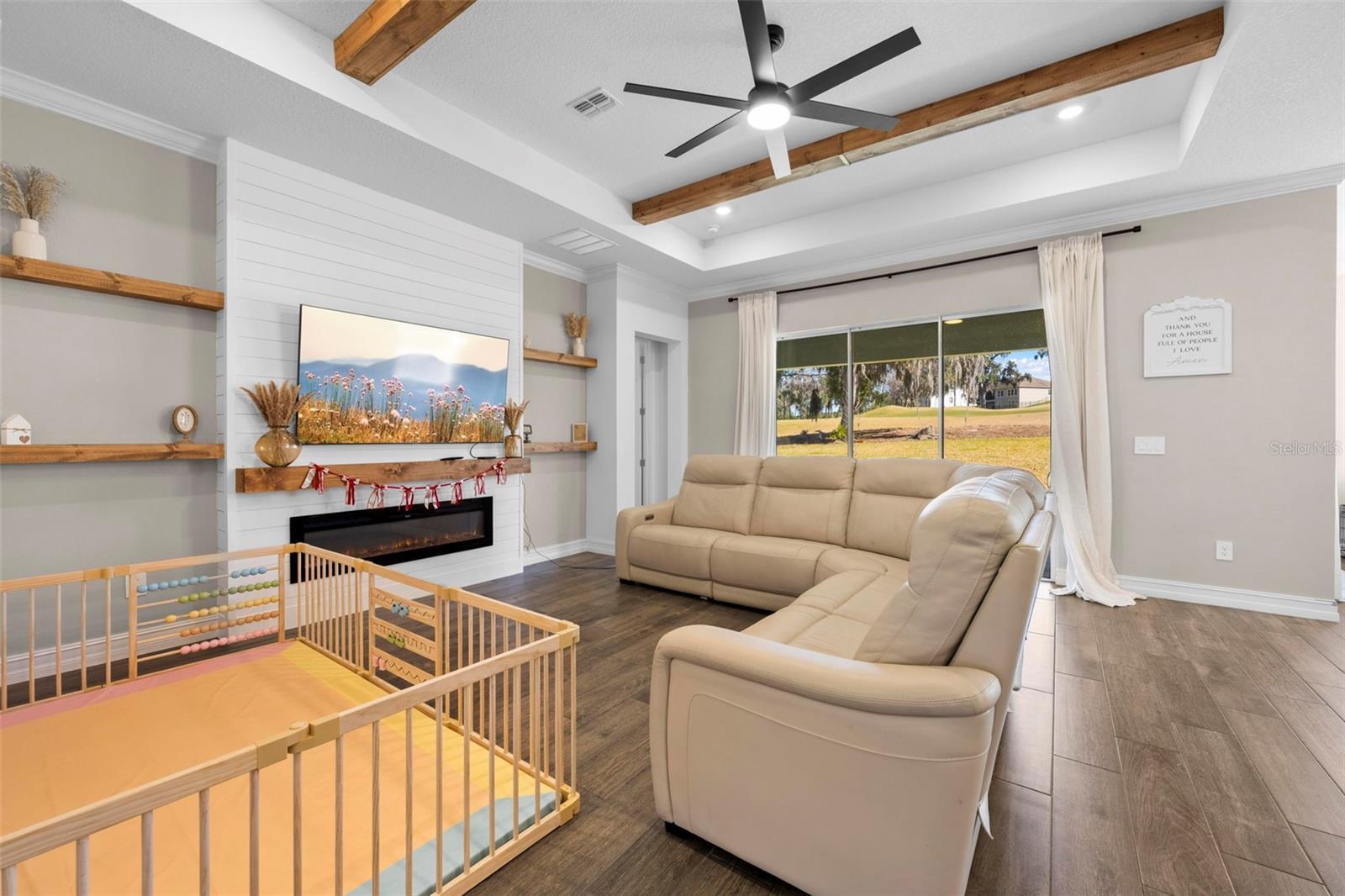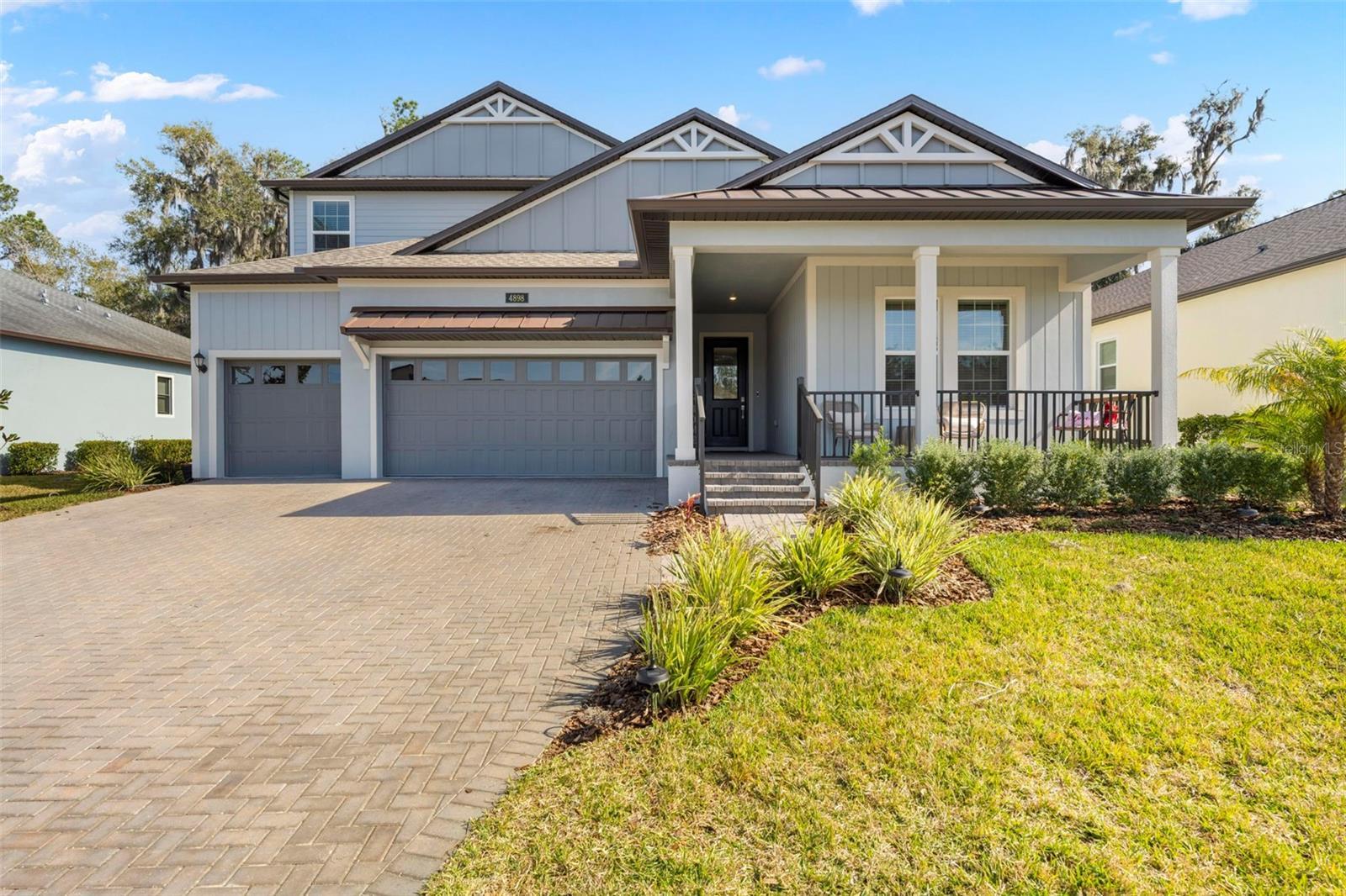 Welcome to this stunning, less than one-year-old executive home located in the prestigious Southern Hills community, a premier luxury golf course neighborhood offering resort-style living near Tampa and a private airport. Perfectly positioned on the golf course, this exceptional 5-bedroom, 4-bath residence combines elegance, space, and modern design ideal for growing families or multigenerational living. Step inside to discover luxury tile flooring throughout the main living areas, soaring ceilings accented by custom wood beams, and a gorgeous open-concept layout designed for both everyday comfort and entertaining. The expansive chef’s kitchen seamlessly opens to the large living room and eat-in dining area, all overlooking breathtaking golf course views. Features include a large walk-in pantry, separate butler’s pantry, and abundant cabinetry and counter space. The oversized owner’s suite is conveniently located on the ground level and serves as a private retreat, complete with a spa-like owner’s bathroom featuring upscale finishes and generous space. Additional bedrooms and bathrooms are thoughtfully designed to accommodate family and guests, while an upstairs living area provides a flexible bonus space perfect for a media room, playroom, or secondary lounge. This top-tier executive home also offers an oversized garage, ample storage throughout, and high-quality construction with modern finishes. A majority of the community development district (CDD) has already been paid, providing added value for the next owner. Located within the luxurious Southern Hills golf community, residents enjoy beautifully maintained surroundings, access to championship golf, and a prime location close to Tampa, shopping, dining, and a nearby private airport. This exceptional property offers the perfect blend of luxury, functionality, and lifestyle in one of the area’s most sought-after communities.