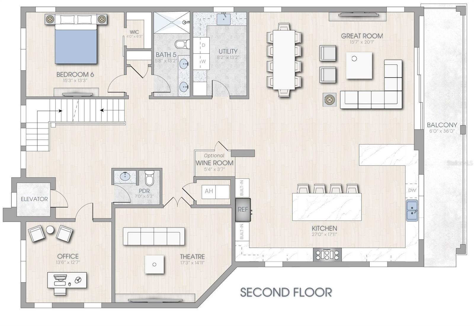 - Built-in Features, Ceiling Fans(s), Elevator, Living Room/Dining Room Combo, Open Floorplan, Stone Counters, Thermostat, Walk-In Closet(s), Wet Bar