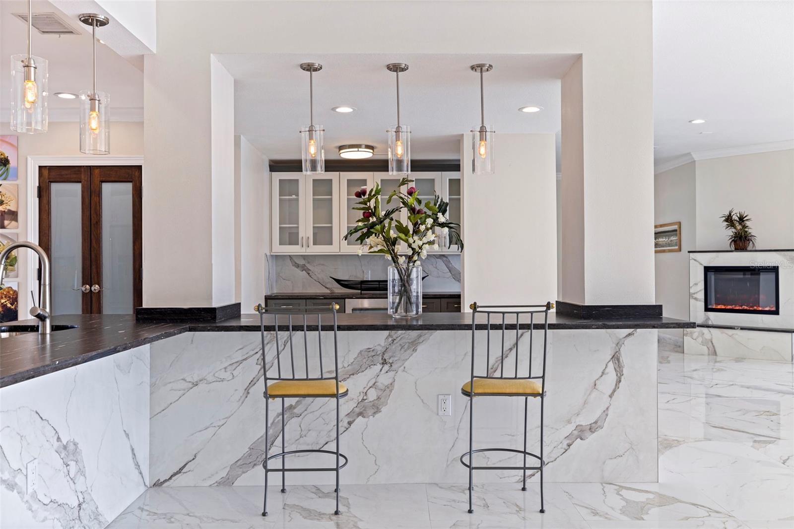 - Built-in Features, Ceiling Fans(s), Crown Molding, Dry Bar, Kitchen/Family Room Combo, Living Room/Dining Room Combo, Open Floorplan, Solid Surface Counters, Split Bedroom, Stone Counters, Thermostat, Walk-In Closet(s)