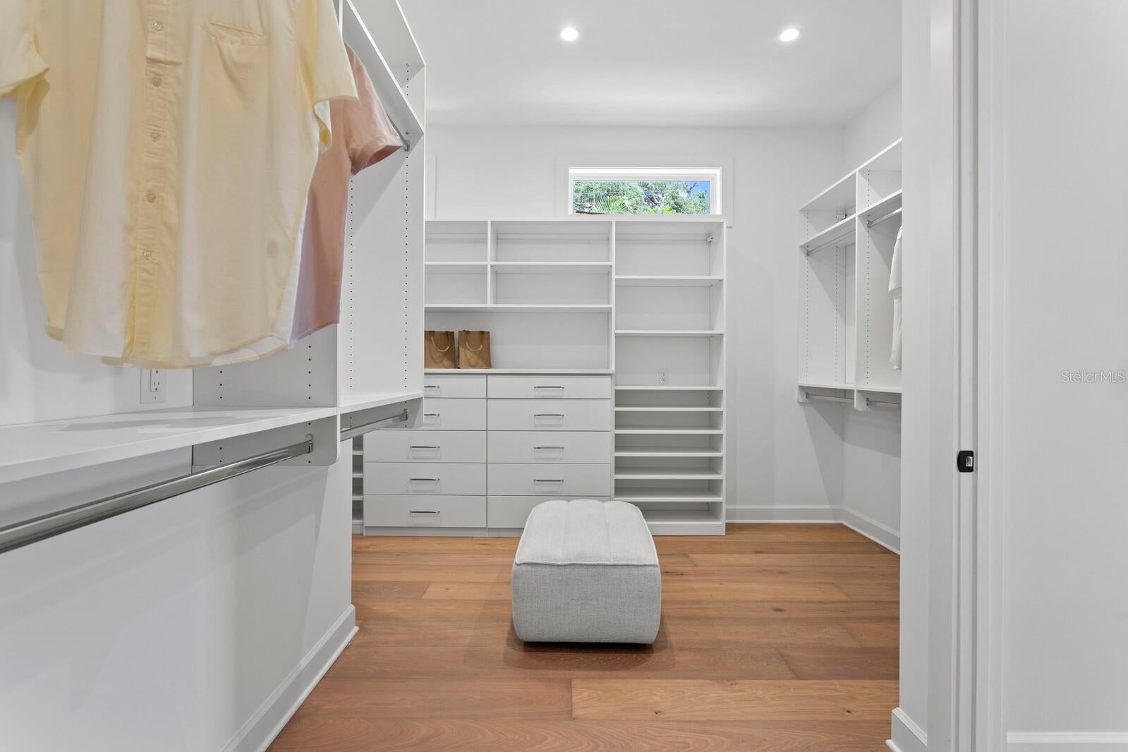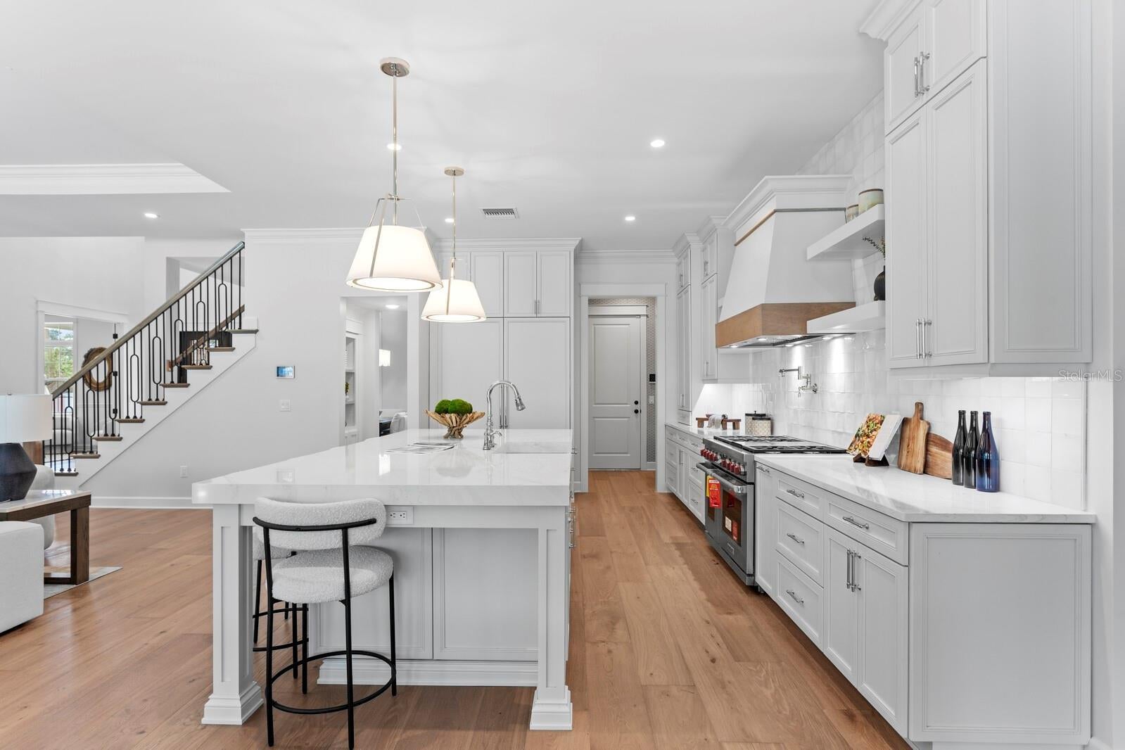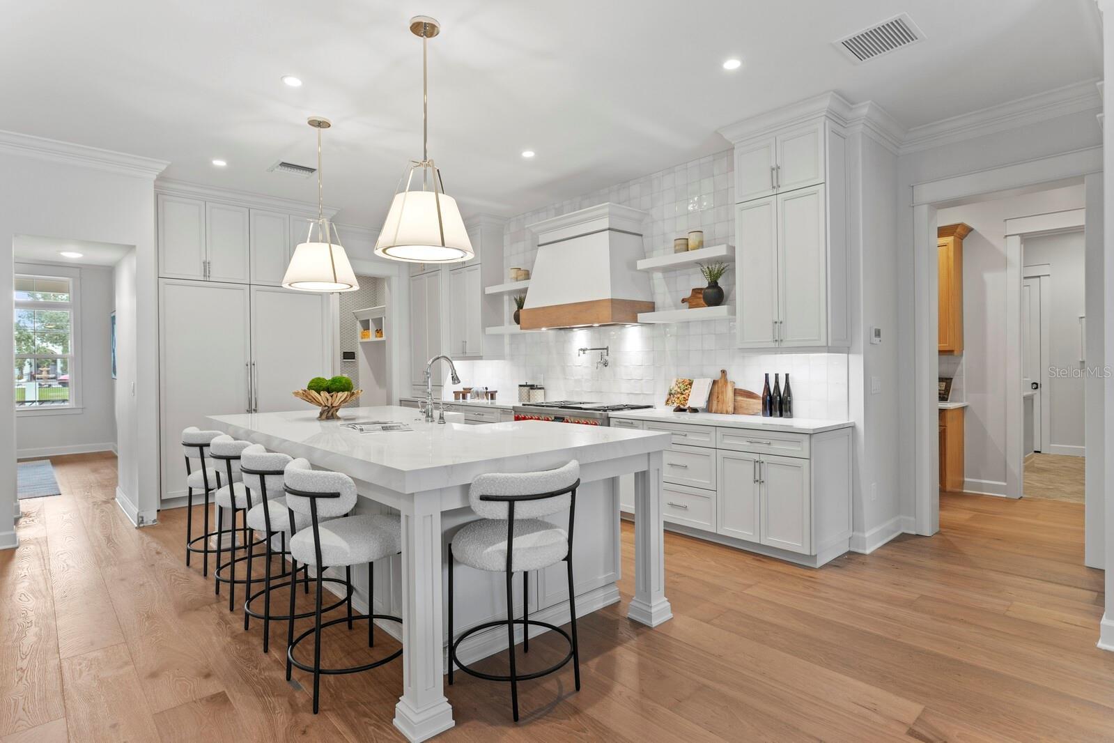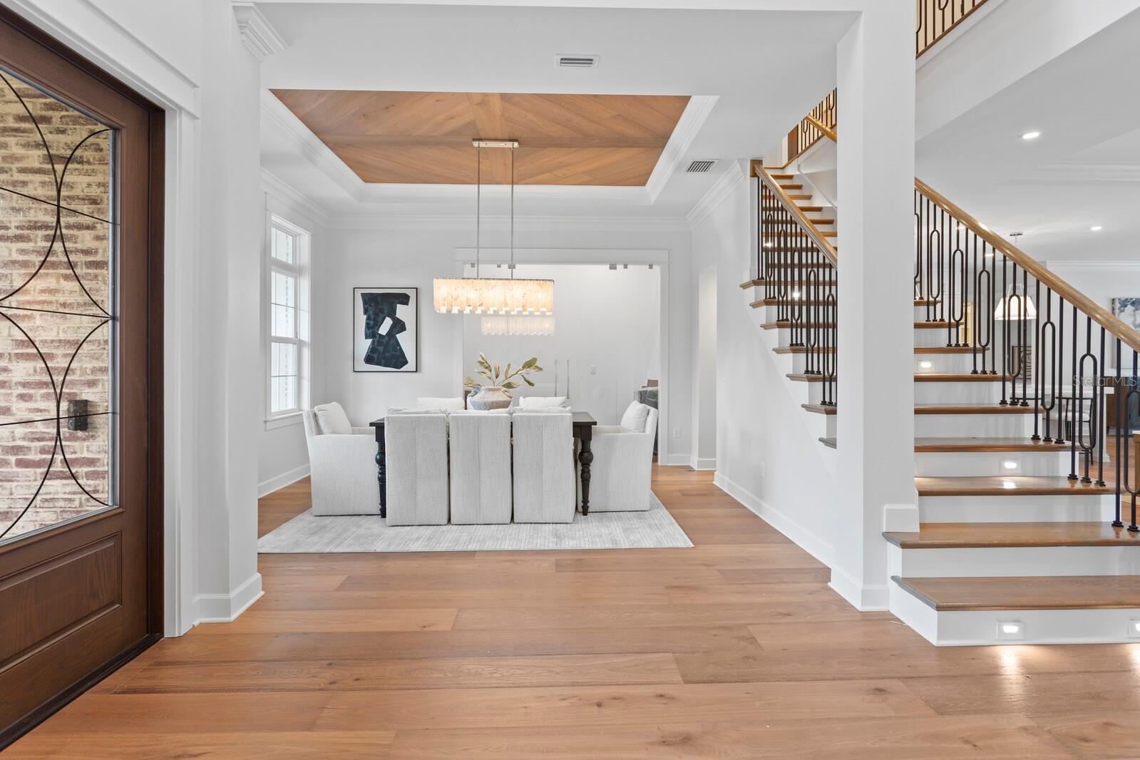 - Built-in Features, Crown Molding, Eat-in Kitchen, High Ceilings, In Wall Pest System, Kitchen/Family Room Combo, Open Floorplan, Primary Bedroom Main Floor, Smart Home, Solid Wood Cabinets, Stone Counters, Thermostat, Tray Ceiling(s), Walk-In Closet(s), Wet Bar