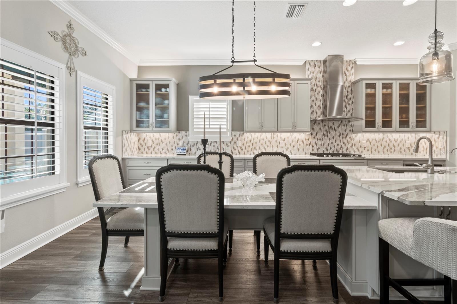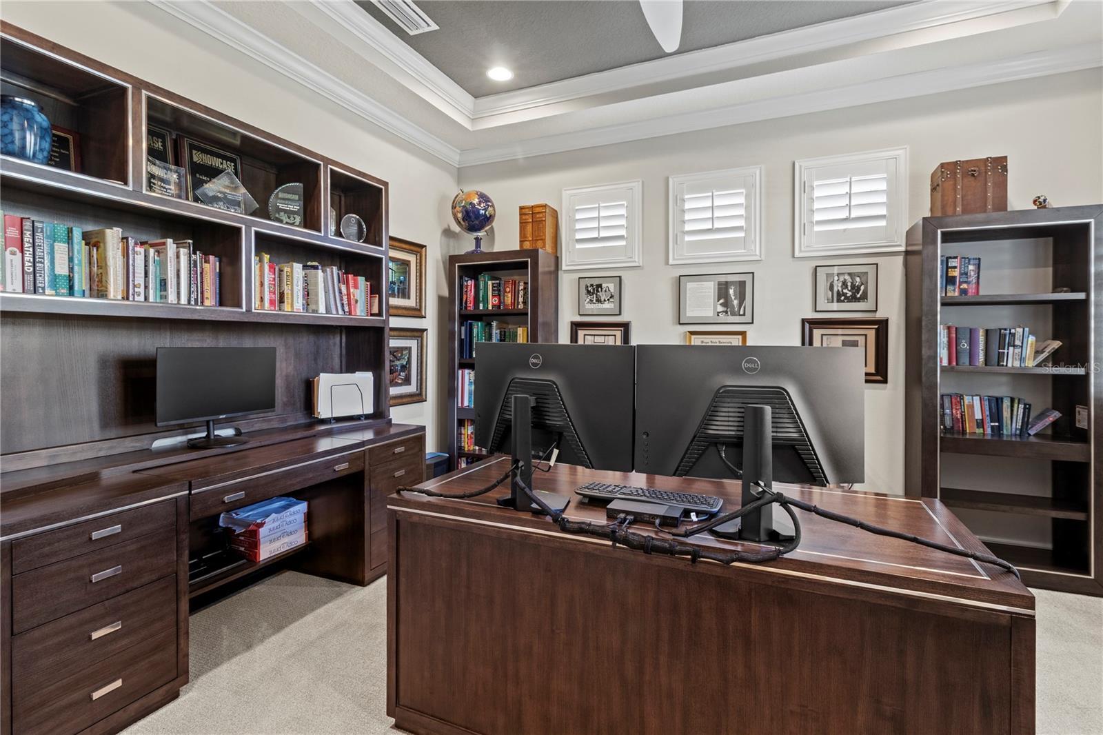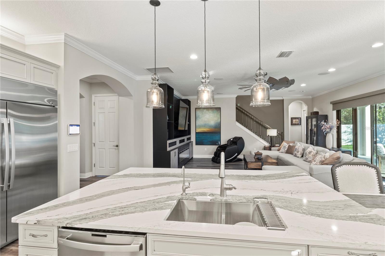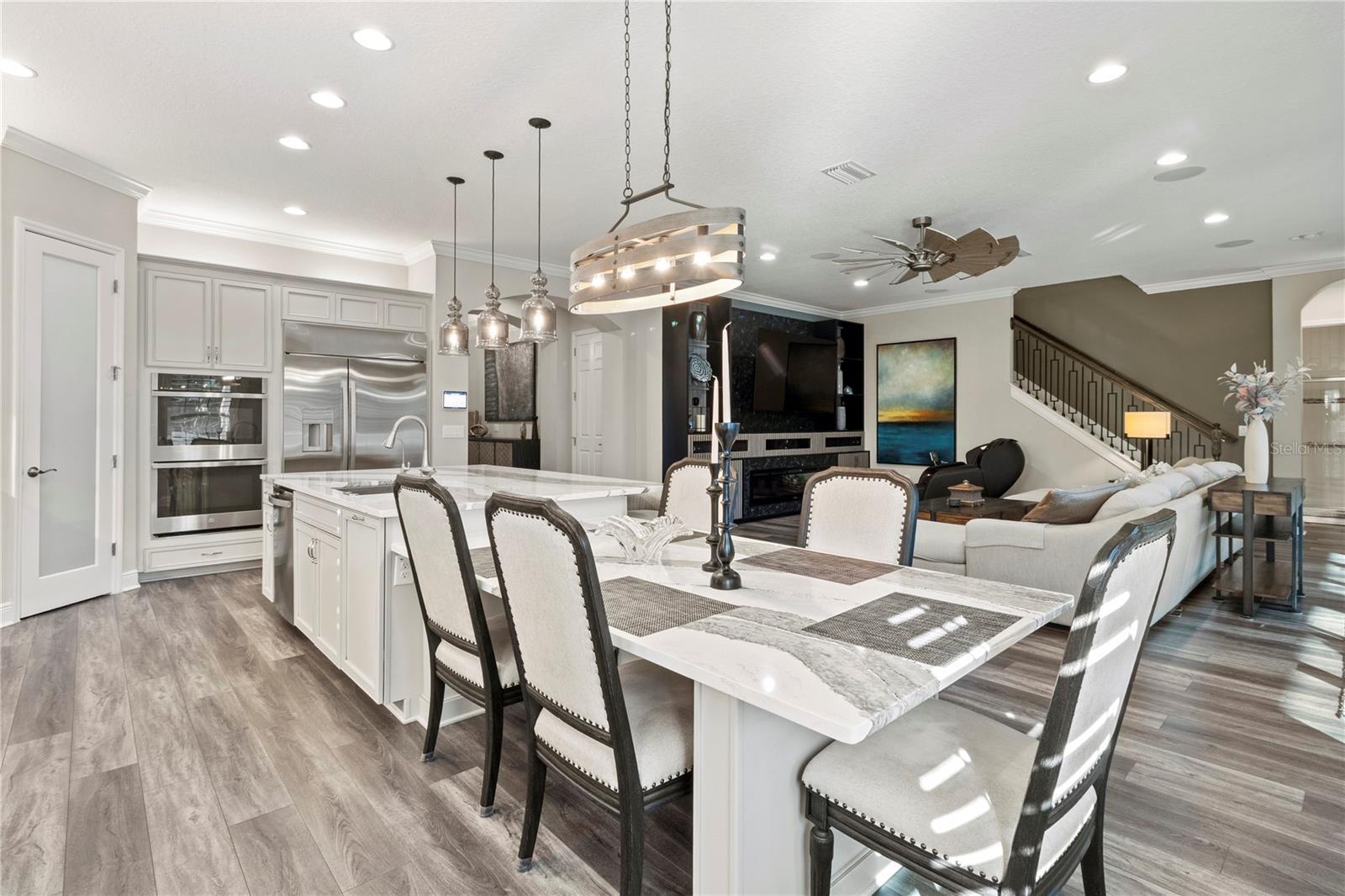- Built-in Features, Ceiling Fans(s), Eat-in Kitchen, High Ceilings, In Wall Pest System, Kitchen/Family Room Combo, Open Floorplan, PrimaryBedroom Upstairs, Solid Surface Counters, Solid Wood Cabinets, Split Bedroom, Stone Counters, Thermostat, Walk-In Closet(s), Window Treatments