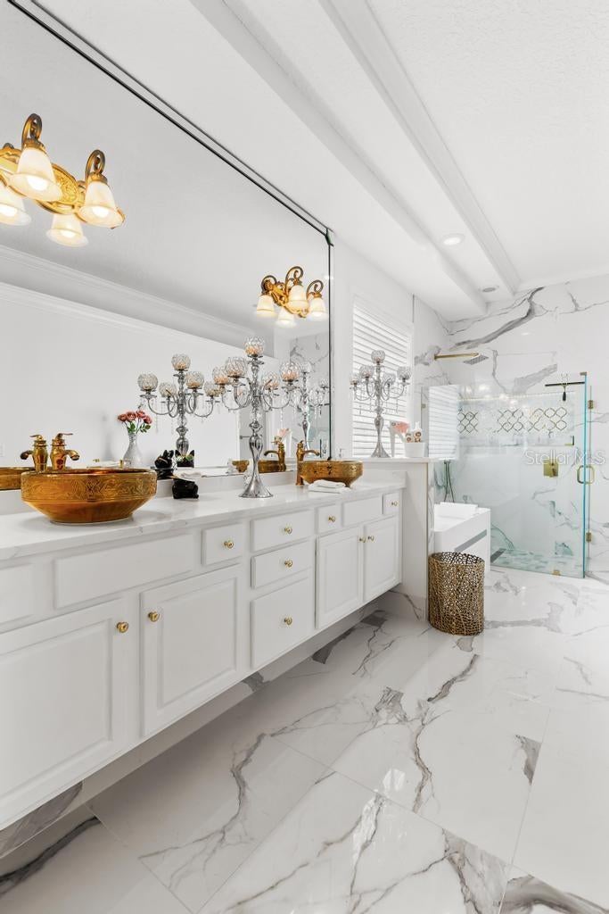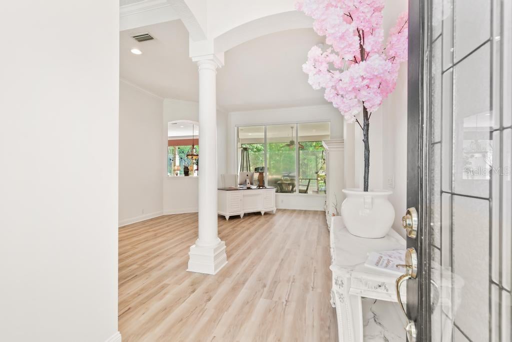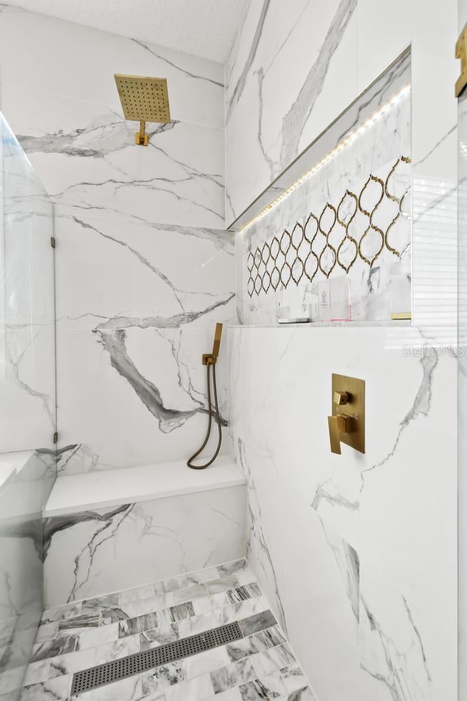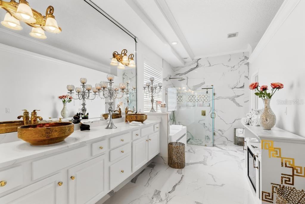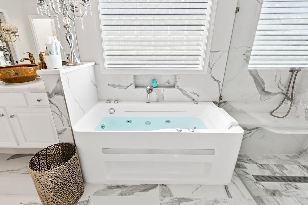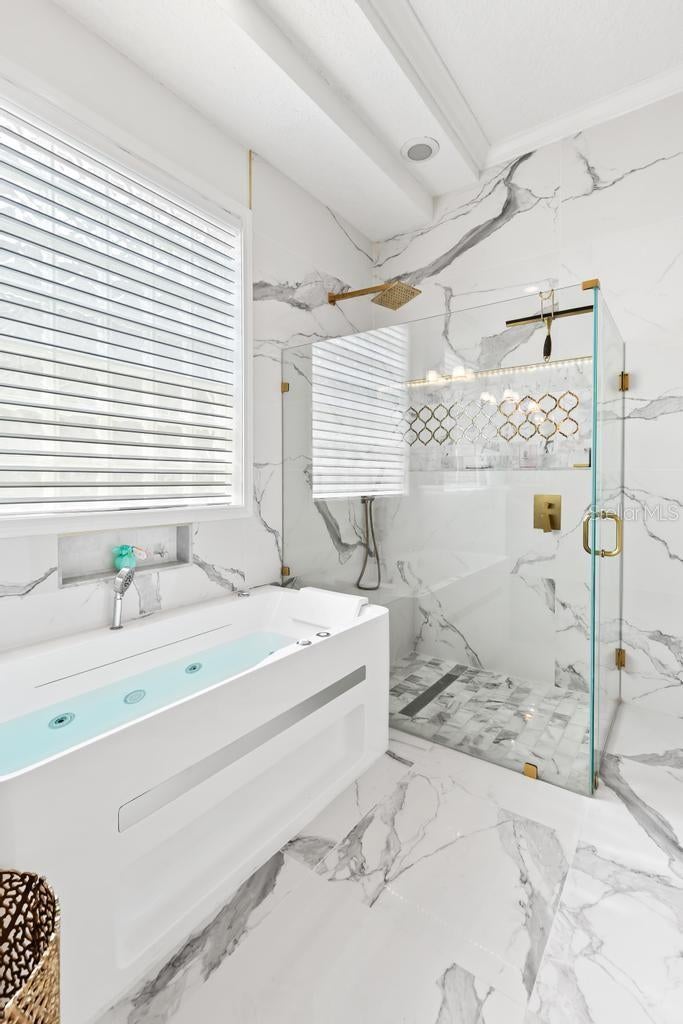 A refined statement of timeless elegance, this exceptional residence offers a beautifully curated blend of luxury, comfort, and modern design within the highly sought-after Hampton Park community. Thoughtfully upgraded throughout, the home features a brand-new roof installed in 2025, delivering both confidence and enduring value. The first-floor primary suite is a true sanctuary, showcasing engineered hardwood flooring, remote-controlled blinds, a custom California Closet system, and a fully reimagined spa-inspired bathroom. Designed for indulgence, the bathroom features a jetted soaking tub illuminated by LED lighting, a frameless glass shower with porcelain tile and marble pan, quartz vanities, and striking designer tile accents—creating a serene, resort-like experience. At the heart of the home lies a stunning chef’s kitchen, masterfully appointed with a custom Calacatta quartz island, soft-close cabinetry, classic subway tile backsplash, a gold farmhouse sink with coordinating fixtures, LED-integrated lighting, and elegant gold-accented outlets. This beautiful space is ideal for both elevated entertaining and everyday culinary enjoyment. Luxury vinyl plank flooring flows seamlessly through the main living areas, staircase, and second-floor hallway, enhancing the home’s cohesive design. Formal living and dining spaces are accented by fresh designer paint and custom window treatments, while the inviting family room is anchored by a dramatic marble-accented fireplace and upgraded lighting fixtures. Recent enhancements include a three-zone HVAC system providing refined climate control throughout the home. Secondary bedrooms on the upper levels feature custom closets and upscale finishes, while the private third-floor suite offers remarkable versatility—perfect as an executive office, media lounge, or exclusive guest retreat. Outdoor living is equally inviting, with a patio featuring a built-in grill—ideal for alfresco entertaining or tranquil evenings at home. Washer and dryer are negotiable; seller’s refrigerator does not convey. Ideally positioned near top-rated schools, premier shopping and dining, and major commuter routes, this turnkey residence delivers an exceptional lifestyle defined by luxury, convenience, and thoughtful craftsmanship. A rare opportunity to own a meticulously renovated home in one of Jacksonville’s most desirable communities.