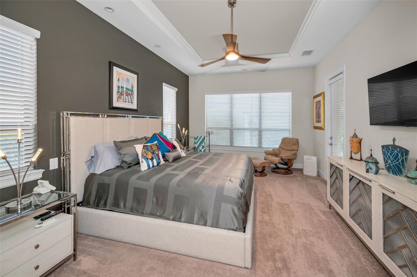 Welcome to the exclusive, gated community of Champions Club, where a true sense of community meets refined living. This spectacular custom-built Arthur Rutenberg home offers striking contemporary design and exceptional craftsmanship throughout. A pavered driveway, sidewalks, and walkways lead to elegant double front doors with metal and glass inserts. Upon entering, the foyer impresses with an inlaid patterned tile floor. The formal dining room features a dry bar with wine cooler and a built-in niche, complemented by a tray ceiling with double crown molding. The expansive great room showcases espresso-stained ceiling beams, creating a sleek architectural statement. A feature wall with an electric fireplace provides the perfect backdrop for a wall-mounted TV, while a display niche highlights artwork and collectibles. A full wall of stackable sliding glass doors opens to the lanai and private backyard, enhanced by motorized shades on the sliders and breakfast nook windows. The chef’s kitchen is a dream, featuring espresso-colored soft-close cabinetry, quartz countertops, and an oversized island with seating for four. Designer LED pendant lighting and a contemporary breakfast nook fixture complete the space. Top-of-the-line stainless steel appliances include a five-burner gas cooktop, built-in oven, Advantium convection/microwave, French-door refrigerator, and built-in dishwasher. The oversized primary suite offers two custom-designed walk-in closets, a tray ceiling with double crown molding, and large picture windows overlooking the backyard. A French door leads directly to the lanai. The spa-inspired primary bath features dual quartz vanities with abundant storage, a glass-enclosed shower with dual shower jets and built-in bench, a luxurious soaking tub, private water closet, and linen closet. Two guest bedrooms with walk-in closets and a guest bath are located on a private hallway. A fourth oversized bedroom with pool bath at the rear of the home creates an ideal in-law suite. A fifth bedroom or den off the foyer provides a quiet home office or flex space. The covered and screened lanai is an entertainer’s paradise, complete with travertine decking and a full outdoor cook center featuring a gas grill, built-in sink, stainless dual-fan exhaust hood, refrigerator, storage cabinetry, and a custom art sculpture that conveys with the home. Additional highlights include a spacious walk-in pantry, an inside laundry room with built-in cabinetry, granite countertops, and laundry tub. The three-car garage is fully upgraded with epoxy flooring, EV charger, water softener, and a split HVAC system for heating and cooling. The home also features double-pane energy-efficient windows with storable hurricane shutters, upgraded LED lighting and ceiling fans throughout, a security system, and reclaimed water for irrigation. Champions Club residents enjoy exclusive amenities including an Olympic-size pool, hot tub, tennis and pickleball courts, fitness center, and a clubhouse available for private events.