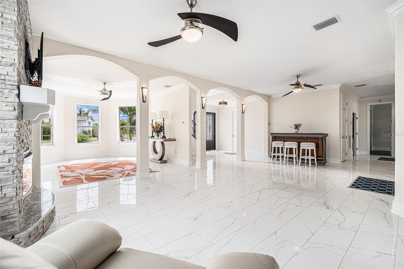 Experience the ultimate Coastal Florida lifestyle in this exceptional 4,000+ sq ft pool home, perfectly positioned on a large, private lot in Gulf Harbors with views of the Robert Crown Preserve and St. Andrews Creek. Surrounded by nature and water, this home offers space, privacy, and resort-style living. The lower level is ideal for flexible living and entertaining, featuring a massive great room/flex space with a fireplace, a fourth bedroom, and a full bathroom—perfect for guests, multigenerational living, or a home theater or game room. Upstairs, the home opens to a light-filled open floor plan designed for coastal living. The living and dining areas flow seamlessly into a high-end kitchen complete with a large island and stainless steel appliances—perfect for hosting after a day on the water. The split-bedroom layout provides privacy, with two bedrooms and a full bath on one side, while the luxurious primary suite feels like a private retreat, offering a stunning spa-style bathroom, dual walk-in closets, and private access to one of the expansive screened patios. Step outside and enjoy true Florida outdoor living. The beautifully landscaped lot offers peaceful preserve views, a huge heated saltwater pool, and two oversized screened-in patios, ideal for morning coffee, sunset cocktails, or entertaining year-round. Located in the sought-after Gulf Harbors community, residents enjoy access to tennis courts, a community pool, a boat launch, and optional beach club and yacht club memberships—bringing boating, beach days, and an active waterfront lifestyle right to your doorstep. This is a rare opportunity to own a spacious, private, amenity-rich home in one of New Port Richey’s premier coastal communities—where everyday life feels like a vacation.