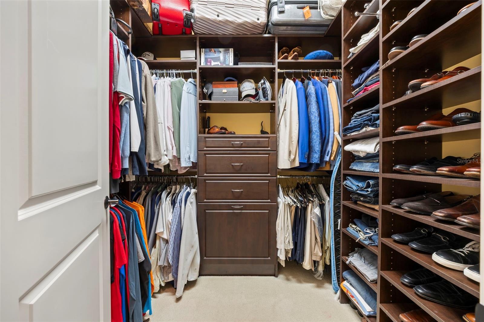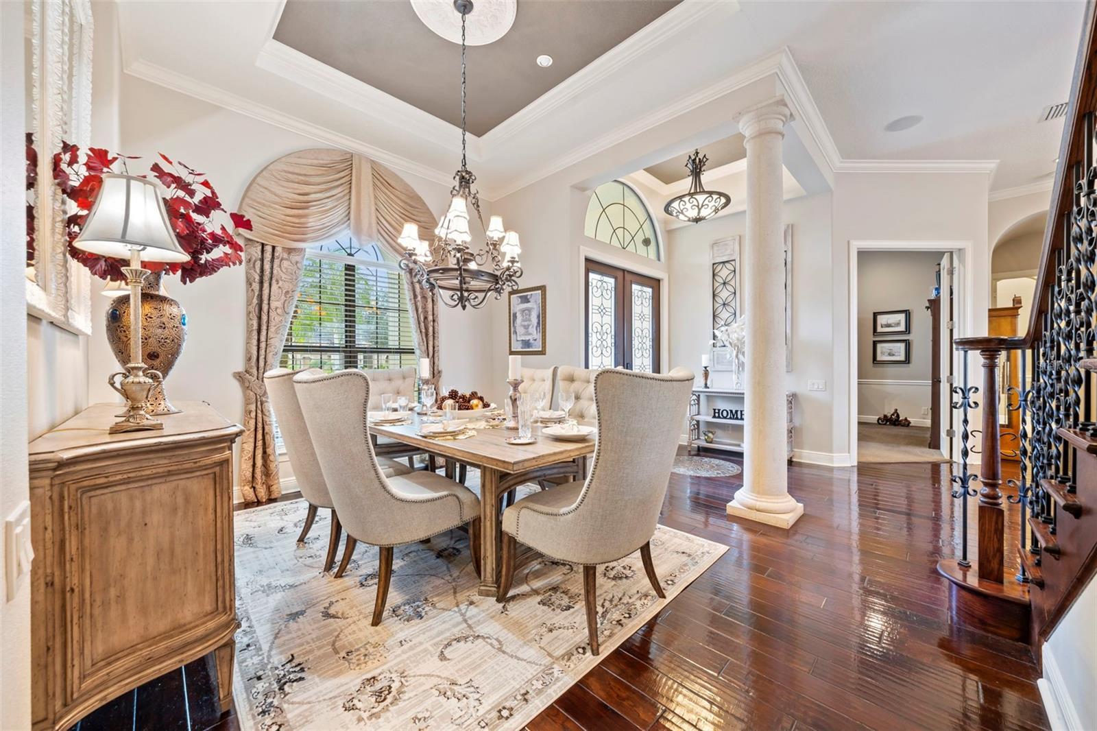 - Built-in Features, Ceiling Fans(s), Coffered Ceiling(s), Crown Molding, Eat-in Kitchen, High Ceilings, Kitchen/Family Room Combo, L Dining, Open Floorplan, Primary Bedroom Main Floor, Smart Home, Solid Wood Cabinets, Split Bedroom, Stone Counters, Tray Ceiling(s), Walk-In Closet(s)