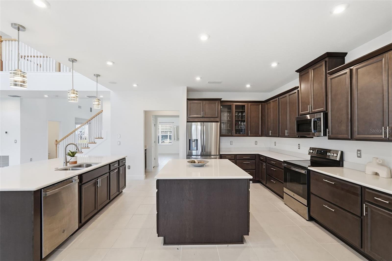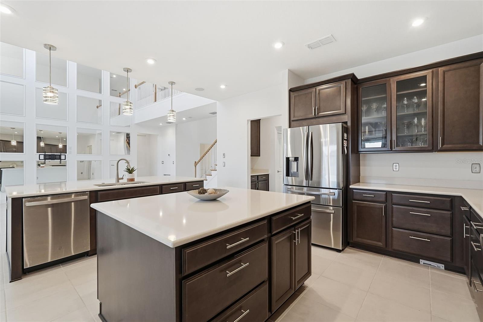 - Ceiling Fans(s), Central Vaccum, Crown Molding, Eat-in Kitchen, High Ceilings, Kitchen/Family Room Combo, Living Room/Dining Room Combo, Primary Bedroom Main Floor, PrimaryBedroom Upstairs, Solid Surface Counters, Solid Wood Cabinets, Thermostat, Tray Ceiling(s), Vaulted Ceiling(s), Walk-In Closet(s), Window Treatments