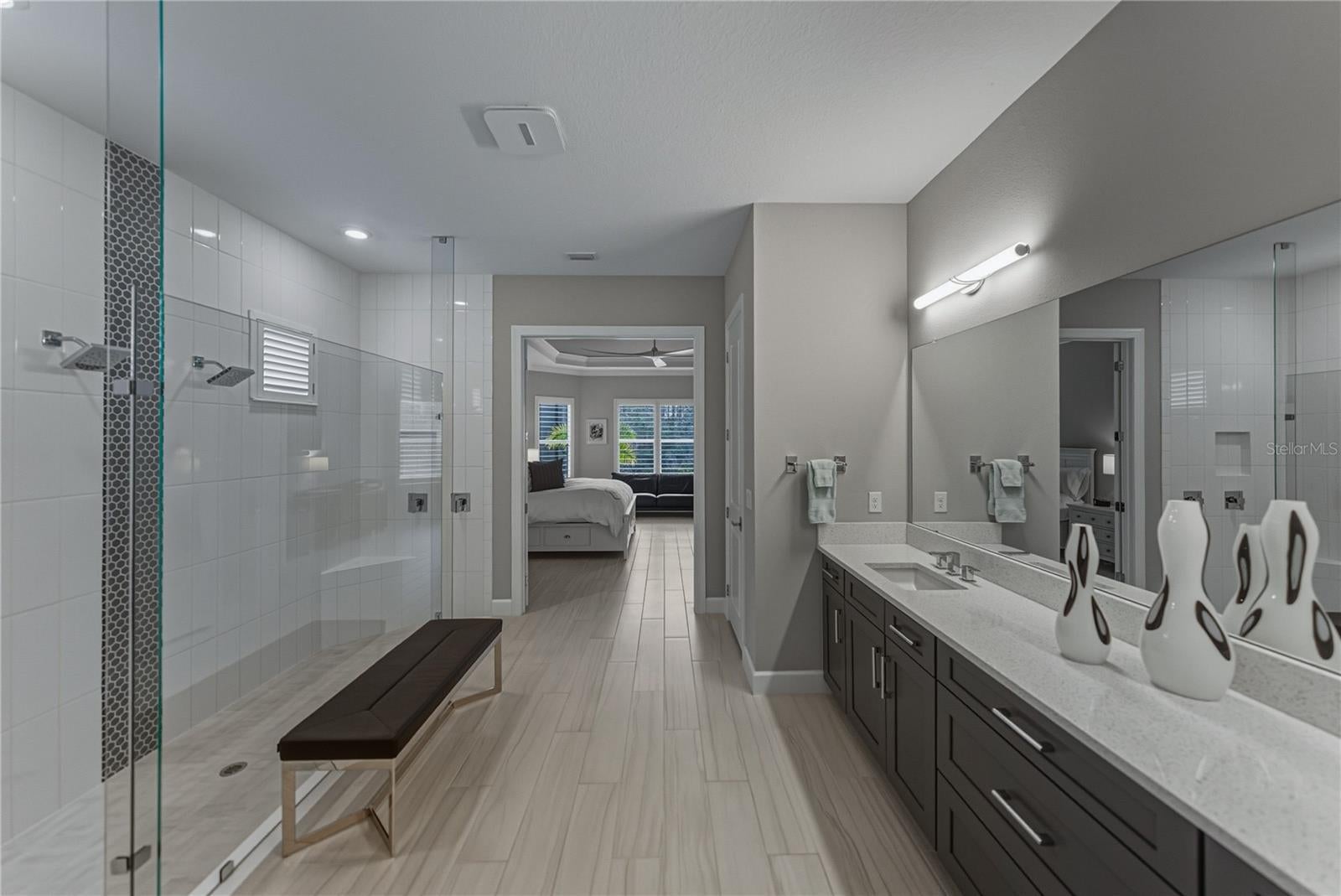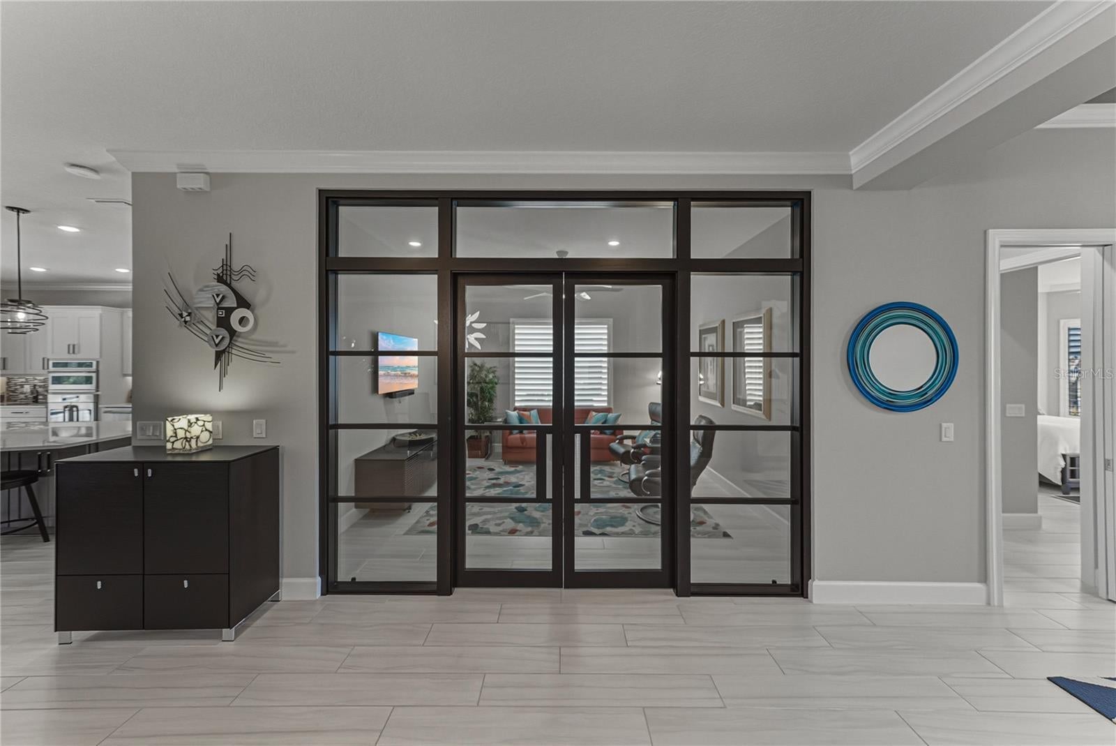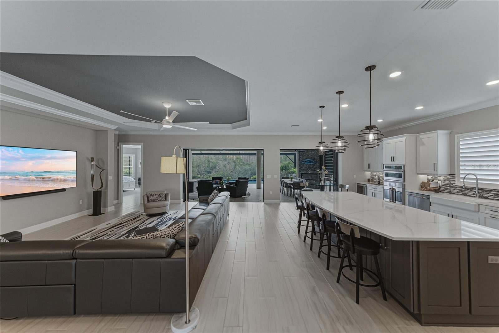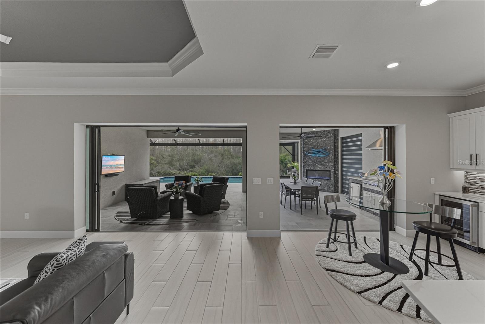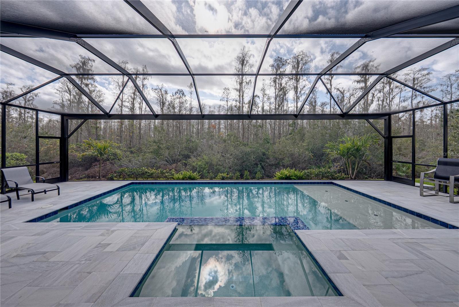 Under contract-accepting backup offers. Luxurious custom upgrades are put into this Taylor Morrison built home. Located on a conservation lot, tucked away, in Esplanade of Wiregrass, makes it a private retreat. This stunning residence offers the ultimate in privacy, luxury, with thoughtful design. Step inside foyer to soaring tray ceilings with custom Brazilian mahogany glass doors, beautifully designed tile flooring, and striking custom lighting. This spacious three bedroom home boast three full baths, a versatile flex space, bonus room or dedicated office/den and formal dining. The property blends elegance and comfort while bringing the outdoors in with the double pocket sliding glass doors that lead you to the pool. The heart of the home features a gourmet kitchen with sleek quartz countertops, top-tier cabinetry with under mount lighting, pull outs and soft close drawers, huge island 10x5, Cafe and Monogram Appliances, a walk-in pantry along with designer finishes throughout. The kitchen has an additional four feet making this homes living space seamless and providing an intimate dining area. The additional room ideal for an office no detail was left unturned in this custom Brazilian mahogany glass wall. When the doors open they fold perfect to the transom windows and hold sound very well. The pampering owner’s suite with tray ceiling and push out bay windows is a true retreat with custom walk-in closet, a spa-like bath including an oversized walk-in shower and custom vanities that elevate everyday living. The second bedroom enjoys en suite bath and walk-in closet. This is perfect for visitors. The third bedroom in the front of the property is over sized with the large bay window push out. Function meets style in the expansive laundry room with cabinets, sink and drop zone. This extra large mudroom space is just off the generous 2-car garage with an extra four foot in length and width, measuring 25x25. Equipped with a 220 outlet for electric cars. Step outside to your private oasis—a sprawling screened lanai with pool, spa, elegant marble deck, outdoor grill, custom hood, gleaming granite refrigerator, fireplace, dining and living areas. The custom pool with sun shelf and spa are all perfectly framed with a 50 foot picture window screen with unobstructed serene conservation views. This exceptional property offers peace, privacy, and a truly elevated lifestyle. Don’t miss your opportunity to own a custom-crafted masterpiece in one of the most desirable settings available. Enjoy the clubhouse with an on-site café, swimming pools, fitness center, game room, walking trails, dog park, pickle ball and tennis. The best of Wesley Chapel Wiregrass Location featuring twenty golf courses with 30 mins, the best restaurants, wonderful shopping, 3 hospitals, salons, and much much more. Irrigation water is reclaimed.