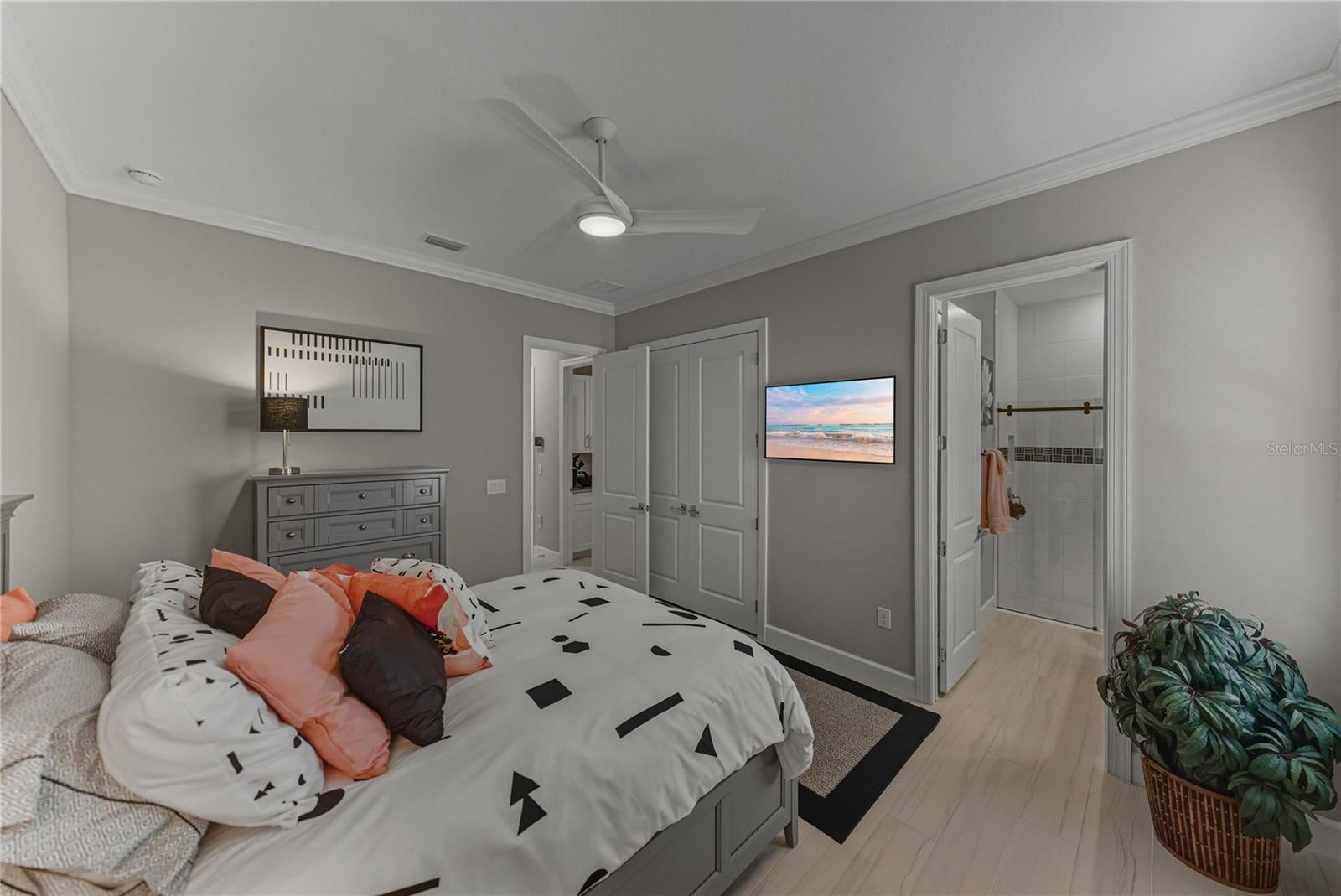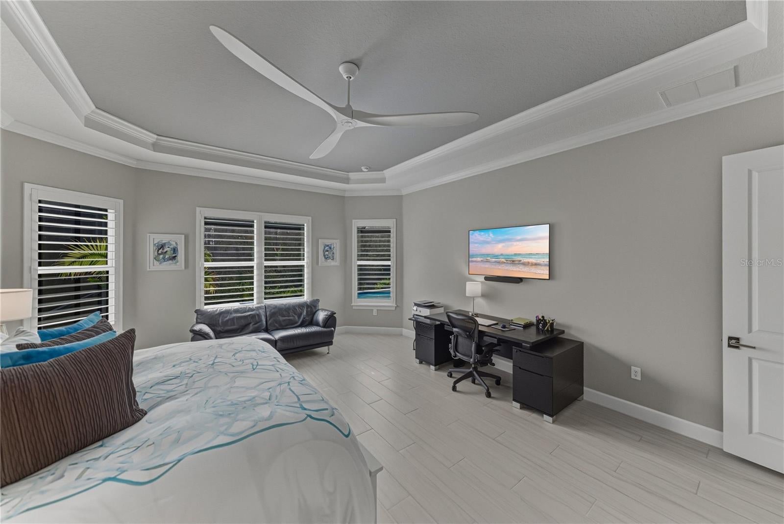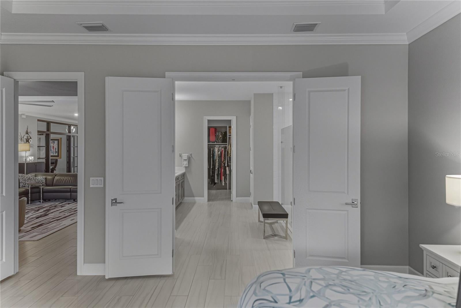 - Crown Molding, Eat-in Kitchen, High Ceilings, Kitchen/Family Room Combo, Open Floorplan, Primary Bedroom Main Floor, Smart Home, Solid Wood Cabinets, Split Bedroom, Stone Counters, Thermostat, Tray Ceiling(s), Walk-In Closet(s), Window Treatments