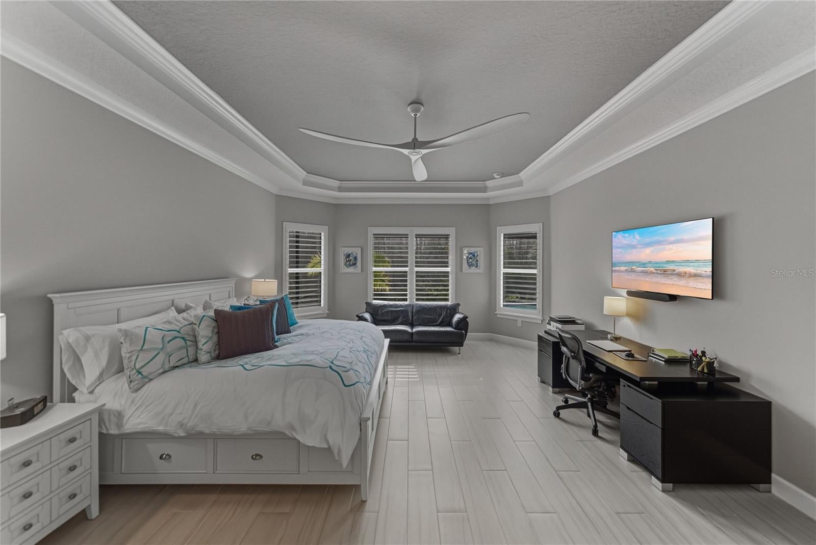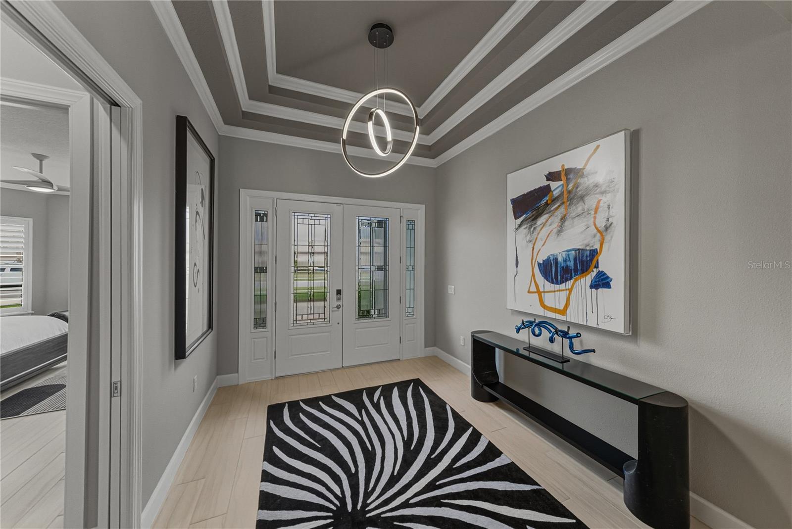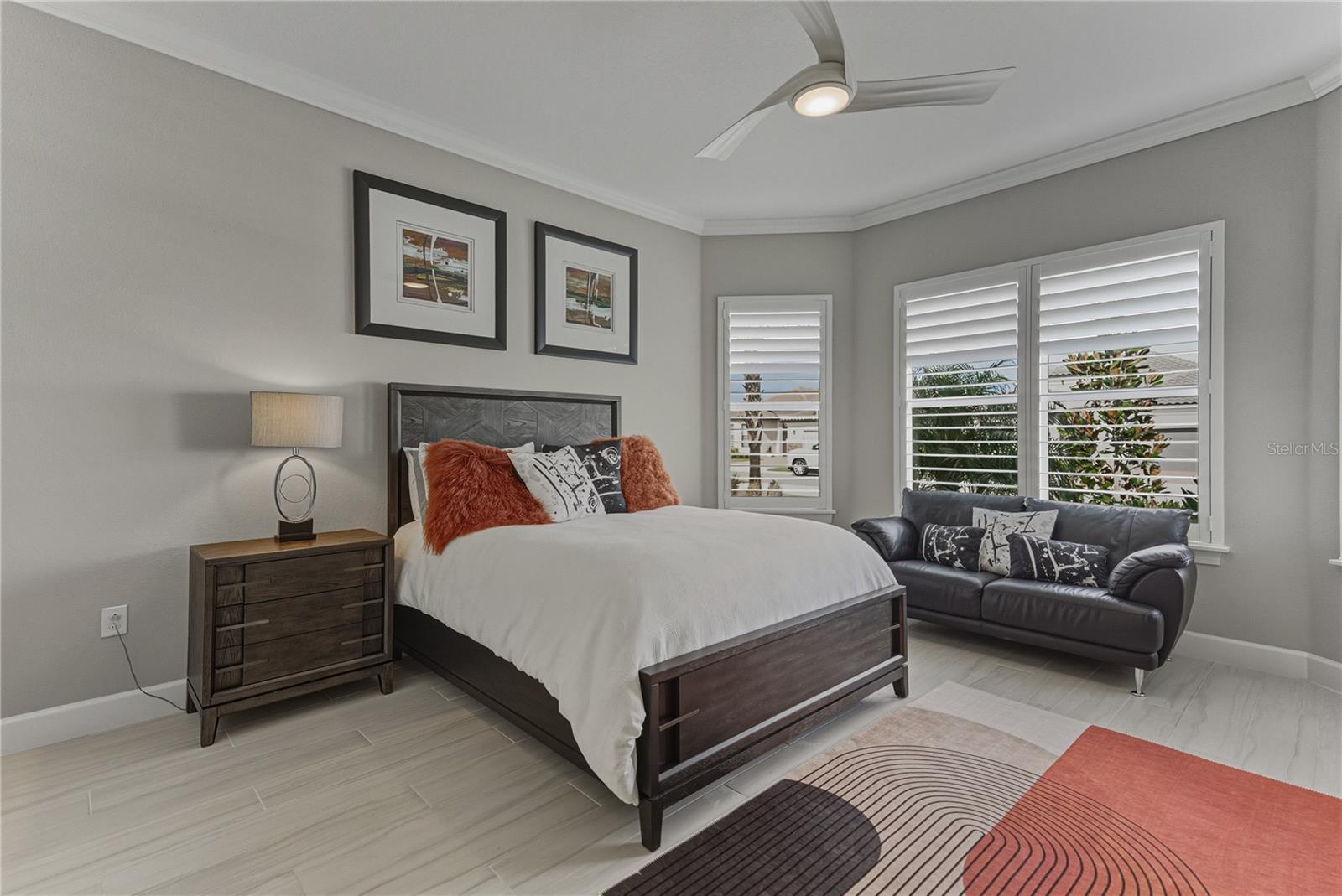 - Crown Molding, Eat-in Kitchen, High Ceilings, Kitchen/Family Room Combo, Open Floorplan, Primary Bedroom Main Floor, Smart Home, Solid Wood Cabinets, Split Bedroom, Stone Counters, Thermostat, Tray Ceiling(s), Walk-In Closet(s), Window Treatments