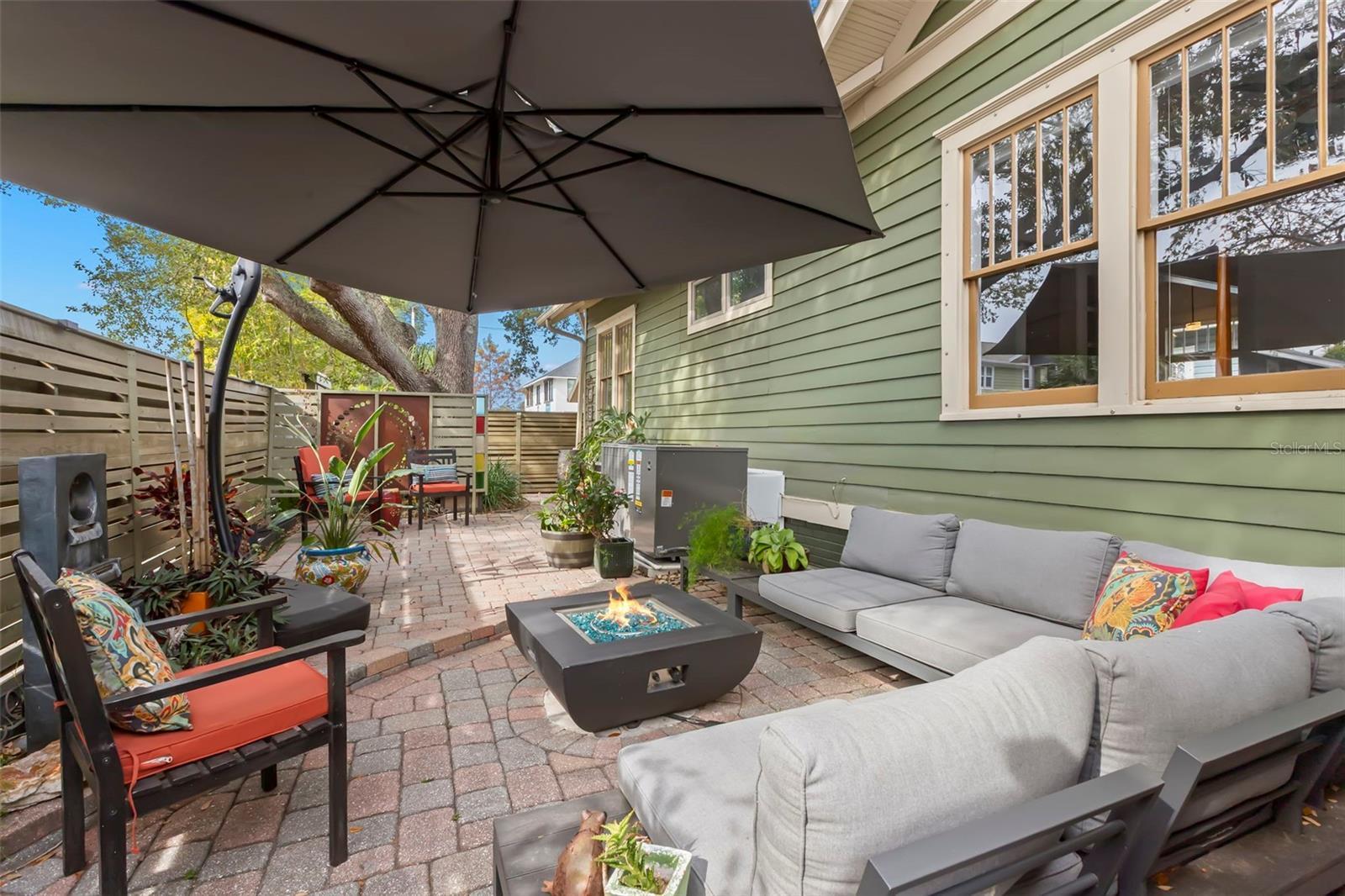 - Awning(s), Fire Pit, Lighting, Rain Barrel/Cistern(s), Rain Gutters, Sidewalk