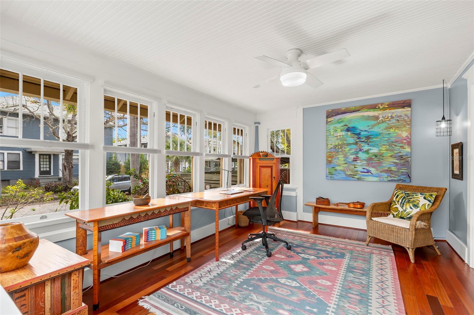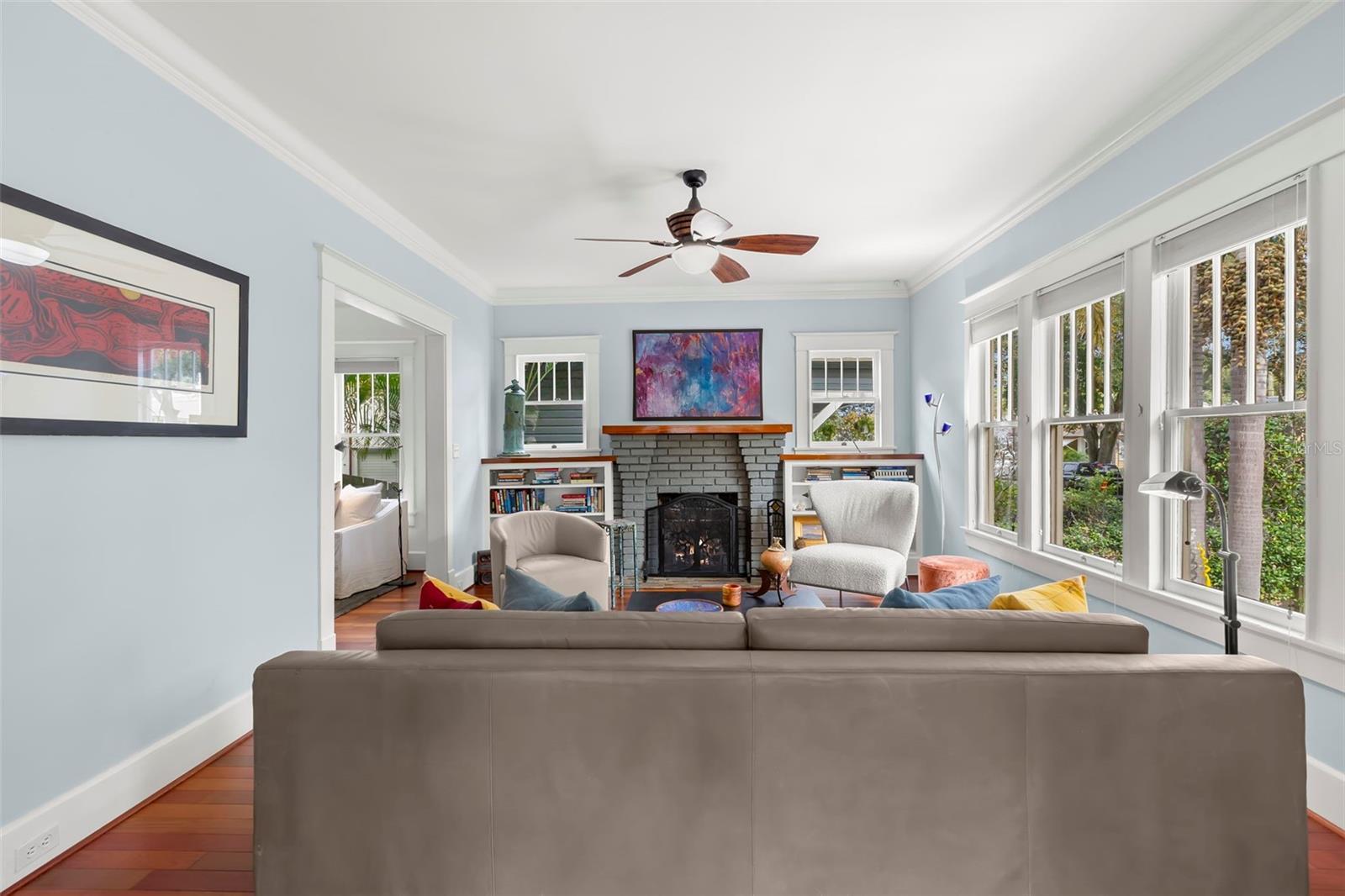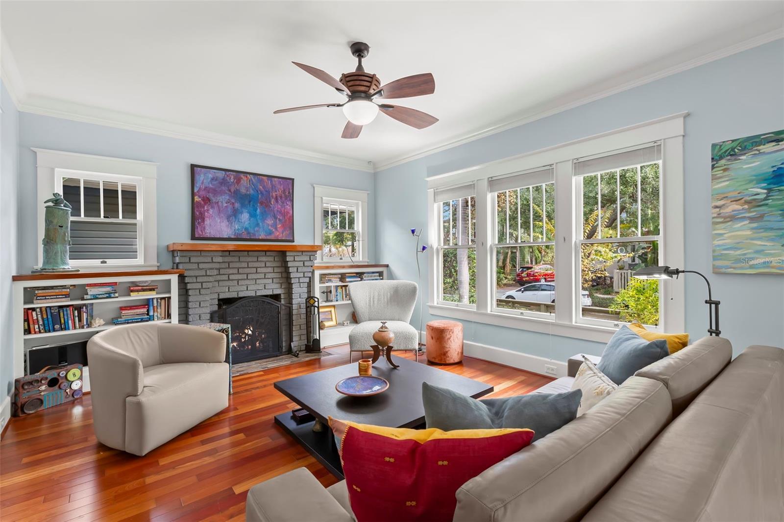 Under contract-accepting backup offers. Charming 1925 Craftsman bungalow situated on a corner lot just steps to 4th Street and downtown! This 2 bed/2 full bath, 1359 sq/ft home has been lovingly restored with recent updates to include a new roof, A/C and interior painting in 2025. The fenced exterior with lush landscaping and botanical gardens features multiple sitting areas with pavers and stones to create the perfect sanctuary for entertaining or relaxation! The exterior paint color is true to the era of the home and a well appointed nod to the 1920's. Greet your guests in the welcoming sunny sitting room and home office with lots of natural light. Continue on in the living room, which has a beautiful original fireplace with built-ins that opens to the dining room and kitchen for casual entertaining. The kitchen boasts stainless steel appliances featuring a gas range, granite countertops, custom cabinets and a built-in desk nook. The primary bedroom is spacious with highlights to include a large walk-in closet, an updated bathroom with marble flooring/vanity and walk-in shower. The second bedroom features a murphy bed/desk combo with a hall bath that has also been updated with new flooring and modern glass shower doors. Plenty of off street parking in the detached garage or on the parking pad behind for 2 cars. Additional garage features include lots of storage cabinets, attic with cargo lift, epoxy floors, a wall unit to heat and cool should someone desire an art studio, gym or home office. Other features include Brazilian cherry hardwood floors, 5 panel solid craftsman doors, 9 ' ceilings, crown molding, inside laundry, sprinkler system on a private well, security cameras and a gas/tankless water heater. Located outside the flood zone you will be sure to have peace of mind when storms approach. Schedule a private showing today to see one of Old Northeast charming bungalows!