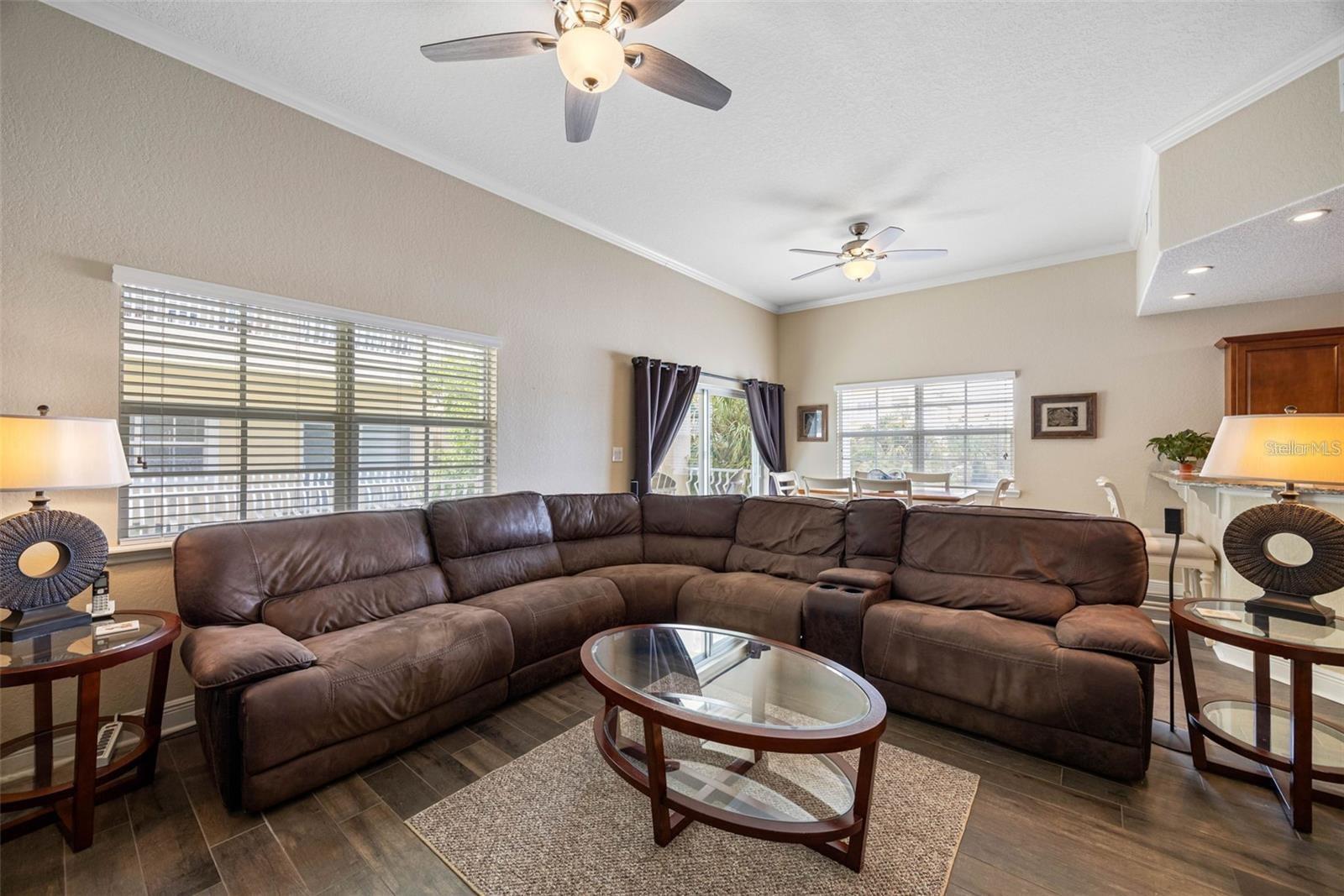 - Ceiling Fans(s), Crown Molding, Eat-in Kitchen, Elevator, High Ceilings, Kitchen/Family Room Combo, PrimaryBedroom Upstairs, Solid Surface Counters, Wet Bar