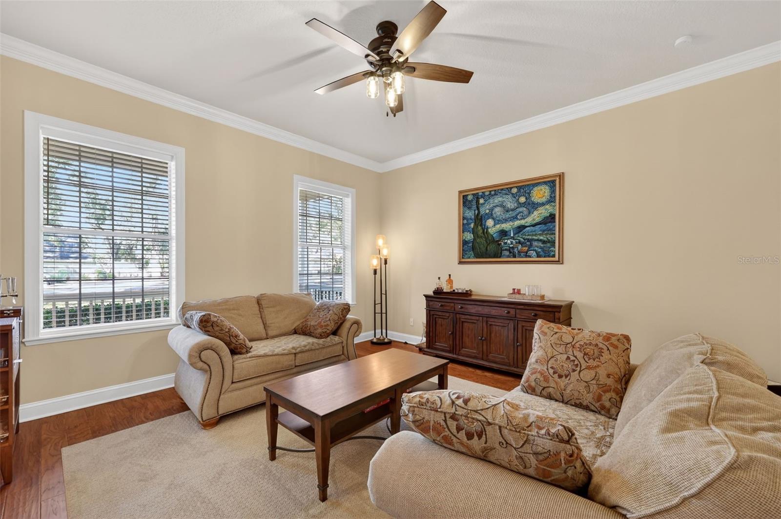 - Attic Ventilator, Ceiling Fans(s), Crown Molding, Eat-in Kitchen, High Ceilings, Kitchen/Family Room Combo, Primary Bedroom Main Floor, Solid Wood Cabinets, Split Bedroom, Stone Counters, Walk-In Closet(s), Window Treatments