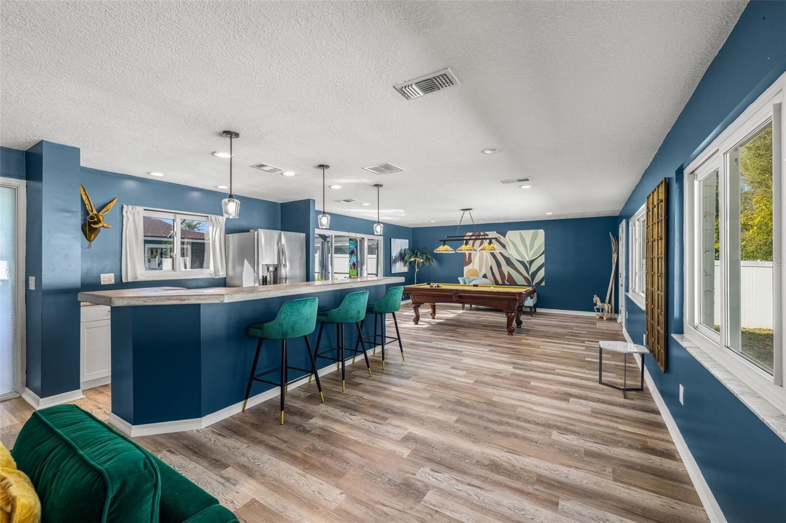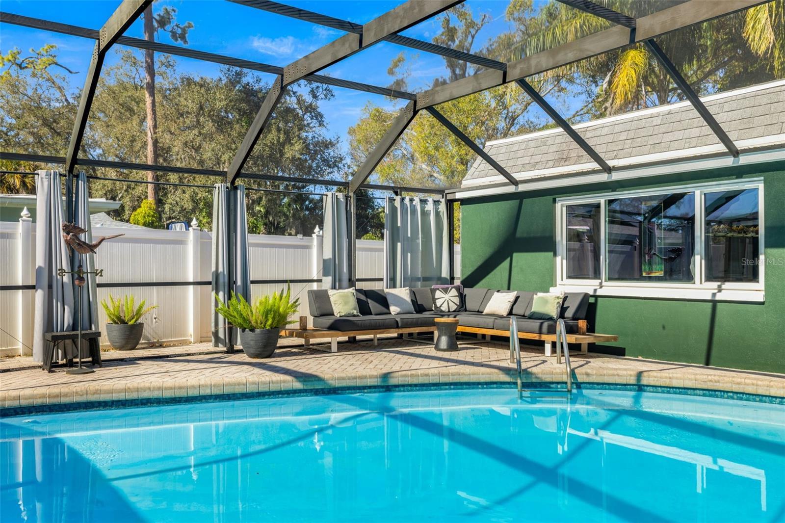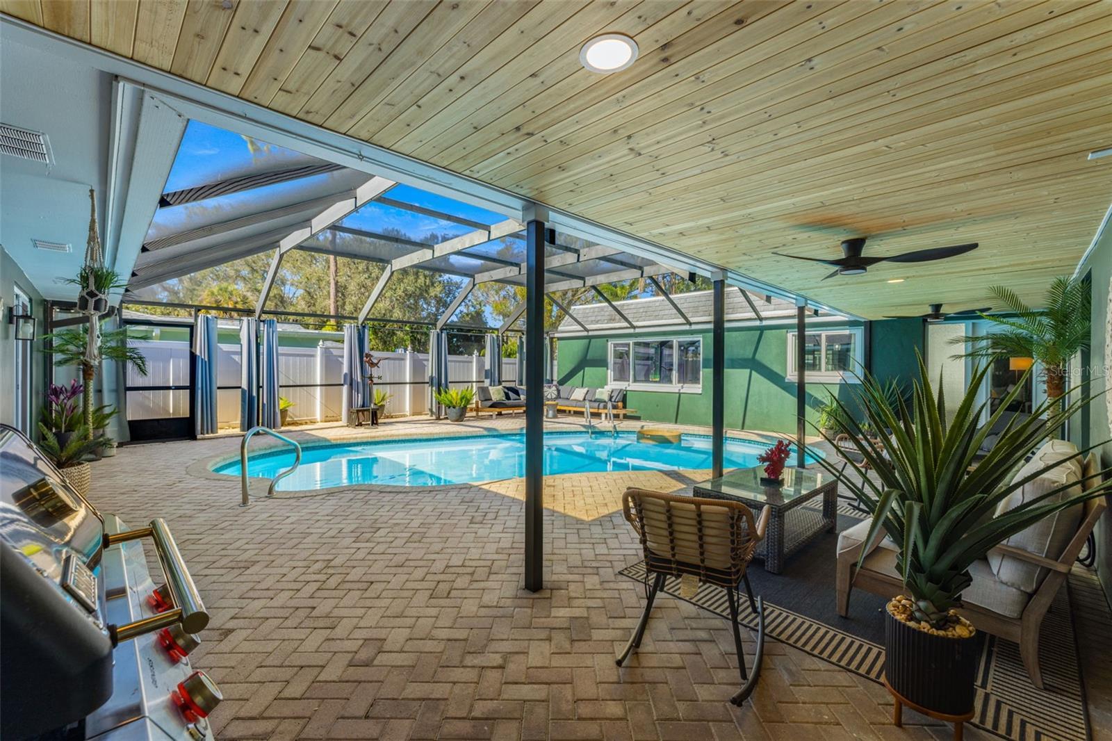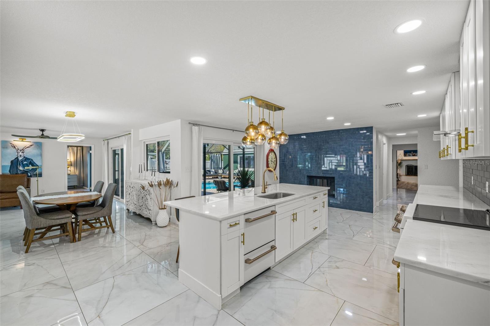 Under contract-accepting backup offers. If you’ve been waiting for a home that truly checks every box, this is the one. Set on a quarter-acre lot, this entertainer’s dream home makes an unforgettable first impression with a pavered driveway and walkway framed by lush landscaping and winding sidewalks, setting the tone for a property that has been thoughtfully updated and beautifully maintained. Inside, over 3,500 square feet of living space unfolds with oversized 30-inch porcelain tile throughout the main living areas, kitchen, hallway, and flex space, creating a sleek and modern feel. The entry opens into a spacious living and dining area that flows seamlessly into the kitchen, making entertaining effortless. The kitchen is both stylish and functional with granite countertops offering generous barstool seating, modern backsplash, shaker cabinetry, and a striking wood-burning fireplace with a fully tiled wall surround. High-end Café appliances elevate the space and include a dual oven, double drawer dishwasher, and a refrigerator with a flex drawer. Down the hallway, a large family room delivers the ultimate entertaining experience. This space features a serving area with a full-sized refrigerator, concrete countertop, and barstool seating, ideal for entertaining. A dedicated beverage station, a wood-burning fireplace, and a pool table that conveys with the home create the ultimate gathering space. The primary suite is privately located near the front of the home and offers a true retreat with an ensuite bathroom featuring dual sinks, a large walk-in shower, and direct access to the pool for easy indoor-outdoor living. Two additional bedrooms share a Jack and Jill bathroom with dual sinks, while a dedicated office and a convenient pool bath both offer direct access to the outdoor living area. A spacious laundry room provides ample cabinetry, storage, and a utility sink for everyday convenience. A newer 2025 water heater offers peace of mind for years to come. Outside, the home truly comes to life. The screened-in lanai features recently replaced screens and overlooks a sparkling private pool and pavered pool deck, creating the perfect setting for relaxing, entertaining, and enjoying the Florida sunshine. Zoned for A-rated Belcher Elementary School just down the road and less than 10 minutes from Eagle Lake Park with its playground, dog park, picnic shelters, boardwalks, paved trails, and fishing areas. With easy access to US-19, this location keeps you close to shopping, dining, and entertainment while putting you right in the center of it all. Homes like this don’t come around often, schedule your showing today!