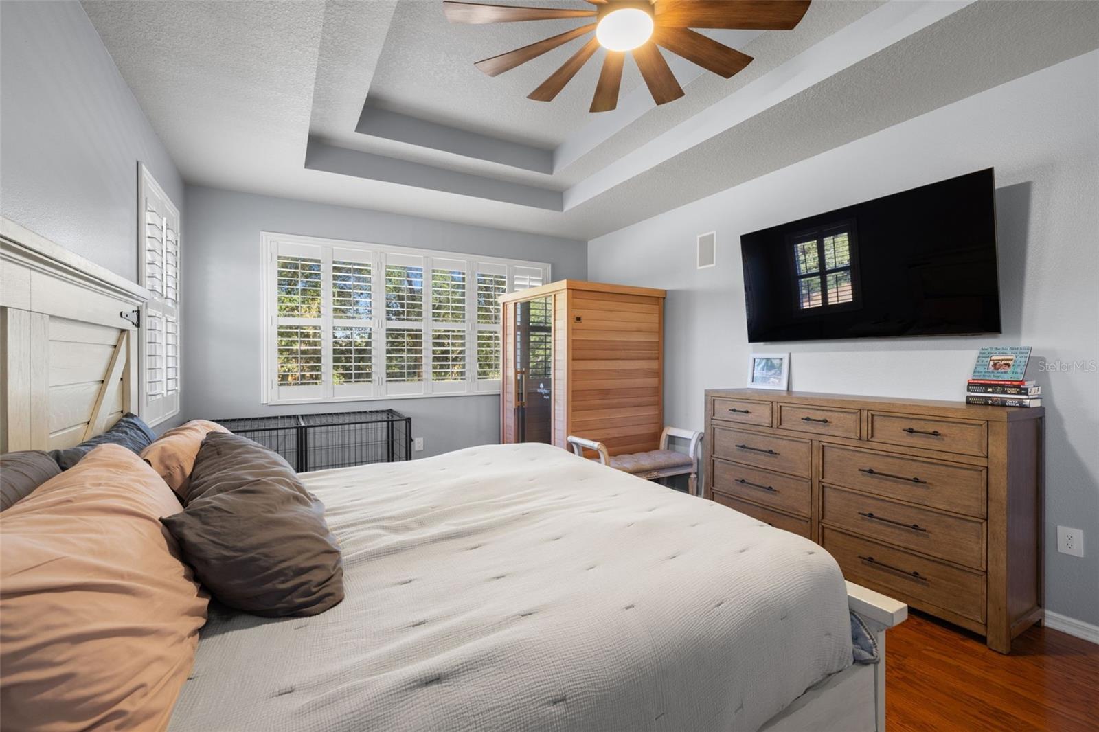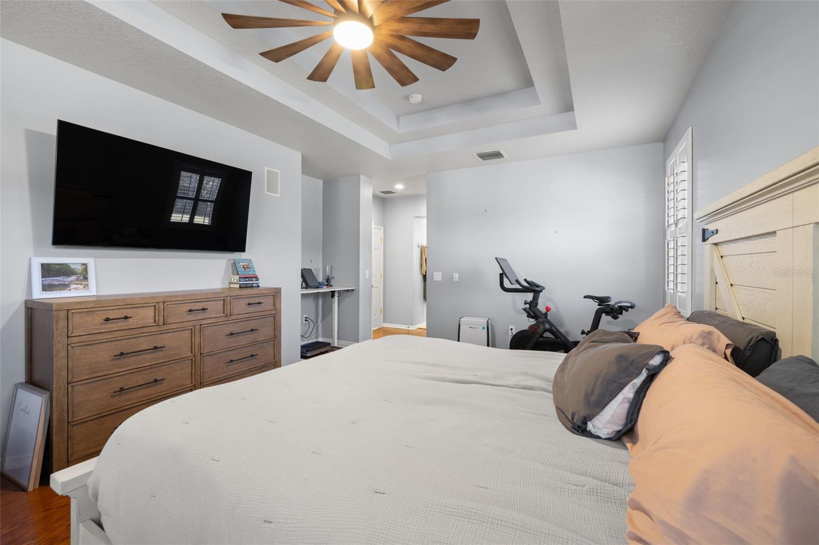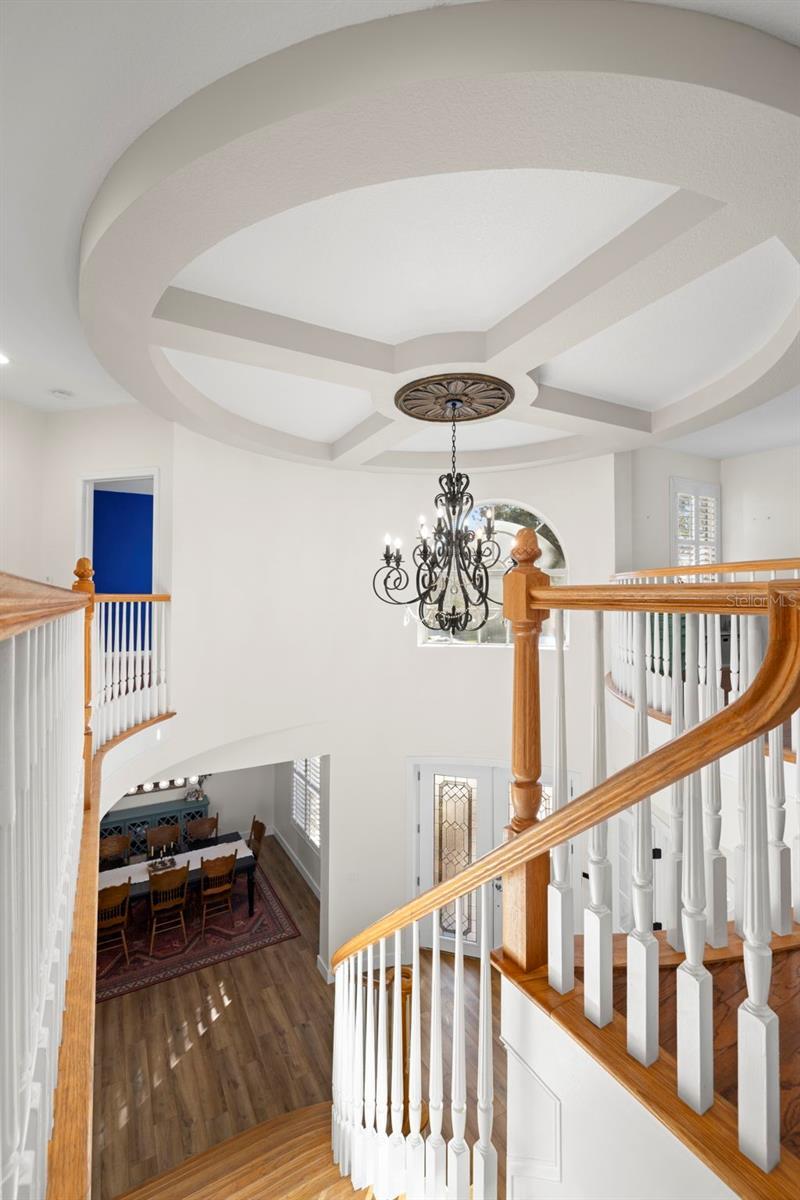 - Built-in Features, Ceiling Fans(s), Coffered Ceiling(s), Crown Molding, Eat-in Kitchen, High Ceilings, In Wall Pest System, Kitchen/Family Room Combo, PrimaryBedroom Upstairs, Solid Wood Cabinets, Split Bedroom, Stone Counters, Thermostat, Tray Ceiling(s), Walk-In Closet(s), Window Treatments