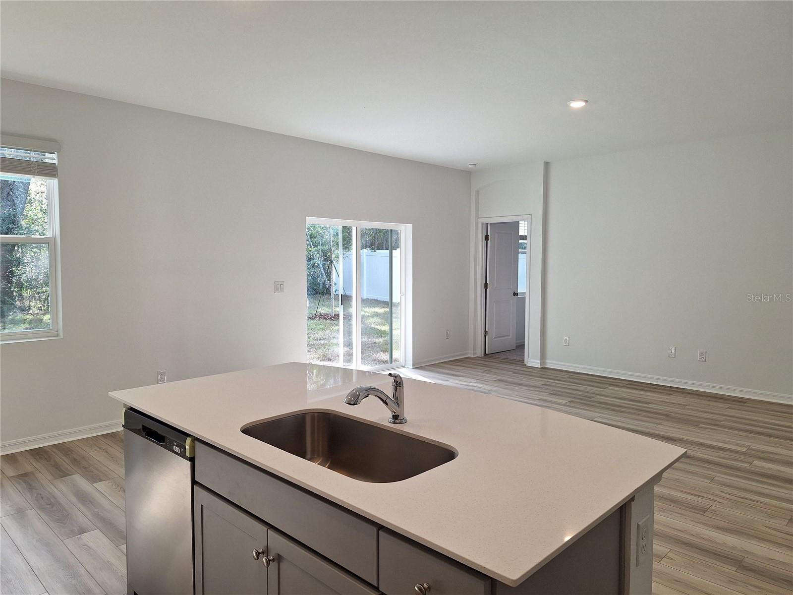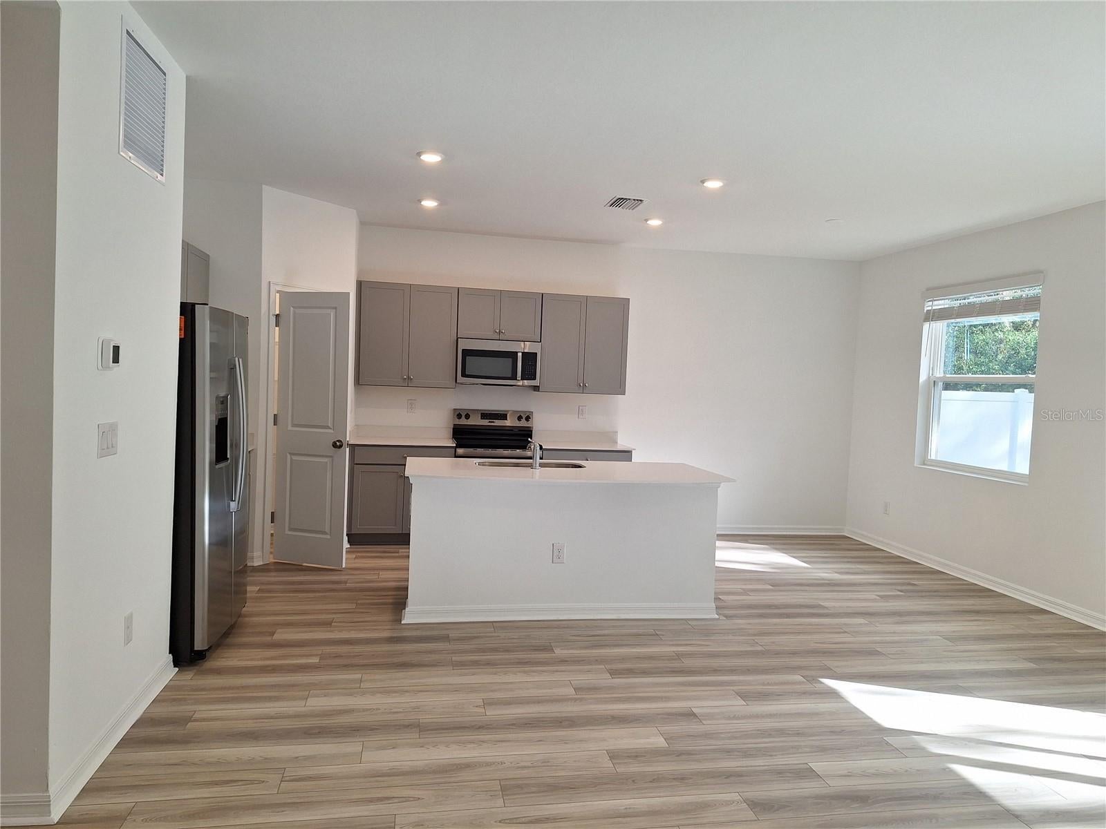 3-bedroom, 2-bathroom home with stunning features! Step through the 8-foot entry door into a spacious foyer with soaring 9'4" ceilings throughout. The open-concept great room boasts luxury vinyl flooring, perfect for modern living. The eat-in kitchen is a chef's dream, featuring a bar with quartz countertops, an extra-deep undermount sink, and a full suite of appliances, including a stainless steel side-by-side refrigerator with a water and ice maker. The microwave vents to the outside, and the oversized pantry provides ample storage. Enjoy the convenience of a large laundry room with a washer and dryer included. The master suite offers a luxurious bathroom with a spacious walk-in shower, dual sinks, and a generous walk-in closet. Blinds are installed on all windows for added privacy. Located in a serene neighborhood of all single-story homes, each with oversized lots, you'll enjoy at least 20 feet of space between you and your neighbors. The expansive backyard offers plenty of room for Family and pets, or entertaining. This home is a must-see!