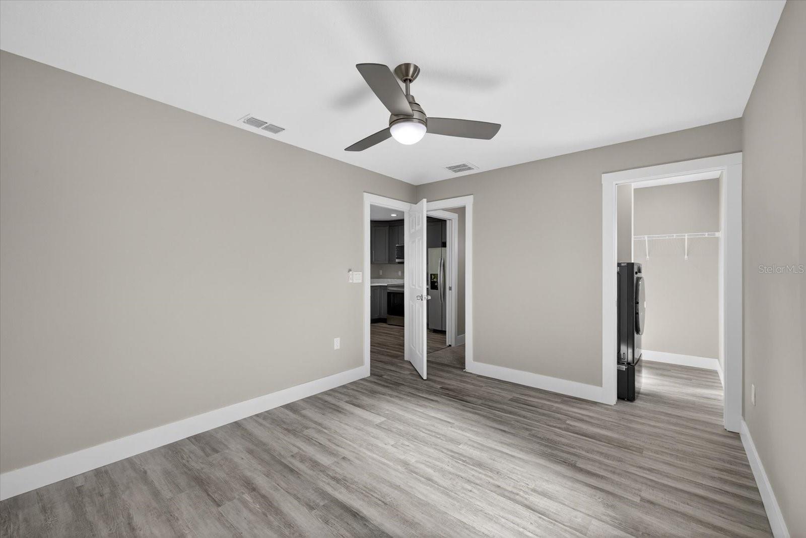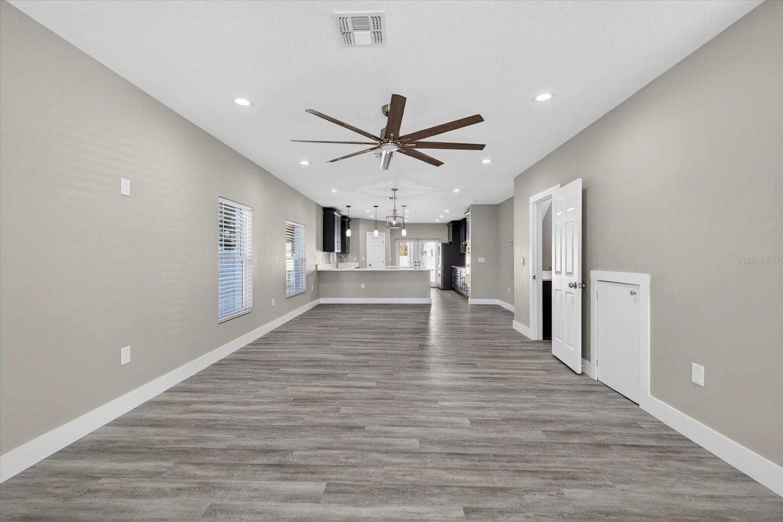 - Ceiling Fans(s), Central Vaccum, Crown Molding, Eat-in Kitchen, High Ceilings, Kitchen/Family Room Combo, Living Room/Dining Room Combo, Open Floorplan, Primary Bedroom Main Floor, Solid Surface Counters, Solid Wood Cabinets, Stone Counters, Thermostat, Walk-In Closet(s)
