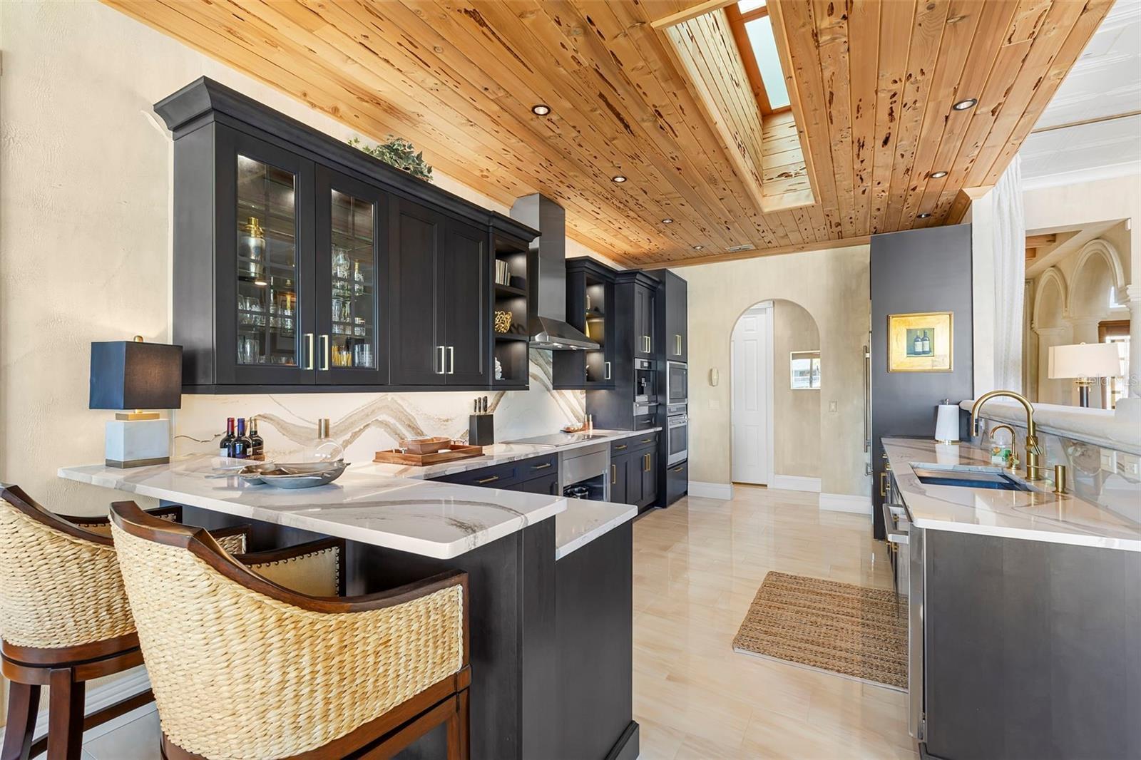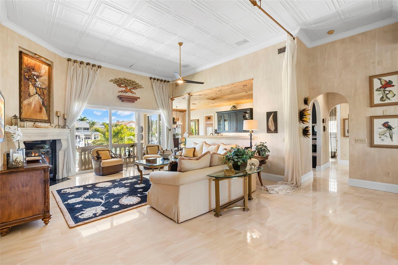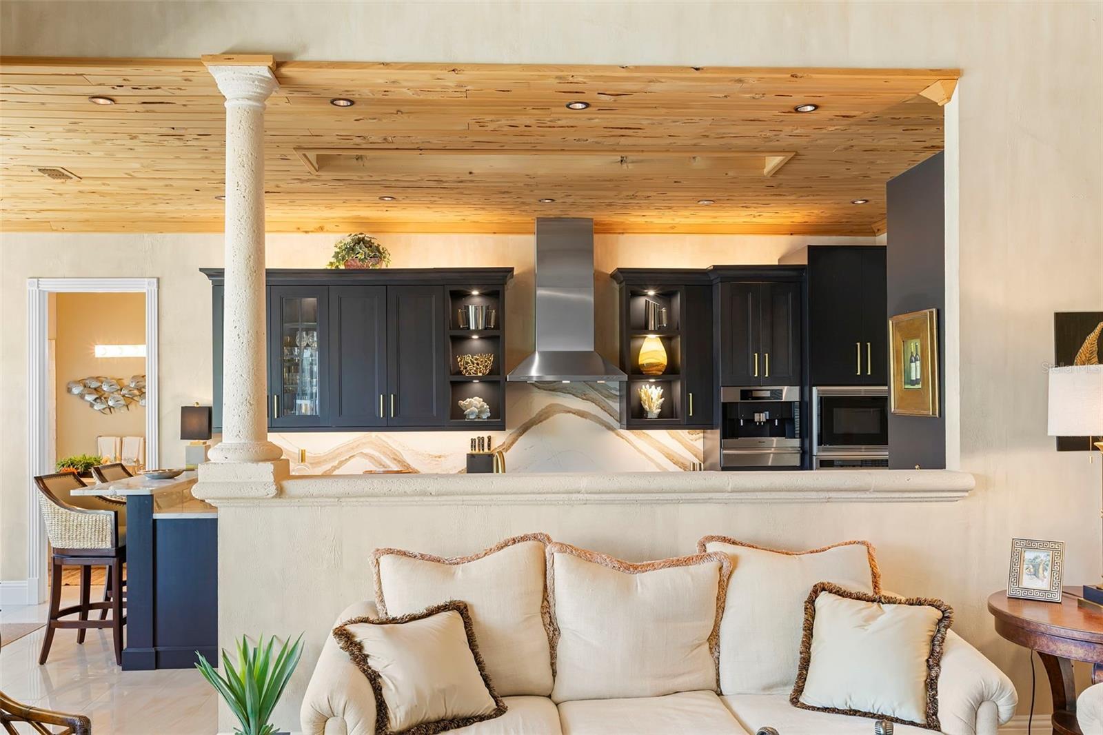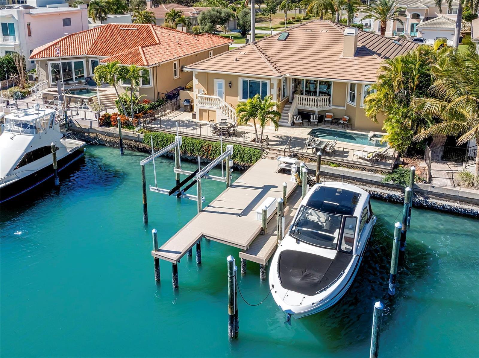 Under contract-accepting backup offers. Perfectly positioned on protected waterfront, this beautifully built custom single-story residence in Tierra Verde redefines easy living with an inviting yet impressive design that truly lives larger than its square footage. Thoughtfully curated for both everyday comfort and effortless entertaining, the home welcomes you with an expansive open great room crowned by soaring 13-foot ceilings and dramatic floor-to-ceiling pocket sliding doors, seamlessly blending indoor and outdoor living. At the heart of the home, the remodeled chef’s kitchen is a striking statement of style and function, featuring rich charcoal shaker cabinetry, a stunning pecky cypress ceiling, and exquisite Cambria Britannica Gold countertops. Top-of-the-line appliances include a Wolf induction cooktop, Sub-Zero refrigerator, beverage fridge, and a built-in Miele coffee system, all overlooking the great room and casual waterfront dining—perfect for hosting or unwinding with the water as your backdrop. The formal dining area is also highlighted with exquisite pecky cypress beams. Designer finishes are found throughout, from fabulous statement lighting to 12x24 tile porcelain tile flooring in the main living areas, custom window treatments, refined trim work, and elegant moldings—every detail thoughtfully selected. The split bedroom floor plan offers privacy and comfort, highlighted by a serene waterfront primary suite with an indulgent, spa-inspired en suite bath. Two beautifully appointed guest bedrooms each enjoy access to their own baths, while a large office or optional fourth bedroom adds flexibility for guests or working from home. Outdoor living has been completely reimagined with expanded composite decking, stainless steel cable railings, and refreshed spaces designed for relaxing, entertaining, and enjoying the coastal lifestyle. Upgrades include a multi-zoned A/C system (2022), refinished PebbleTec pool, hurricane windows, generator, and a newer roof (2018), offering peace of mind and modern efficiency. Boaters will appreciate the updated composite dock, featuring a wet slip accommodating a 45-foot vessel and an additional 13,000-pound lift, providing a safe haven with easy access to the Gulf of America and Tampa Bay. The home’s curb appeal is equally impressive with Chicago paver driveways and walkways, mature tropical landscaping, and a welcoming arrival that sets the tone for what lies beyond. Thoughtfully updated, impeccably maintained, and truly move-in ready—this waterfront home is a must see!