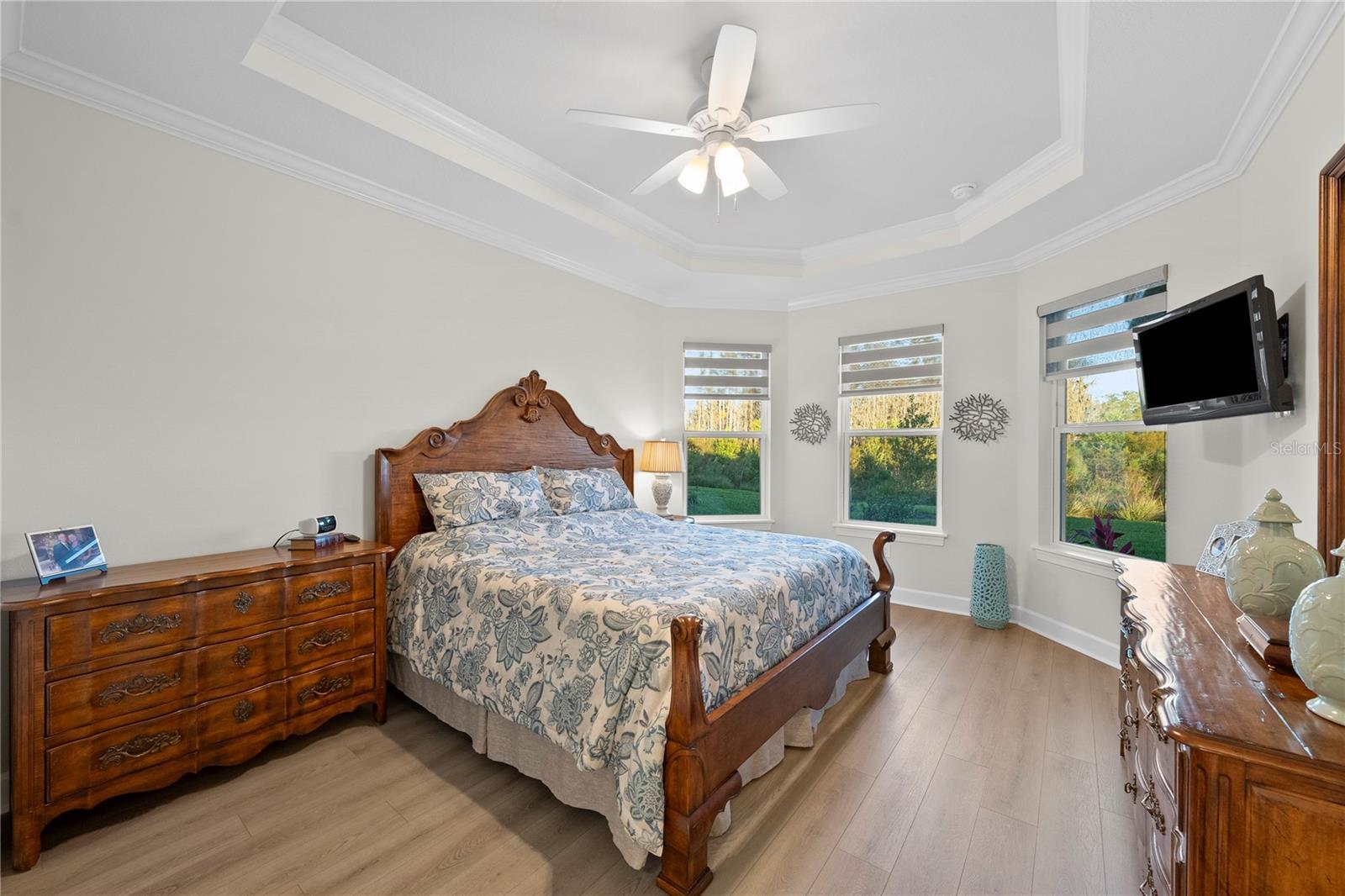 - Ceiling Fans(s), Crown Molding, Eat-in Kitchen, High Ceilings, Kitchen/Family Room Combo, Open Floorplan, Primary Bedroom Main Floor, Solid Wood Cabinets, Stone Counters, Tray Ceiling(s), Walk-In Closet(s), Window Treatments