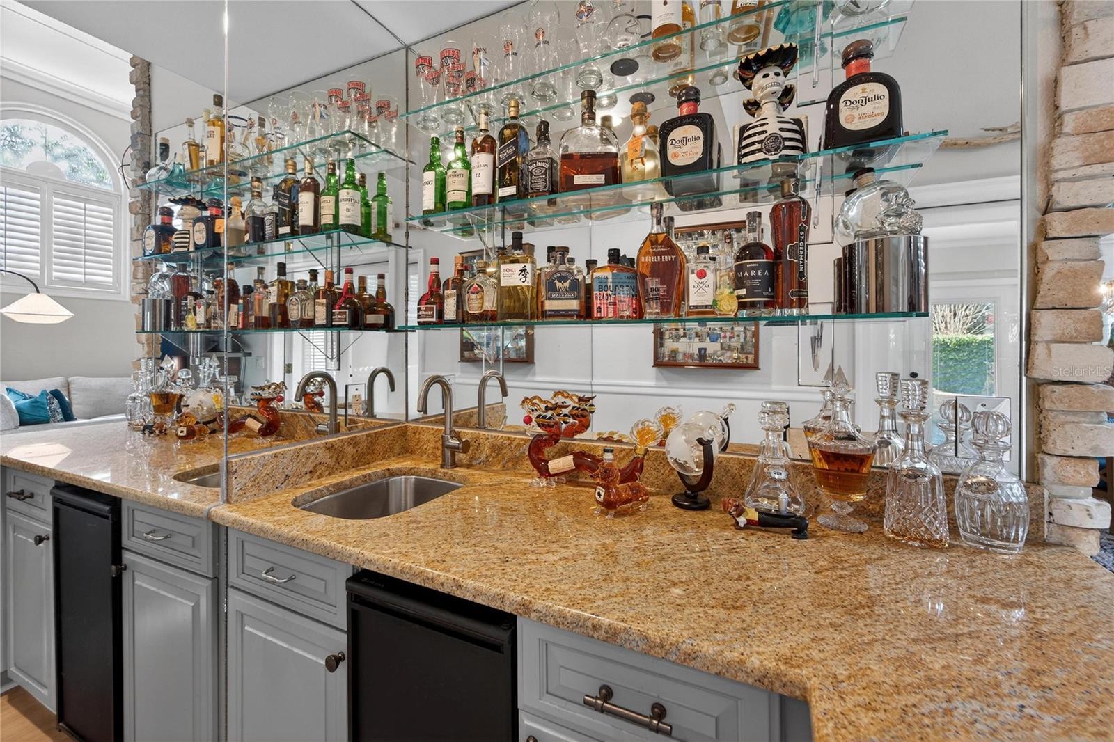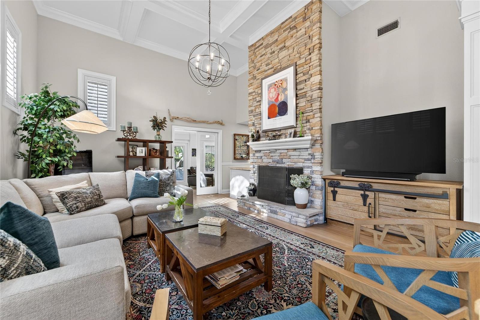 - Built-in Features, Ceiling Fans(s), Coffered Ceiling(s), Eat-in Kitchen, High Ceilings, Primary Bedroom Main Floor, Solid Wood Cabinets, Stone Counters, Walk-In Closet(s), Wet Bar