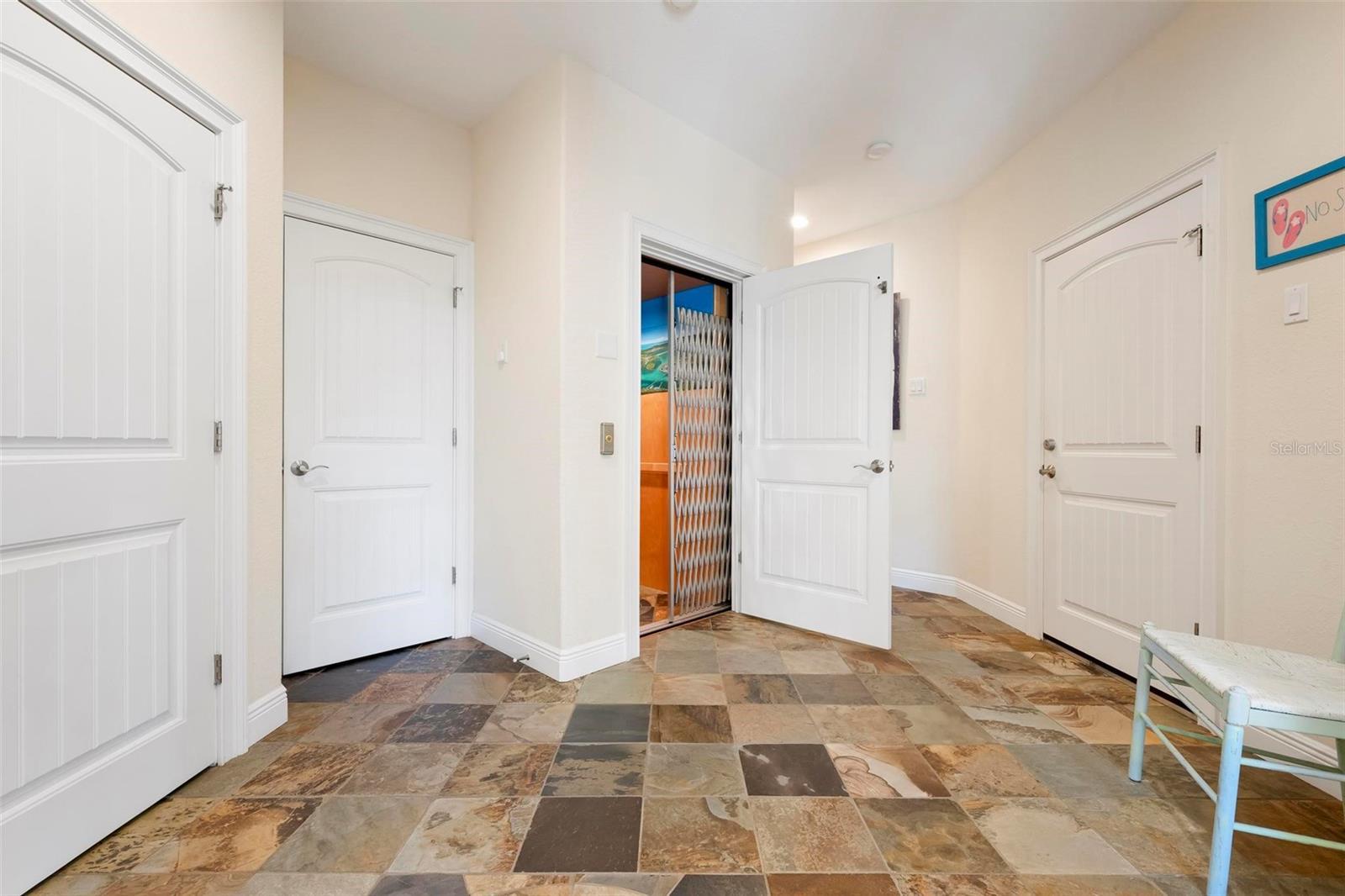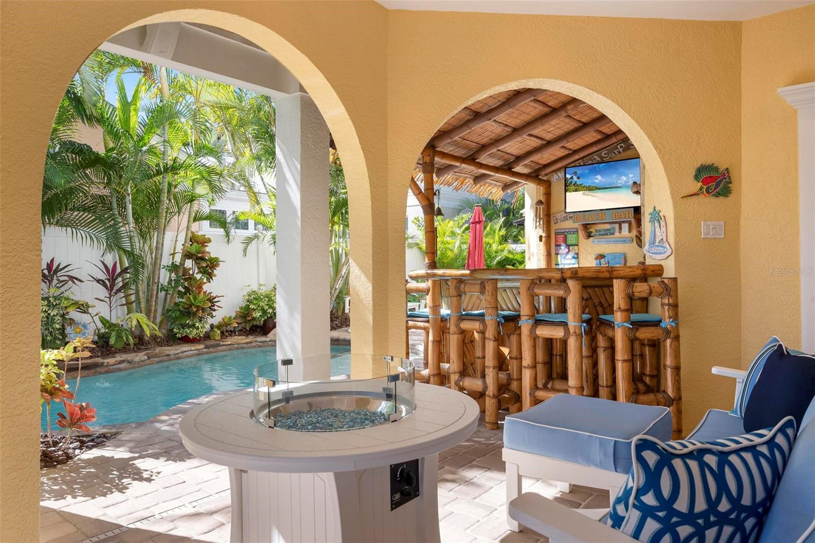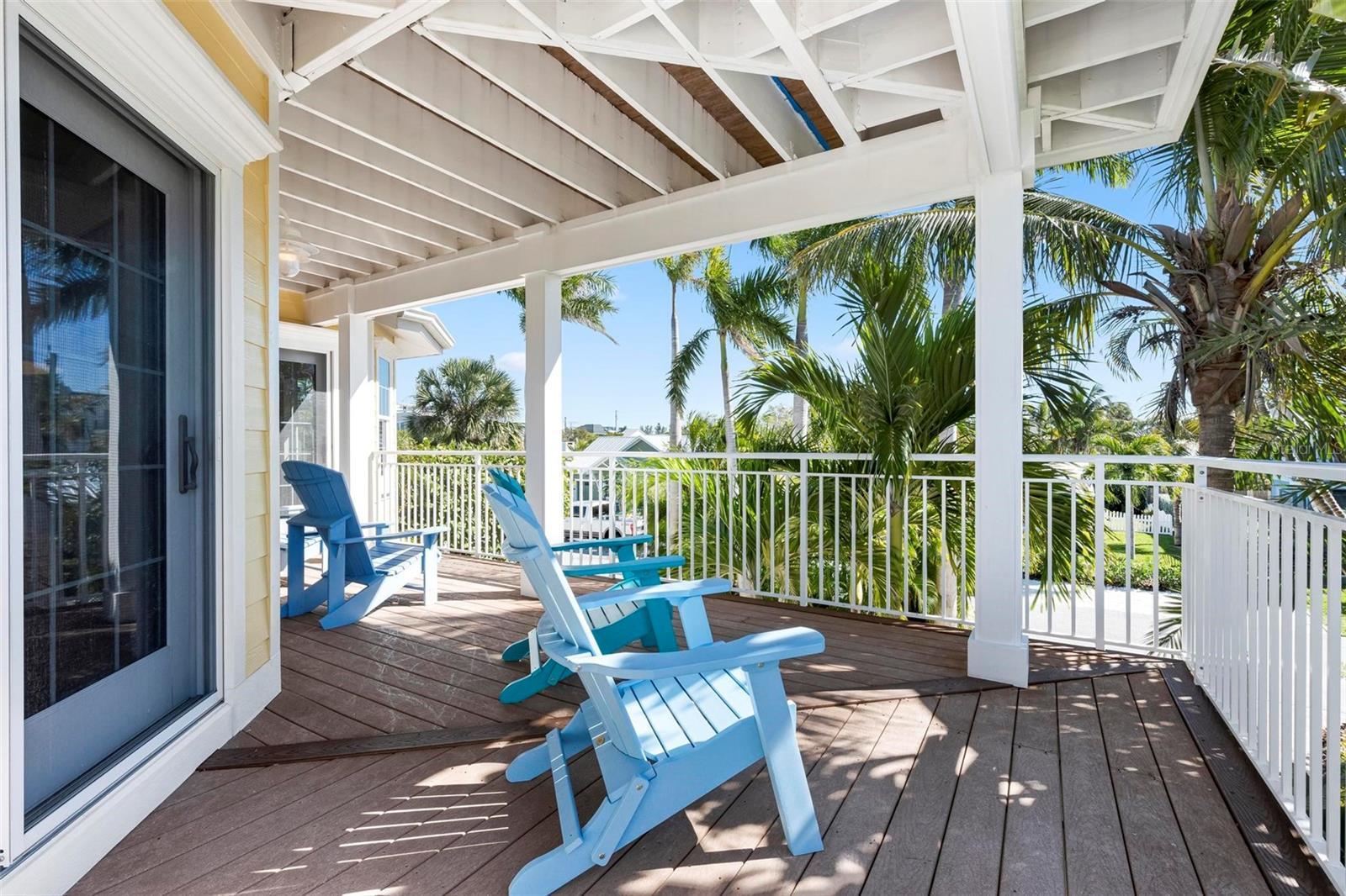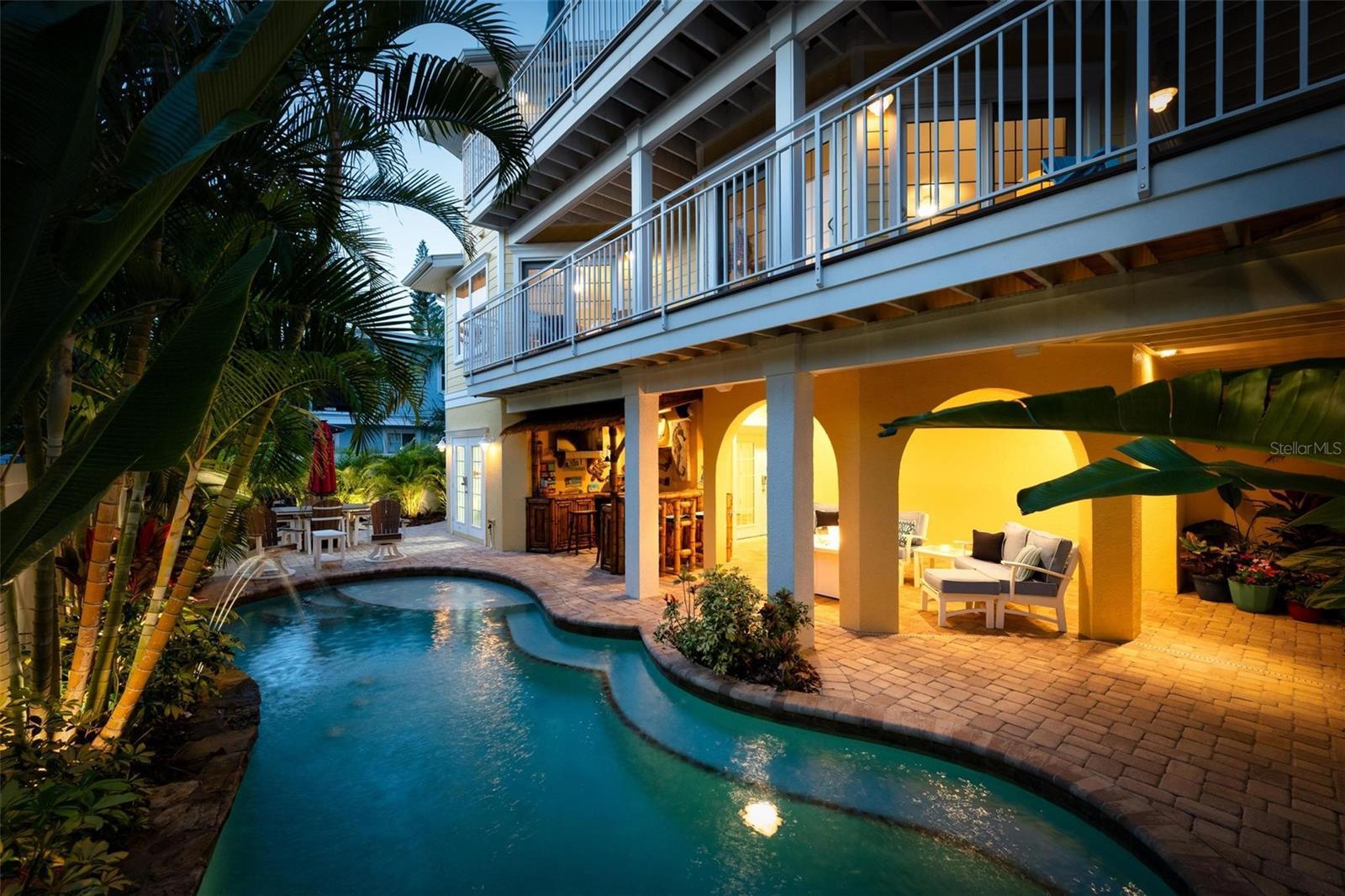 From sunrise to sunset, stunning Gulf views throughout the house. One of the most outstanding features of this property is the expansive rooftop deck—an irreplaceable amenity due to current height restrictions. From this vantage point, take in breathtaking Gulf sunsets, views of the Sunshine Skyway Bridge, and sweeping 360-degree panoramas of the island and surrounding waters. The elevated position of the street further enhances views and peace of mind. The home was thoughtfully designed by award winning architect Emily Anne Smith. The floor plan with four bedrooms, including two luxurious primary suites. Every bedroom features a private en-suite bathroom, complemented by two additional half bathrooms for a total of six bathrooms. A separate washer and dryer add convenience. The layout is designed to maximize natural light and capture views from sunrise to sunset. Both living levels feature wrap around decks with large seating and lounging areas. The second living level hosts a spacious primary suite with heated bathroom floors, a jacuzzi-style soaking tub, large shower, and dual vanities. This level also includes two additional en-suite bedrooms, plus a comfortable living area with a half kitchen featuring a sink, refrigerator, microwave, toaster oven, ample cabinetry, and a 48-bottle wine cooler—perfect for guests and family seeking privacy and independence. The third living level showcases an open-concept design with soaring ceilings, where the main kitchen, dining, and living areas all face the Gulf. Enjoy spectacular sunset and skyline views from nearly every angle. This level also features a second primary suite with a king bed and spa-like en-suite bathroom, a separate half bathroom, office workspace, and direct access to the rooftop deck. Outdoor living is equally impressive, highlighted by a resort-style pool with rock waterfall, jet stream fountain, jacuzzi jets, auto-fill system and mature tropical landscaping. A six-foot privacy fence surrounds the property. Entertain with ease at the covered tiki bar equipped with sink, refrigerator, TV, stereo, plus multiple shaded and sun-soaked seating areas. Additional features include a large garage accommodating 2–3 vehicles with 9-foot ceilings, extensive storage, workbenches, elevator, impact-rated PGT windows and doors, metal roof, low-maintenance stucco and Hardie plank exterior, heated slate kitchen floors, plus slate in entrance and storage room, bamboo flooring throughout the rest of the house, Hunter Douglas blinds, and the home is offered fully furnished and move-in ready. The home also features a monitored security system, smart thermostats and an Artificial Intelligence (AI) Camera System with DVR. Never rented, yet zoned for weekly rentals. No hurricane water intrusion in 2024. A truly rare offering on Anna Maria Island on one of the highest elevation and quietest streets with a deeded beach access.