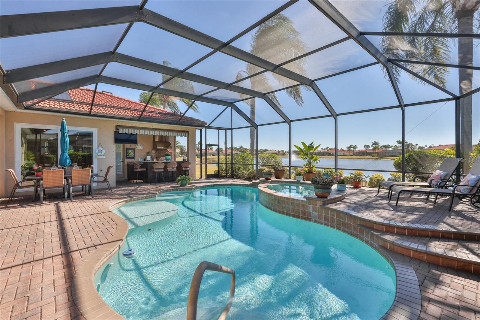 Under contract-accepting backup offers. Click On Interactive Tour Above ----- GORGEOUS HOME W/POOL & SPA, STUNNING WATER VIEWS AND UPGRADES GALORE! Welcome to this immaculate and perfectly maintained executive home on a large PREMIUM WATER VIEW LOT, in the resort-style, 55+ community of Renaissance. Step inside the beautiful screened entryway w/UPGRADED DOUBLE DOORS and be wowed by the terrific WATER VIEWS ALL ACROSS THE REAR OF THE HOME. The elegant living room/dining room combo with ENGINEERED HARDWOOD FLOORING (2021), is the perfect space for entertaining, and has a wall of sliders for easy access to the lanai area. The fabulous UPGRADED EAT-IN KITCHEN (2023) has 42 inch wood cabinetry w/pullouts, stainless appliances, including a natural gas cooktop, counter height quartz waterfall counters & breakfast bar, marble backsplash and modern gold faucets. The comfortable family room has a custom built-in entertainment center w/cabinets, surround sound ceiling speakers and another wall of sliders leading to the lanai. The EXTENDED owner's suite has a private entrance to the lanai, CALIFORNIA CLOSET ORGANIZERS, luxurious ensuite bathroom with walk-in shower and separate vanities. The other 3 spacious bedrooms and full bathroom are at the opposite end of the home for privacy. The 4th bedroom is currently being used as an office with BUILT-IN CALIFORNIA CLOSET OFFICE SYSTEM w/MURPHY BED. The home also has a full INTERIOR POOL BATH for added convenience. The extraordinary lanai (SCREENED 2025) boasts a large heated pool w/ spa, covered shady area, OUTDOOR KITCHEN (2025) W/GRANITE COUNTERS, MARINE GRADE CABINETS W/LYNX GRILL/ROTISSERIE, REFRIGERATOR, ICE MAKER, SINK & RETRACTABLE AWNING. Other home upgrades are, HVAC (2025), SOLAR PANELS FOR POOL (2022), POOL EQUIPMENT (2020), WATER SOFTENER (2020), HURRICANE SCREEN FOR LANAI COVERED AREA & ALL EXPOSED WINDOWS ARE IMPACT (2017), WHOLE HOUSE GENERATOR and OVERSIZED GARAGE W/CEILING STORAGE LOFT. A ONE YEAR HOME & POOL WARRANTY will also be provided. This home is just a short golf cart ride away from the neighborhood Club Renaissance where you can enjoy dining, drinks, spa, fitness classes, social activities and so much more. So come and tour this beauty today and discover why you'll want to call it home!