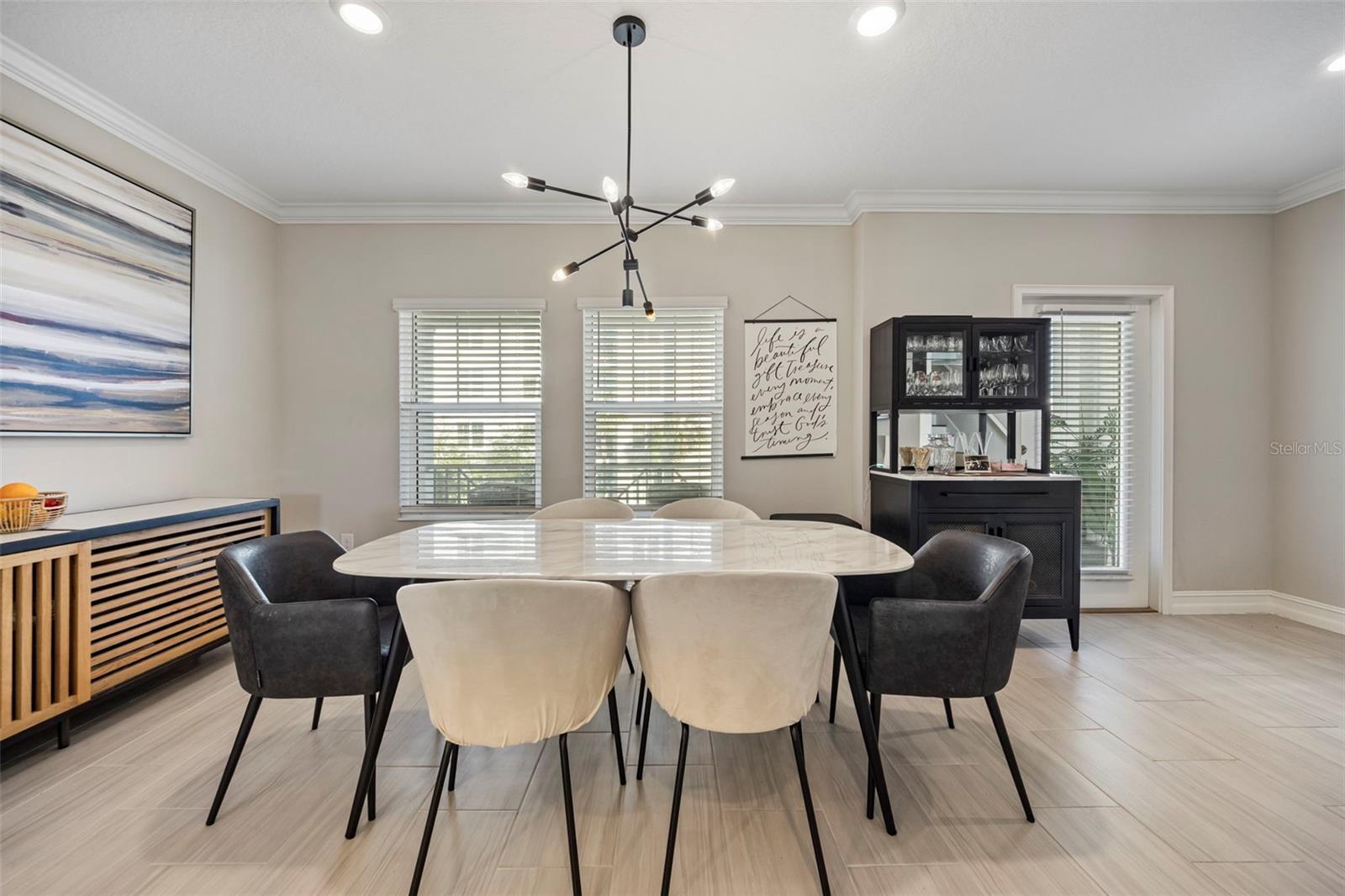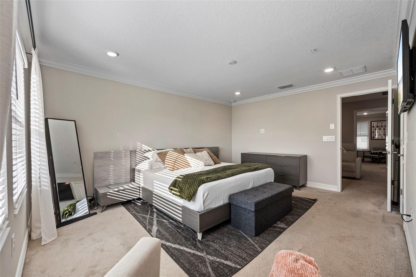 - Ceiling Fans(s), Crown Molding, Eat-in Kitchen, High Ceilings, Kitchen/Family Room Combo, Living Room/Dining Room Combo, Open Floorplan, PrimaryBedroom Upstairs, Solid Wood Cabinets, Stone Counters, Thermostat, Walk-In Closet(s), Window Treatments