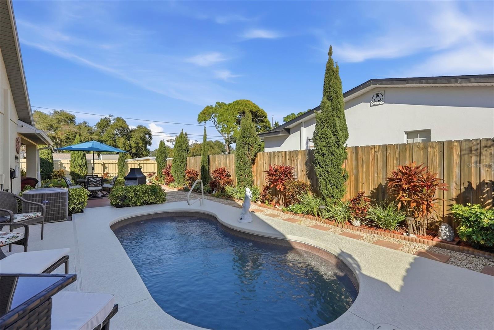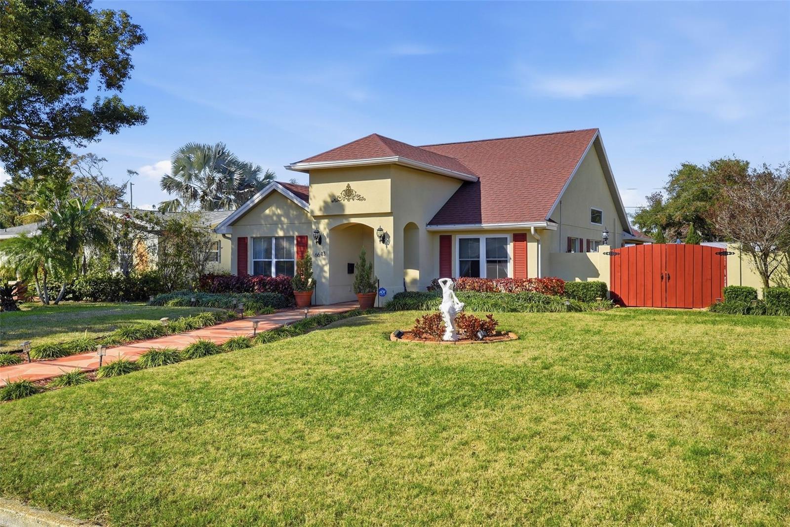 Welcome to your Tuscan retreat located in popular West Lake Pasadena and "X" None flood zone. Custom Built in 2012 by Apple Homes this home is one of a kind, large lot, turn key, freshly painted, professionally landscaped, spotless home is ready for your to enjoy. Located just 10 minutes from St. Pete Beach or Treasure Island. Follow the hand painted red brick walkway to the decorative glass front door covered entryway. Foyer entry opens to a spacious living room with plenty of natural light. Various volume ceiling heights and accentuating walls adds a visual uniqueness to the living space coupled with the neutral porcelain tile throughout add versatility to any decor. Lots of natural light in the home Higher end windows, doors and new ceiling fans throughout the home. Spacious kitchen features granite countertops, plenty of work space,pantry, wood cabinetry, eat in island bar area, new stainless steel appliances and a convenient pass through window to the bar area on the lanai. Dining area offers plenty of room for additional buffet area if you please. Split bedroom plan, master bedroom measures 18x14, large walk in closet 7x8, master bath features a step in glass enclosure shower, built in bench sit, wood vanity and new lighting. 2nd and 3rd bedrooms are a generous size, offers ample wall to wall closet space and natural light. Bathroom 2 has been remodeled by Jacuzzi Bath Company in 2025, new bathroom window, shower, vanity, mirror and lights. Inside utility room 6x9 with full size washer dryer, wash basin, wall to wall upper storage cabinets, window for extra lighting and area to hang laundry. Large stand up attic with pull down stair access from hallway and garage. Gorgeous landscaped backyard oasis, low maintenance saltwater fiberglass pool just 4 years old. Picturesque Views of the lanai, backyard and pool from kitchen and living area. Cover lanai 17X14 with pass through window to bar, recessed lights, ceiling fans, covered direct access to attached oversized 2 car garage with alley access. Lots of parking for your guests. Lanai's roof line is contiguous with the roof line of the home and could be easily enclosed. PLEASE SEE THESE EXTRA SPECIAL FEATURES AND UPGRADES OF THIS HOME THAT ARE NOTED IN THE ATTACHMENTS.