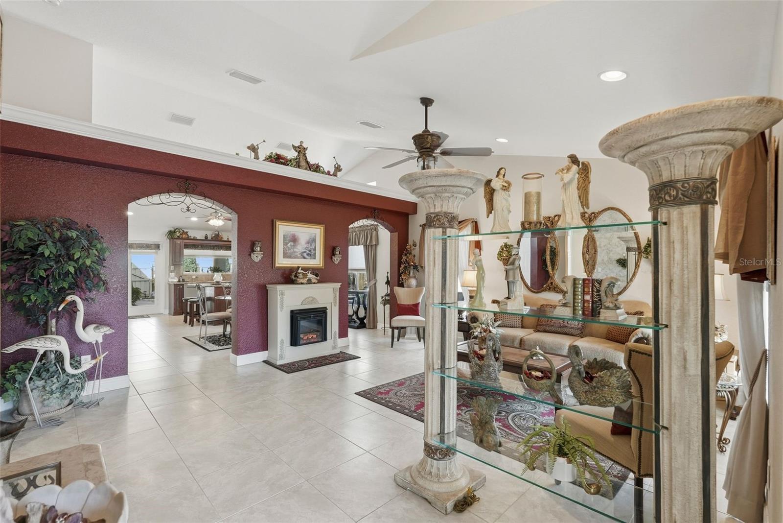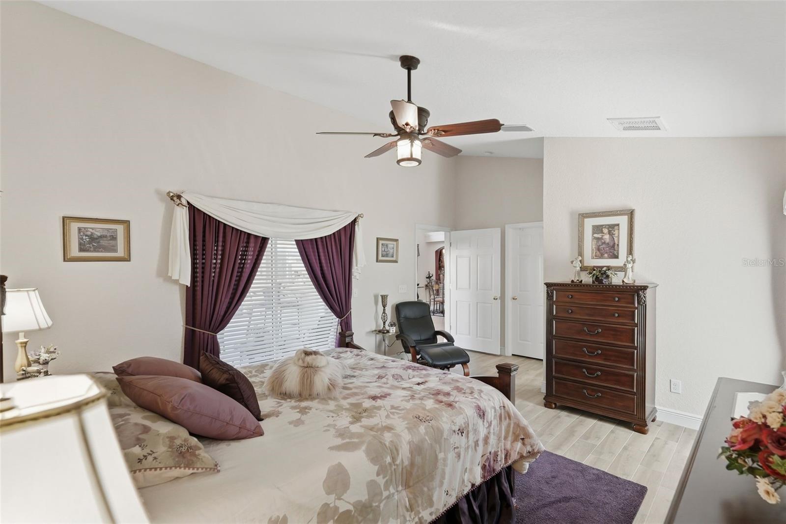 - Cathedral Ceiling(s), Ceiling Fans(s), Eat-in Kitchen, High Ceilings, Open Floorplan, Primary Bedroom Main Floor, Solid Surface Counters, Solid Wood Cabinets, Split Bedroom, Stone Counters, Vaulted Ceiling(s), Walk-In Closet(s), Window Treatments