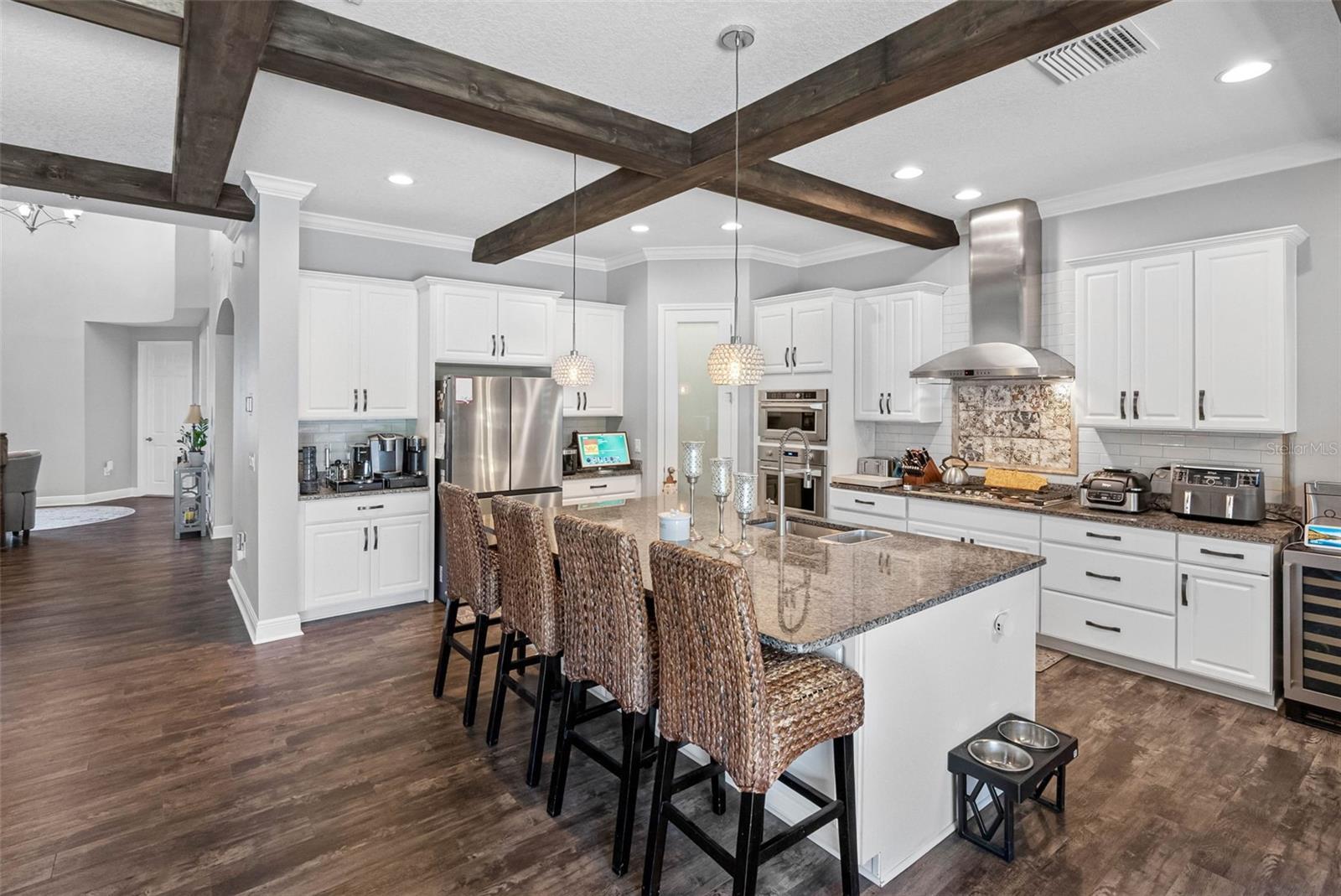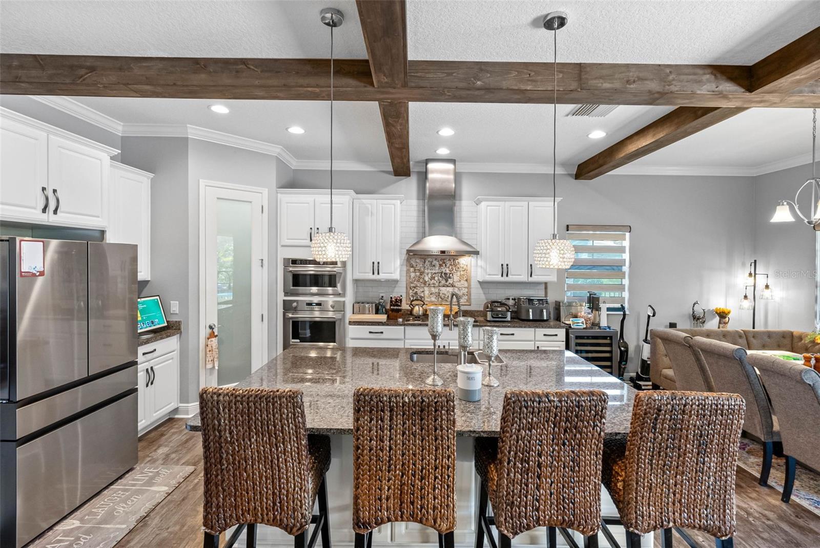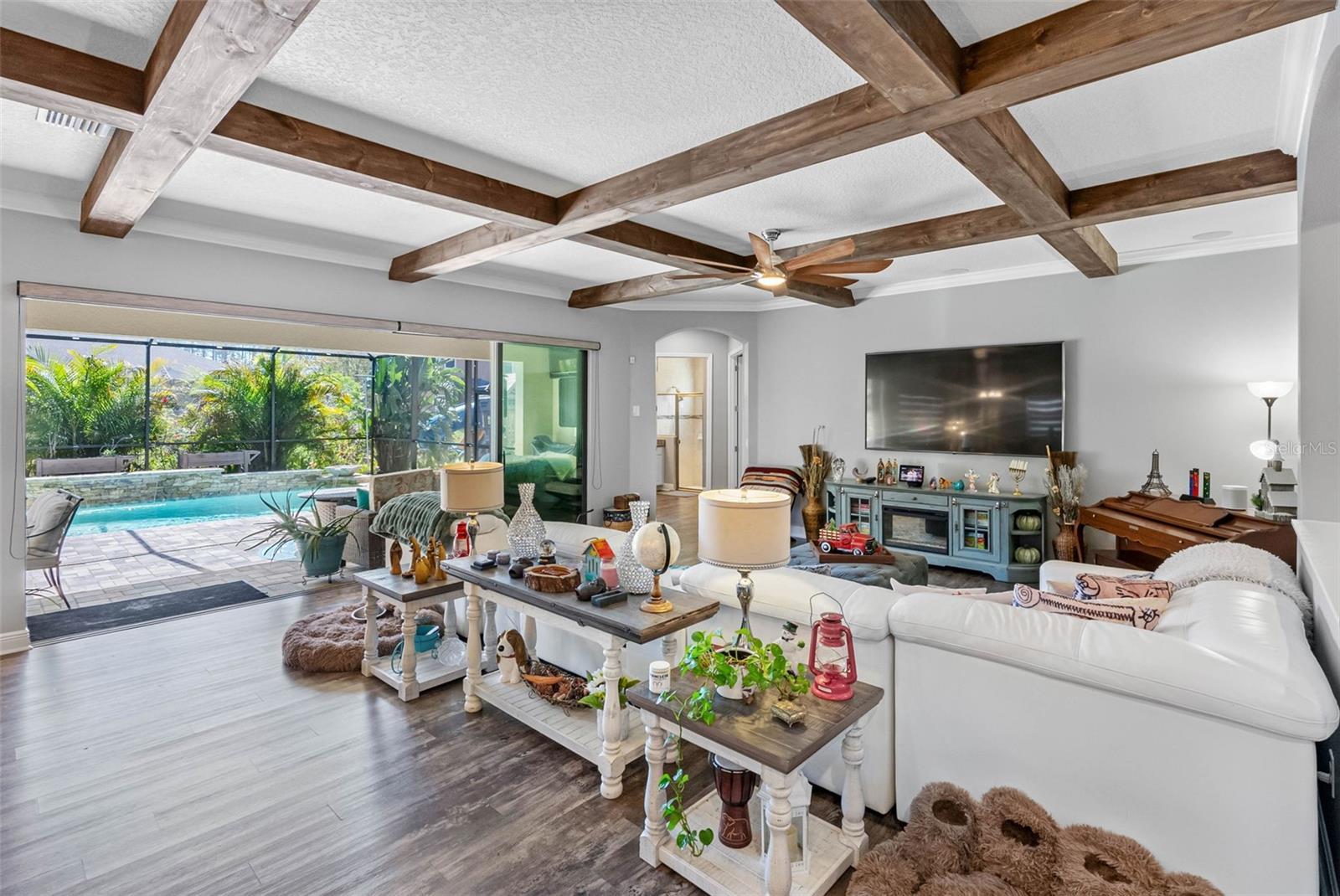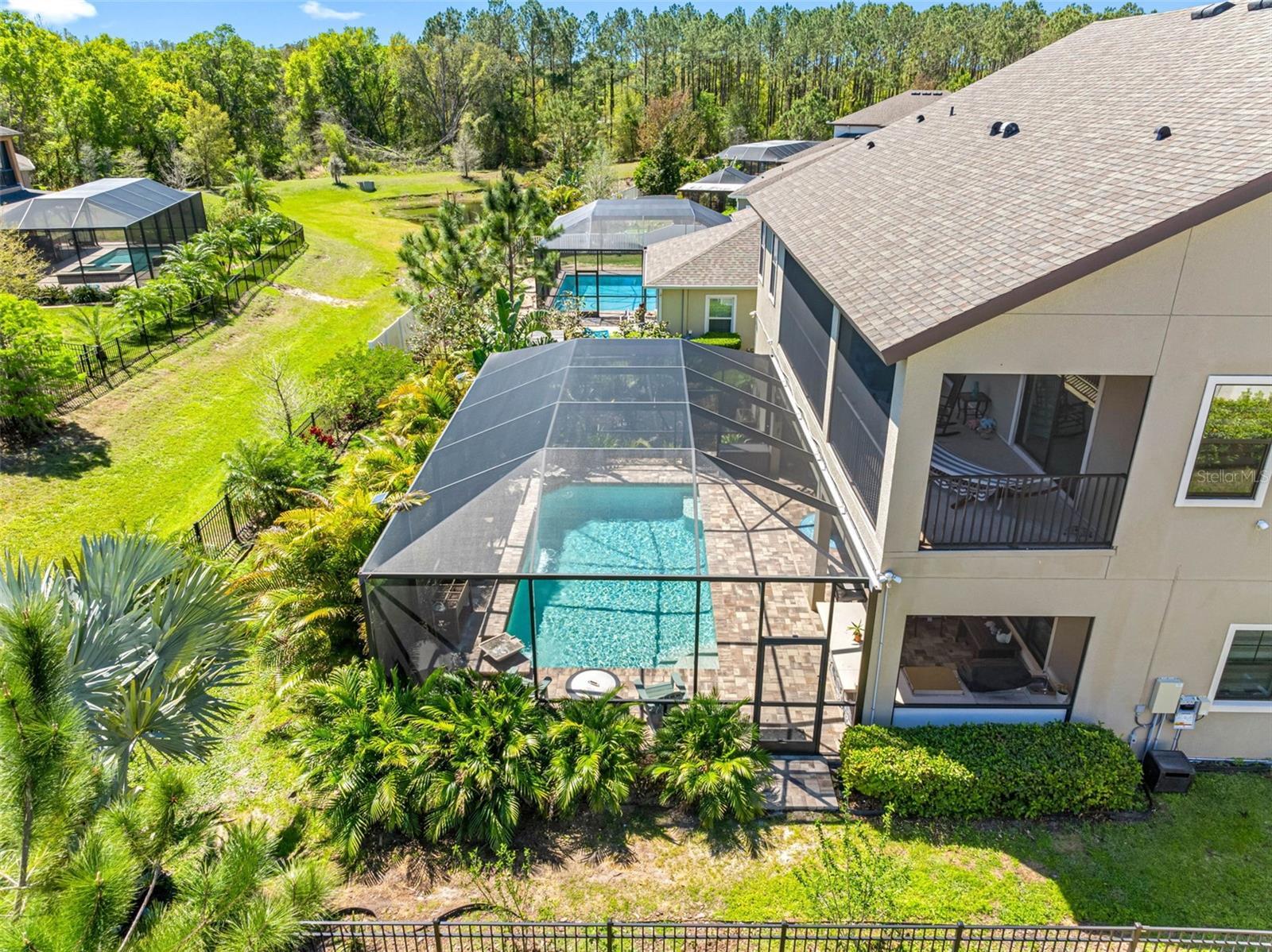 This home is MOVE IN READY!! Set within the tranquil heart of Land O’ Lakes, this Homes by WestBay Madeira III pool estate redefines modern luxury. Every detail of its 4,218 sq. ft. layout has been carefully curated to balance sophistication, comfort, and effortless living. From the moment you enter, soaring ceilings with exposed wood beams create a sense of grandeur, while the open flow invites both intimate gatherings and grand-scale entertaining. The gourmet kitchen, anchored by an expansive island and outfitted with top-tier appliances, is as functional as it is stunning. Beyond the glass, a private resort oasis awaits—complete with a newly designed pool, integrated spa, and full summer kitchen, offering the ultimate setting for year-round entertaining inside a massive screened in area. Retreat upstairs to a serene owner’s sanctuary, where a spa-style bath and private balcony provide the perfect escape. A second covered balcony extends from the front suite, capturing morning light and evening breezes in equal measure. Thoughtful upgrades—including a 22kW Generac whole-home generator—blend luxury with peace of mind. This home is not only elegant but exceptionally livable, designed to meet every modern demand.