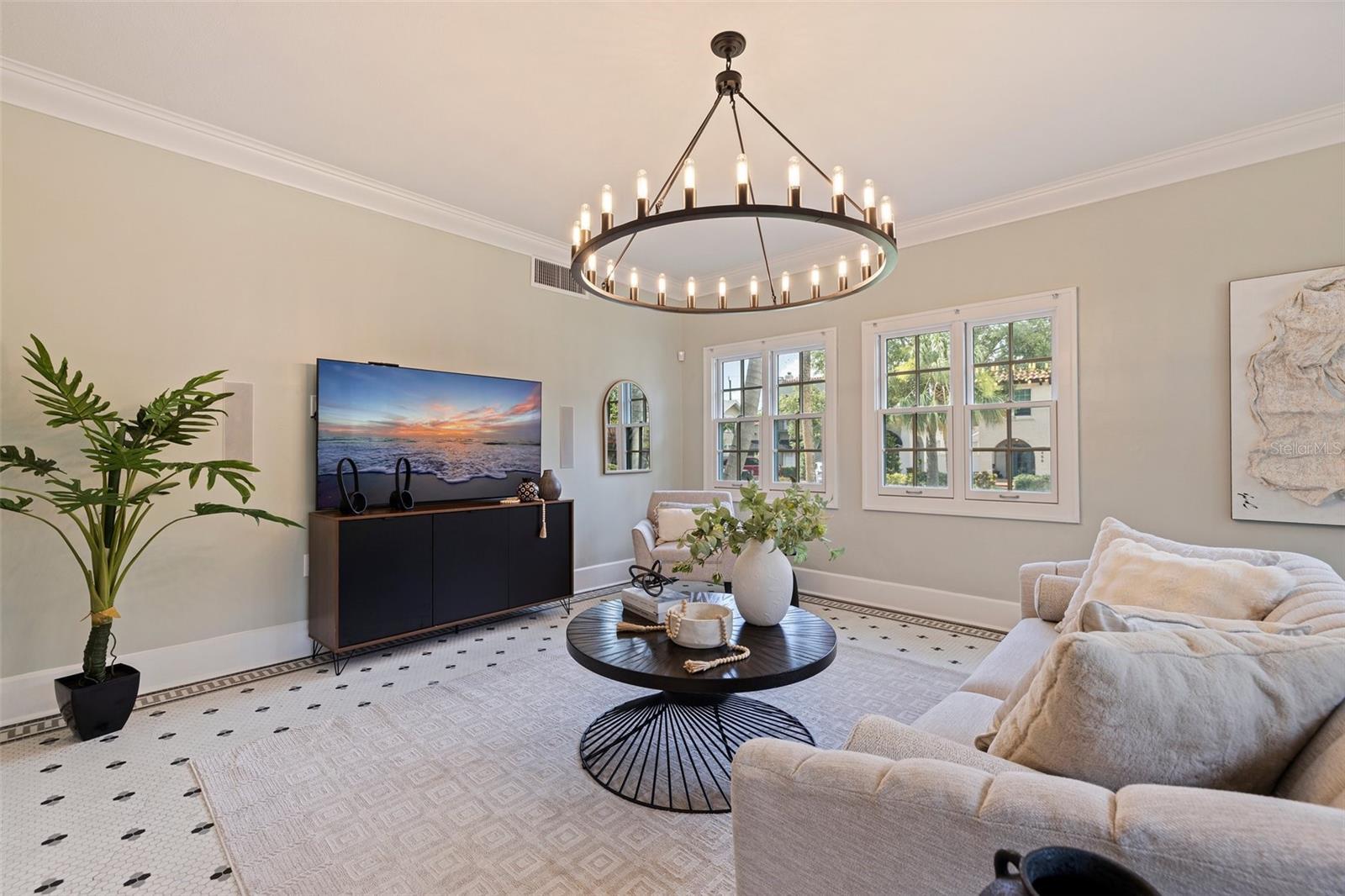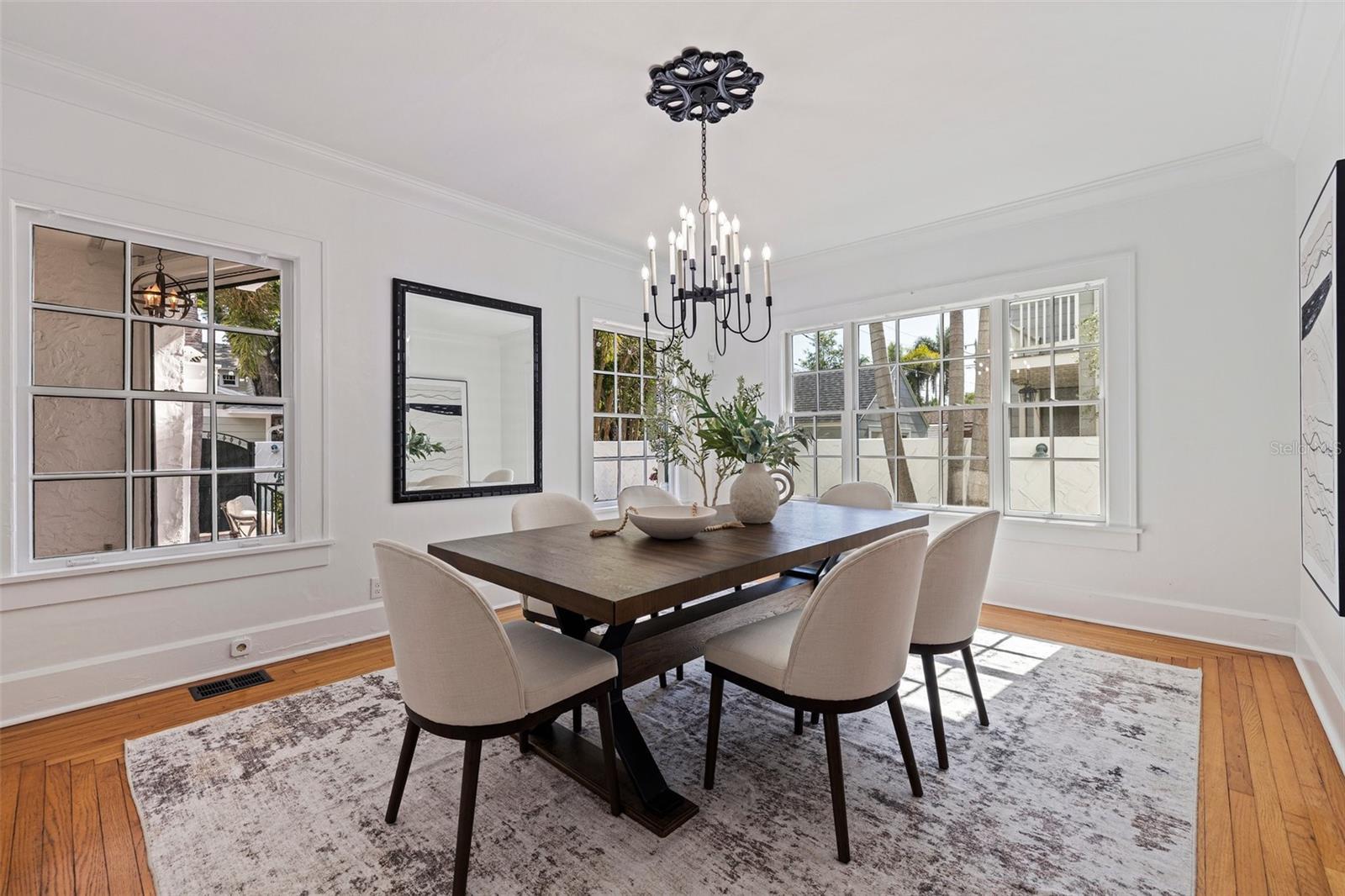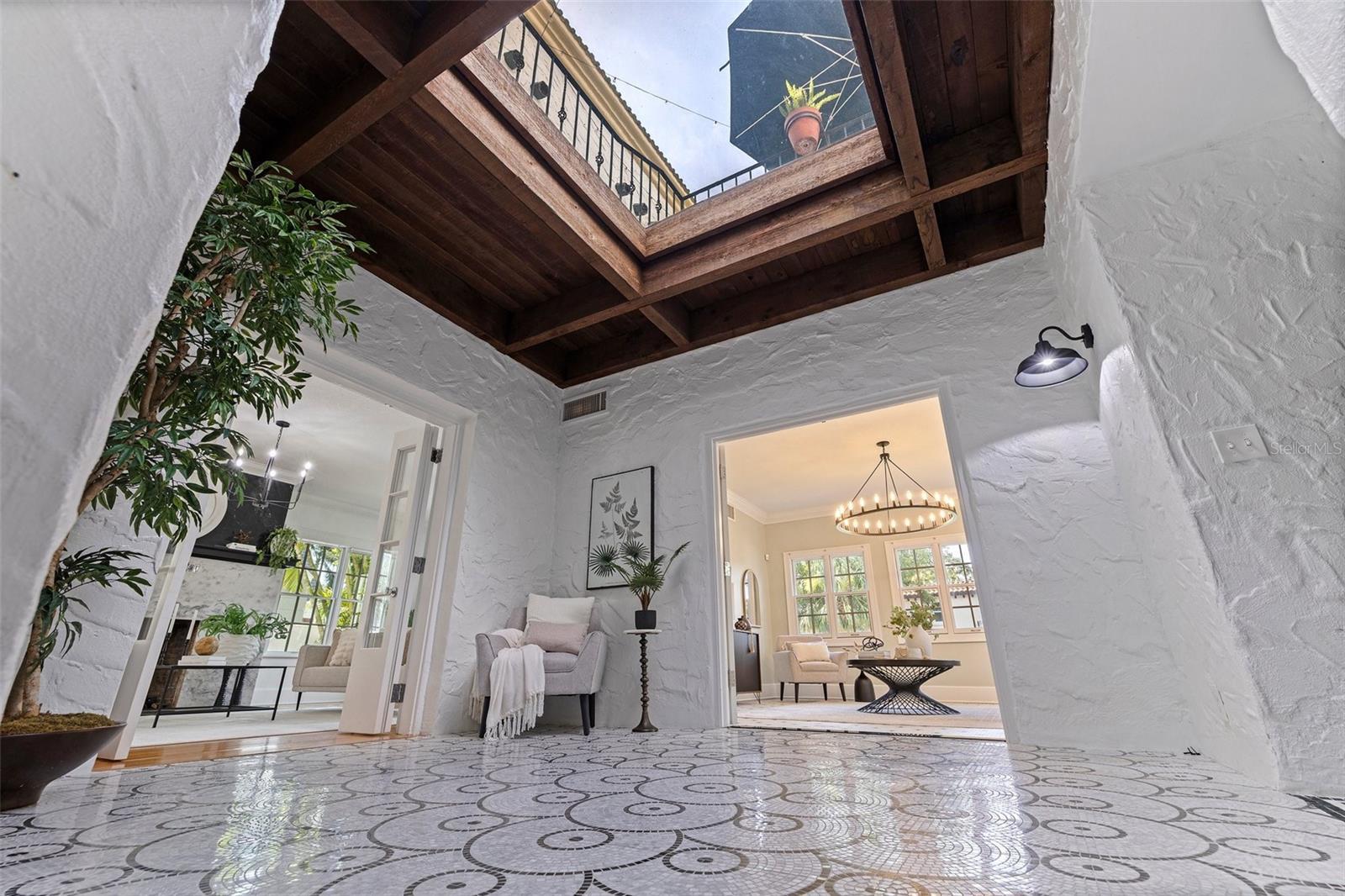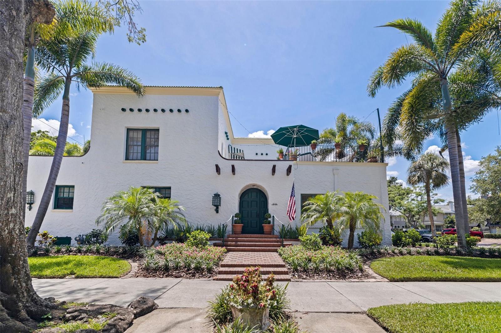 Step into a piece of St. Petersburg history with this exceptional Mediterranean estate in the coveted heart of Old Northeast in a NON FLODD ZONE—a home where timeless elegance meets modern luxury in one of the most desirable neighborhoods in the city. Sitting on a large corner lot along the coveted Cherry St, this residence boasts an impressive Mediterranean facade complemented by beautifully landscaped grounds. Inside, the home is filled with distinctive architectural features such as gleaming hardwood floors, intricate mosaic tile, vintage glass doorknobs, and crown molding that highlight the craftsmanship of a bygone era. As you enter, you're immediately captivated by a grand foyer, where an expansive skylight floods the space with radiant natural light. The awe-inspiring mosaic tile work beneath your feet is a true masterpiece, setting the tone for the elegance that flows throughout this exceptional home. The formal living room, anchored by a striking marble gas fireplace, creates an inviting ambiance for both quiet moments and entertaining. Adjacent, a versatile space, currently used as additional entertaining space, could easily serve as a 4th bedroom—thanks to its proximity to a full bathroom—or as a home office. The gourmet European kitchen features honed granite countertops, timeless subway tile, and deluxe appliances, including a brand-new refrigerator and a new Wolf 6-burner natural gas range, built-in microwave, and wall oven. For formal gatherings, the dining room offers an elegant setting, while the breakfast nook provides a charming retreat for morning coffee, opening seamlessly to a private patio—perfect for al fresco dining and enjoying the Florida sun. The second floor houses the private primary suite, offering an updated bathroom with tons of storage and a spacious walk-in shower. Two guest rooms share a beautifully updated bathroom, and the showstopper of the home is the rooftop terrace. This rare feature provides breathtaking views and is an exceptional space for entertaining or unwinding while enjoying the tranquility of the neighborhood. Outside, the expansive corner lot offers ample potential, with renderings available for a future plunge pool to create your ultimate backyard retreat. The property also boasts an attached 2-car garage and a front driveway—a unique feature in this coveted neighborhood. Recent updates include all-new plumbing, fresh interior and exterior paint, updated electrical, a new HVAC system, water purification system, new landscaping with irrigation and some updated Pella windows ensuring modern comfort alongside vintage charm. Located just steps from the sparkling waters of Tampa Bay, this home offers an idyllic lifestyle with scenic walks, bike rides, and easy access to downtown St. Petersburg’s vibrant waterfront dining, cultural venues, and boutique shopping. Whether by bike, foot, or golf cart, everything you need is within reach. Experience luxury living at its finest in this rare, beautifully restored estate—a true showcase of Mediterranean elegance and modern sophistication.