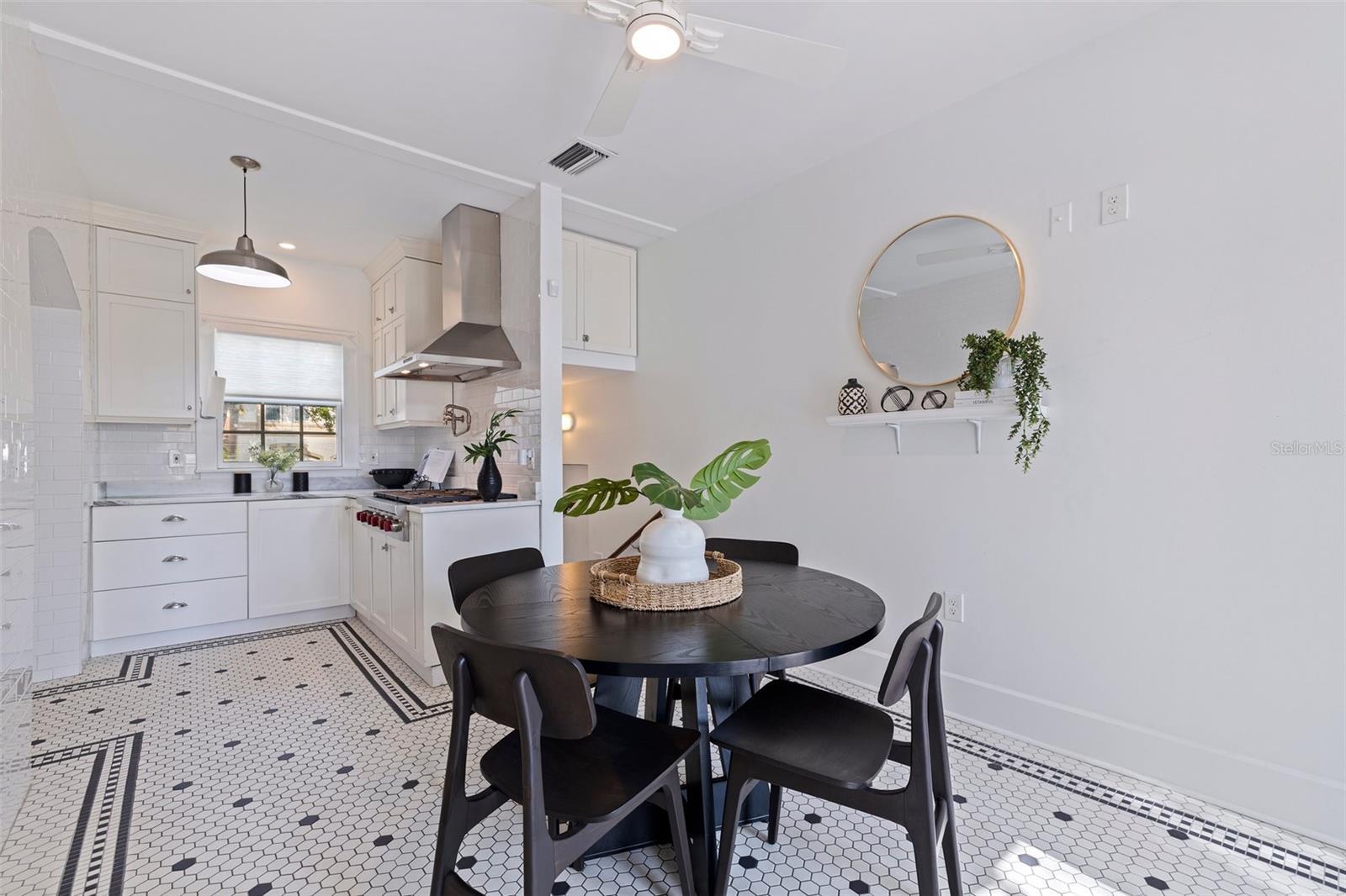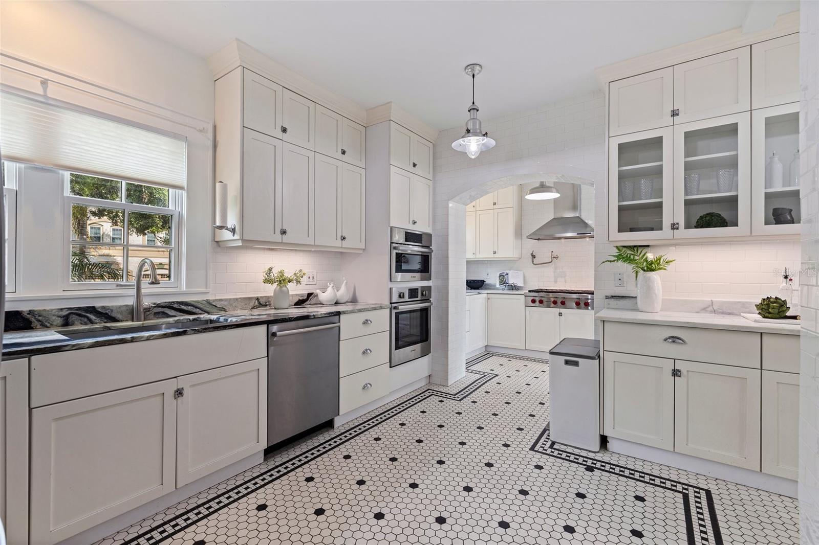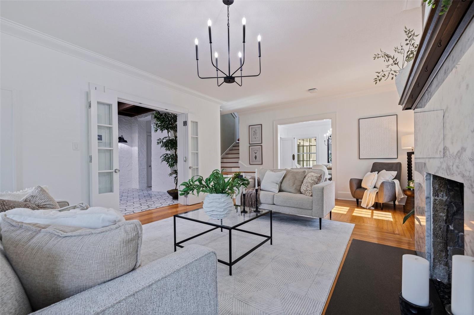 Step into a piece of St. Petersburg history with this exceptional Mediterranean estate in the coveted heart of Old Northeast in a NON FLODD ZONE—a home where timeless elegance meets modern luxury in one of the most desirable neighborhoods in the city. Sitting on a large corner lot along the coveted Cherry St, this residence boasts an impressive Mediterranean facade complemented by beautifully landscaped grounds. Inside, the home is filled with distinctive architectural features such as gleaming hardwood floors, intricate mosaic tile, vintage glass doorknobs, and crown molding that highlight the craftsmanship of a bygone era. As you enter, you're immediately captivated by a grand foyer, where an expansive skylight floods the space with radiant natural light. The awe-inspiring mosaic tile work beneath your feet is a true masterpiece, setting the tone for the elegance that flows throughout this exceptional home. The formal living room, anchored by a striking marble gas fireplace, creates an inviting ambiance for both quiet moments and entertaining. Adjacent, a versatile space, currently used as additional entertaining space, could easily serve as a 4th bedroom—thanks to its proximity to a full bathroom—or as a home office. The gourmet European kitchen features honed granite countertops, timeless subway tile, and deluxe appliances, including a brand-new refrigerator and a new Wolf 6-burner natural gas range, built-in microwave, and wall oven. For formal gatherings, the dining room offers an elegant setting, while the breakfast nook provides a charming retreat for morning coffee, opening seamlessly to a private patio—perfect for al fresco dining and enjoying the Florida sun. The second floor houses the private primary suite, offering an updated bathroom with tons of storage and a spacious walk-in shower. Two guest rooms share a beautifully updated bathroom, and the showstopper of the home is the rooftop terrace. This rare feature provides breathtaking views and is an exceptional space for entertaining or unwinding while enjoying the tranquility of the neighborhood. Outside, the expansive corner lot offers ample potential, with renderings available for a future plunge pool to create your ultimate backyard retreat. The property also boasts an attached 2-car garage and a front driveway—a unique feature in this coveted neighborhood. Recent updates include all-new plumbing, fresh interior and exterior paint, updated electrical, a new HVAC system, water purification system, new landscaping with irrigation and some updated Pella windows ensuring modern comfort alongside vintage charm. Located just steps from the sparkling waters of Tampa Bay, this home offers an idyllic lifestyle with scenic walks, bike rides, and easy access to downtown St. Petersburg’s vibrant waterfront dining, cultural venues, and boutique shopping. Whether by bike, foot, or golf cart, everything you need is within reach. Experience luxury living at its finest in this rare, beautifully restored estate—a true showcase of Mediterranean elegance and modern sophistication.