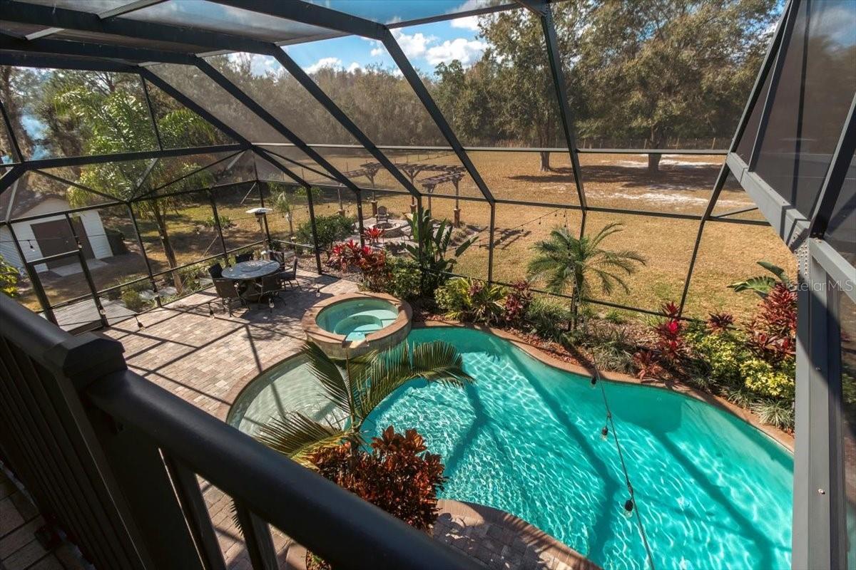 Experience the ultimate in Florida living at this exceptional 5-bedroom, 2.5-bath estate set on two private, tree-lined acres in Land O’ Lakes. Enter through a gated drive and be welcomed by mature oak trees, manicured landscaping, and a freshly painted exterior (2025) that enhances the home’s stately presence. Inside, sun-filled living spaces showcase elegant crown molding, gleaming hardwood floors, and plantation shutters in the living and dining rooms. The chef’s kitchen features granite countertops, stainless steel appliances, and a center island ideal for entertaining. The main-level primary suite offers a peaceful retreat with a spa-like bath, soaking tub, and walk-in shower. Upstairs, additional spacious bedrooms offer generous layouts and walk-in closets, with two opening to a grand balcony under the screened enclosure. Step outside to your private backyard oasis with a two-level screened lanai, sparkling pool and spa, pergola, and stone fire pit—perfect for relaxing or hosting gatherings. Additional highlights include a two-car garage, oversized workshop, storm-proof Pella sliding glass door (2022), roof replaced in 2020, and two Rheem A/C systems installed in 2024 and under warranty. Ideally located just 20 miles from Tampa, with easy access to shopping, dining, parks, and outdoor recreation—this home offers luxury, privacy, and convenience all in one