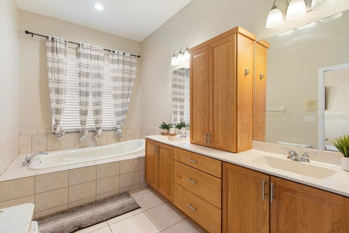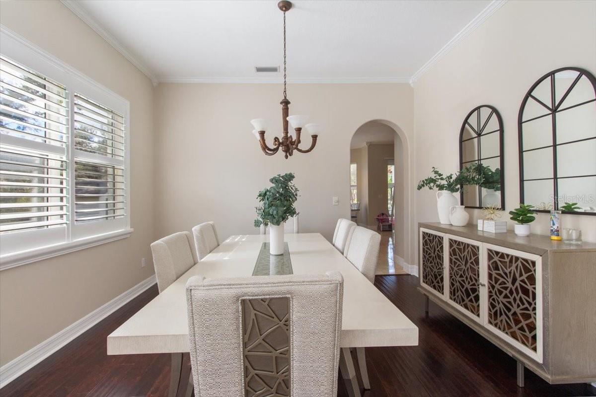 - Built-in Features, Ceiling Fans(s), Crown Molding, Primary Bedroom Main Floor, Solid Surface Counters, Solid Wood Cabinets, Thermostat, Walk-In Closet(s), Window Treatments