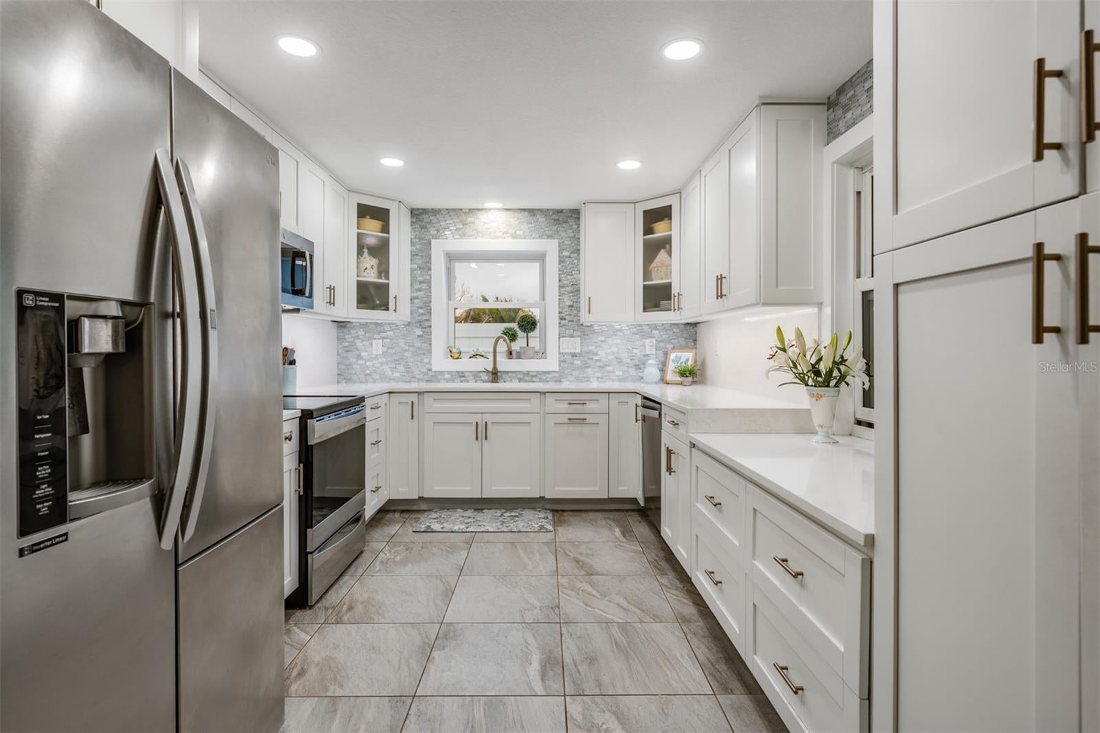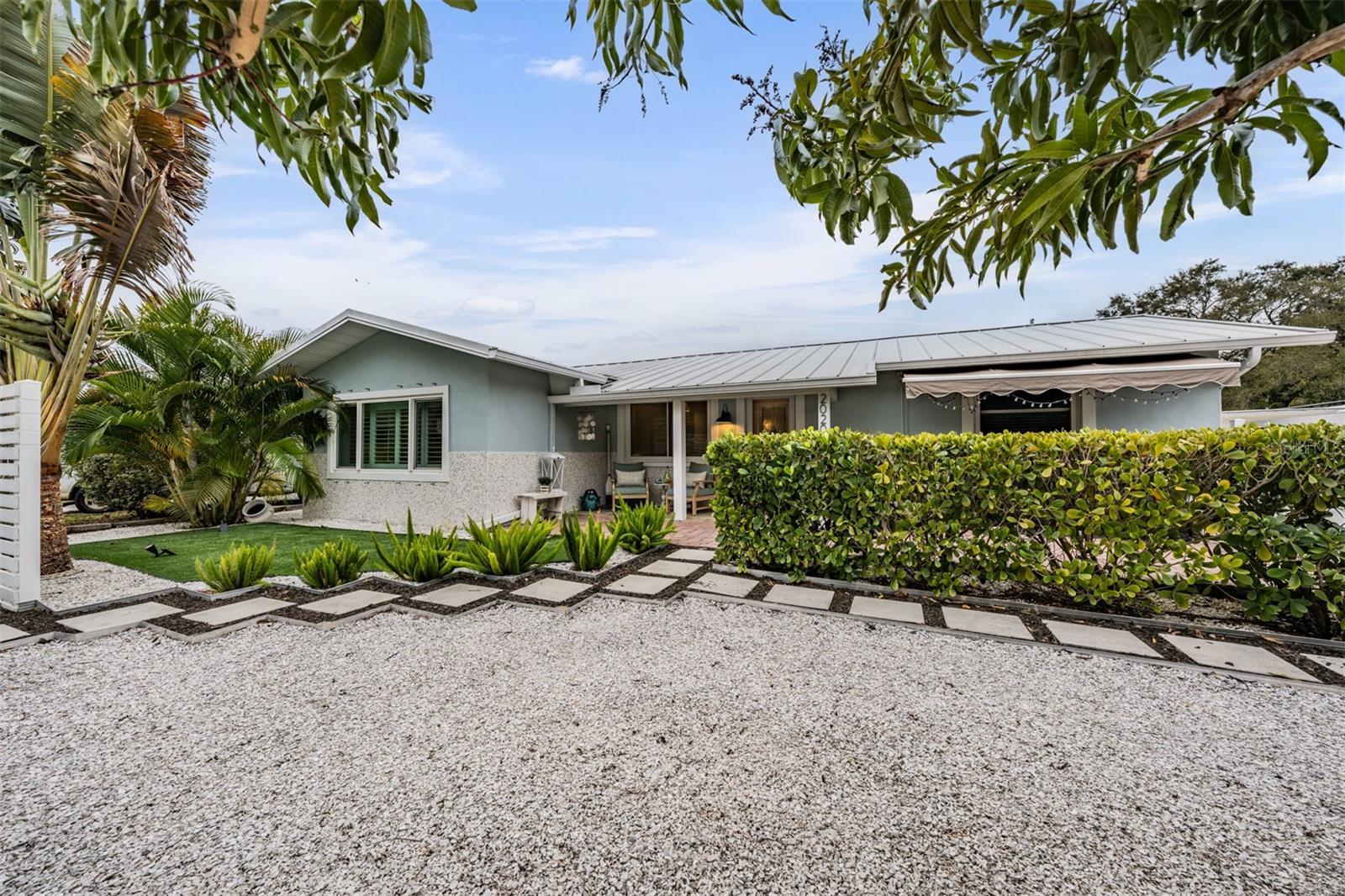 An exceptional opportunity to own this fully renovated, energy-efficient 3-bedroom, 2-bath residence with an oversized 3-car plus detached garage, perfectly positioned on nearly one-third of an acre in one of Pinellas County’s most vibrant and sought-after communities. Thoughtfully redesigned from top to bottom, this home blends modern luxury with long-term durability and efficiency. As you enter off the circular driveway and through the glass front door, a bright, open-concept layout greets you, featuring elegant tile and luxury vinyl wood-look flooring throughout. The 2021 designer kitchen showcases white wood shaker cabinetry with custom pull-out storage, a built-in pantry, quartz countertops, a striking custom tile backsplash, stainless steel appliances, and a convection oven—ideal for both everyday living and entertaining. The primary suite is a private retreat, offering a spa-inspired bathroom with a new vanity and countertop, a large tiled walk-in shower, premium fixtures, and a spacious walk-in closet. The guest bedroom and secondary bathroom have also been updated with new flooring, new vanity, and upscale finishes. The third bedroom offers complete privacy and an oversized walk-in closet, located on the opposite side of the home—perfect for guests, home office, or multigenerational living. Just off the dining area, a large interior laundry room leads to the screened lanai. From there, step outside to a sprawling, resort-like fenced backyard featuring paver patios, a Trex deck behind the garage with a newly built pergola, firepit area, new landscape lighting, and ample space to add a resort-style pool. The impressive detached 3-car garage offers abundant storage, a custom-built game room, hurricane-rated doors, front and rear access, and the flexibility to easily convert a portion into a guest house or in-law suite. Three additional storage sheds also convey. This home is loaded with premium infrastructure upgrades including a fully owned solar electric system (average electric bill approximately $40), metal roof and soffits (2015), high-efficiency A/C (2019) with blue light filter, Icynene insulation, hurricane-rated low-E windows and doors, natural gas with on-demand water heater and gas dryer, new PVC plumbing throughout, new stucco and exterior paint on both the home and garage, and a transfer switch with natural gas hookup for a portable generator. Additional improvements include new interior doors, molding and baseboards, upgraded whole-home lighting, and new front and rear landscaping with irrigation system and shallow well pump. Golf cart friendly with direct access to Downtown Dunedin and ideally located near the Pinellas Trail, Honeymoon Island, Historic Dunedin Golf Course, a splash park, Dunedin community center and community pool, highlander park, Hammock Park, world-class beaches, championship golf, shopping, dining, and Tampa International Airport—this is a rare turnkey estate combining lifestyle, luxury, and long-term value. Home is in a NON FLOOD ZONE!