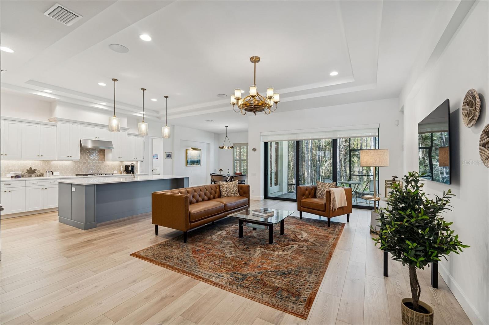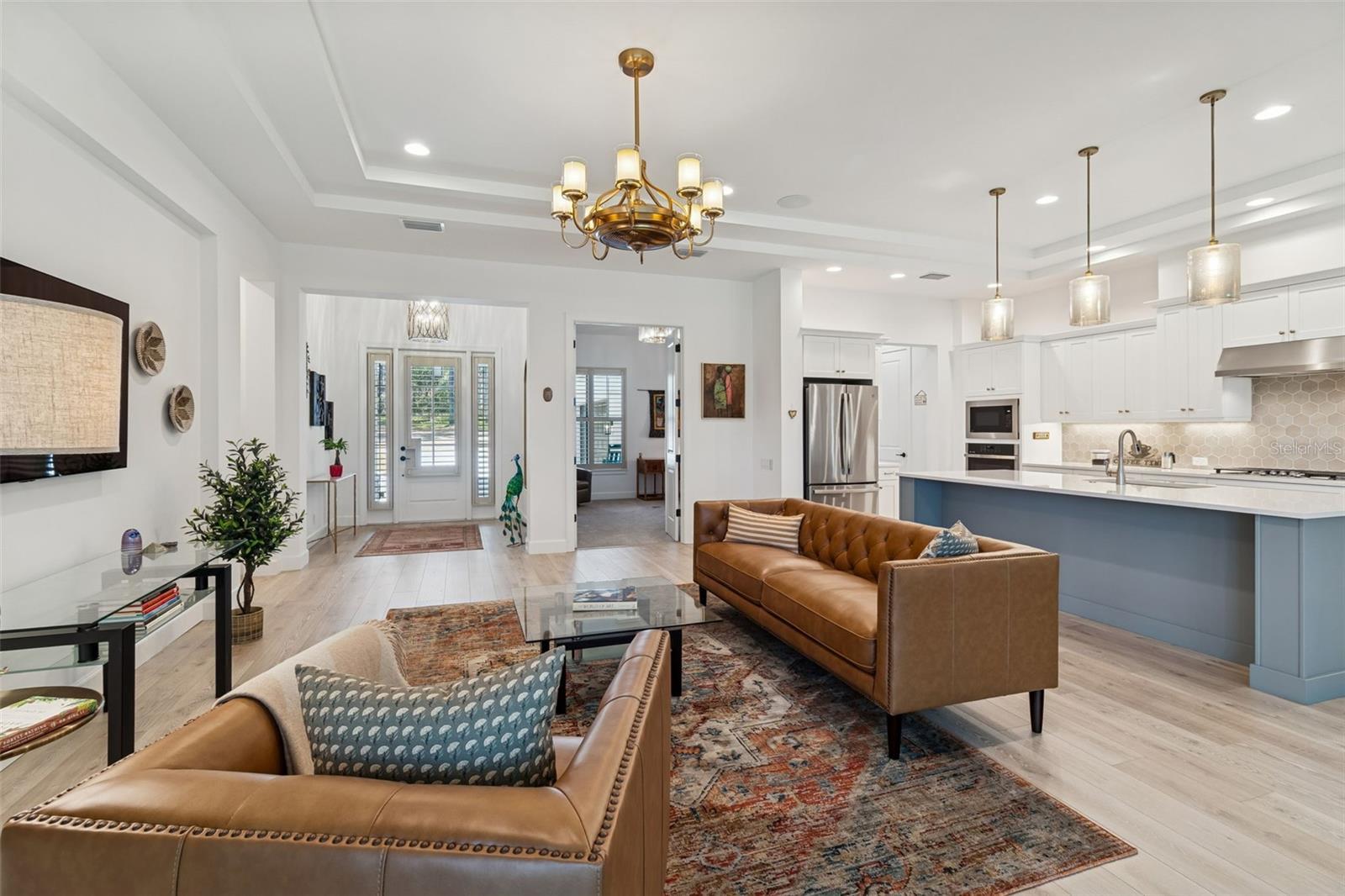 Welcome to refined Florida living in guard-gated Southern Hills, where this 2024 Arthur Rutenberg–built residence sits gracefully on a premium conservation homesite with serene water views. Thoughtfully designed and beautifully finished, this one-story home offers 4 bedrooms plus a private office, 3 full baths, and a 3-car side-entry garage—all wrapped in timeless elegance. A brick paver driveway and covered front porch set the tone as you step through the striking glass front door into a light-filled foyer with soaring ceilings. Throughout the home, you’ll find classic plantation shutters as well as designer light fixtures and ceiling fans, creating a cohesive and elevated aesthetic. The heart of the home is the chef’s kitchen, anchored by a large island with rich blue cabinetry, quartz countertops, and an oversized stainless sink. Surrounding cabinetry in crisp white features crown molding, under-cabinet lighting, and gold hardware, complemented by a decorative tile backsplash. Sleek stainless steel appliances including a built-in oven and microwave, 5-burner cooktop, range hood, fridge and dishwasher complete the look. Spacious walk-in pantry is a fantastic bonus feature. Adjacent dining area features French doors leading to the outdoor living space, enhancing indoor-outdoor flow. Luxury vinyl plank flooring flows seamlessly through the foyer, kitchen, family room, and dinette. The family room is both inviting and impressive, highlighted by a double tray ceiling, built-in Sonos speaker system, and a wall of sliding glass doors offering breathtaking views of the wooded backyard—perfect for everyday living and entertaining alike. Step outside to the covered and screened brick-paver patio, already pre-plumbed for an outdoor kitchen, where you can relax and enjoy peaceful conservation and water views year-round. Double doors open to a private home office, ideal for working from home or a quiet retreat. The primary suite is a true sanctuary with a tray ceiling, spacious walk-in closet with window and custom organization, and a spa-inspired en-suite bath featuring a freestanding soaking tub, expansive walk-in shower, and dual vanities. One guest bedroom offers a private en-suite bath with walk-in shower, wood cabinetry, and granite counters—perfect for guests or multigenerational living. Two additional bedrooms share a well-appointed full bath with a walk-in shower. The laundry room is thoughtfully finished with a sink and granite countertops. The side-entry 3-car garage features an epoxy floor and houses the water softener and conditioning system, blending function with polish. All of this is located within Southern Hills, a premier resort-style community offering a luxury pool, fitness center, pickleball courts, clay tennis courts, walking trails, clubhouse with restaurant, and a championship golf course! This exceptional home delivers new construction quality, designer finishes, and resort living—all in one of Brooksville’s most coveted communities.