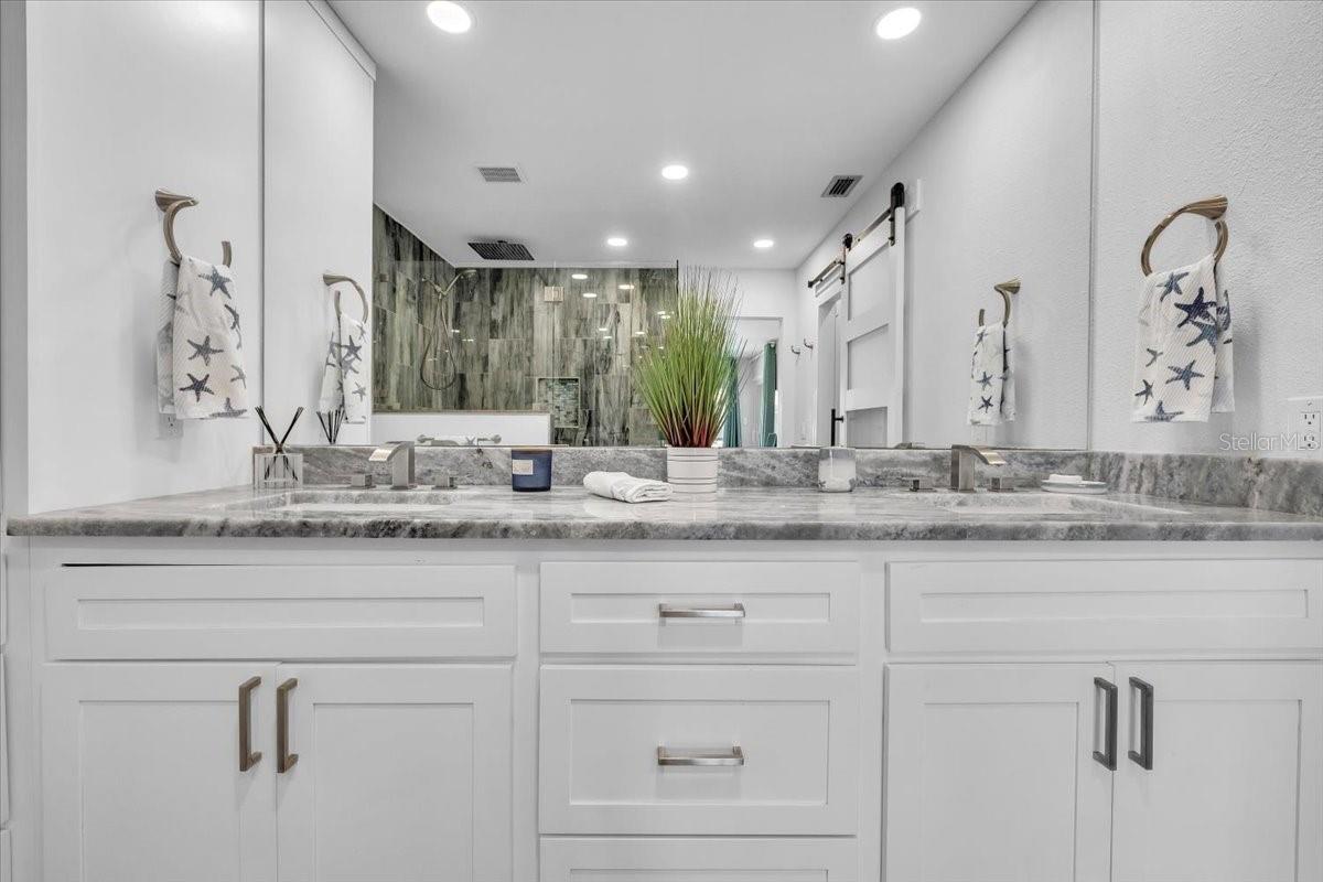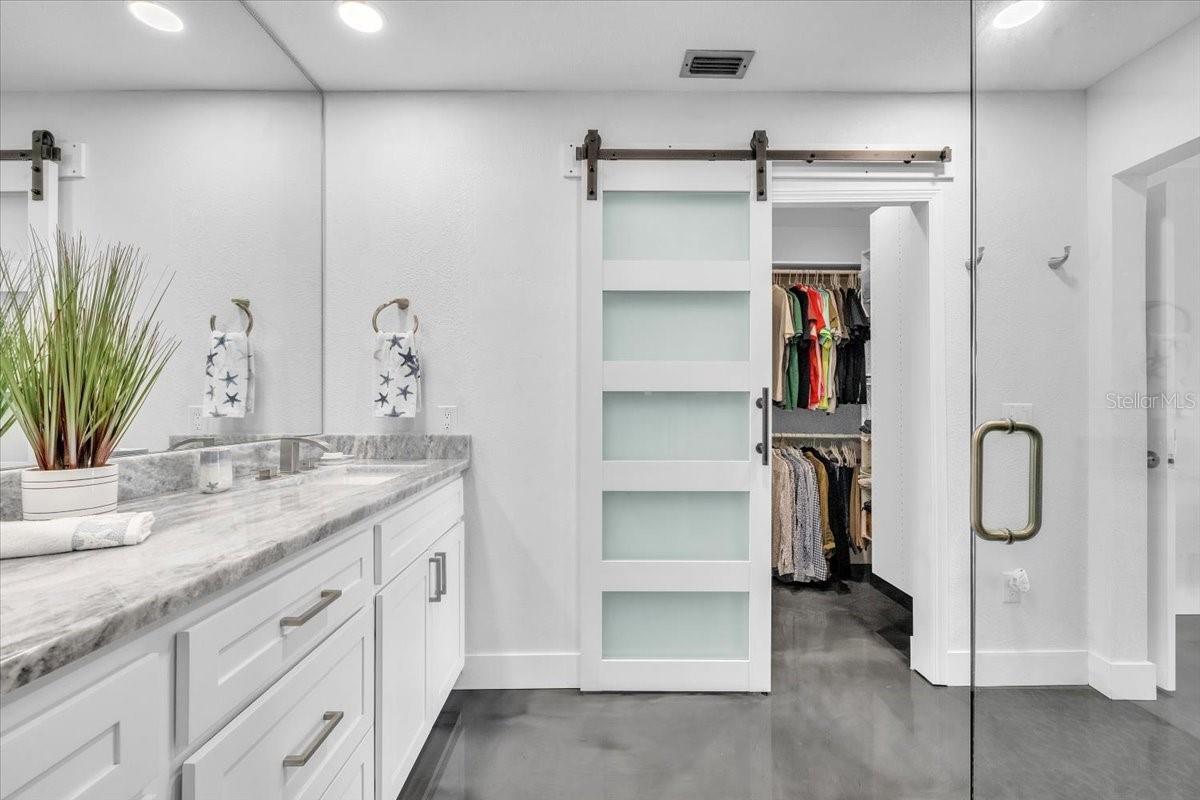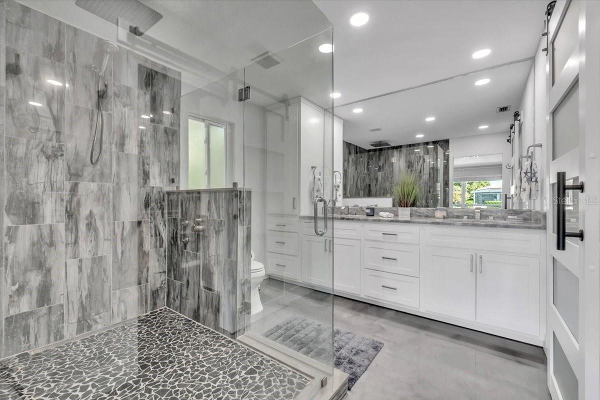 - Ceiling Fans(s), Eat-in Kitchen, Kitchen/Family Room Combo, Living Room/Dining Room Combo, Open Floorplan, Primary Bedroom Main Floor, Solid Surface Counters, Solid Wood Cabinets, Split Bedroom, Stone Counters, Thermostat, Walk-In Closet(s)