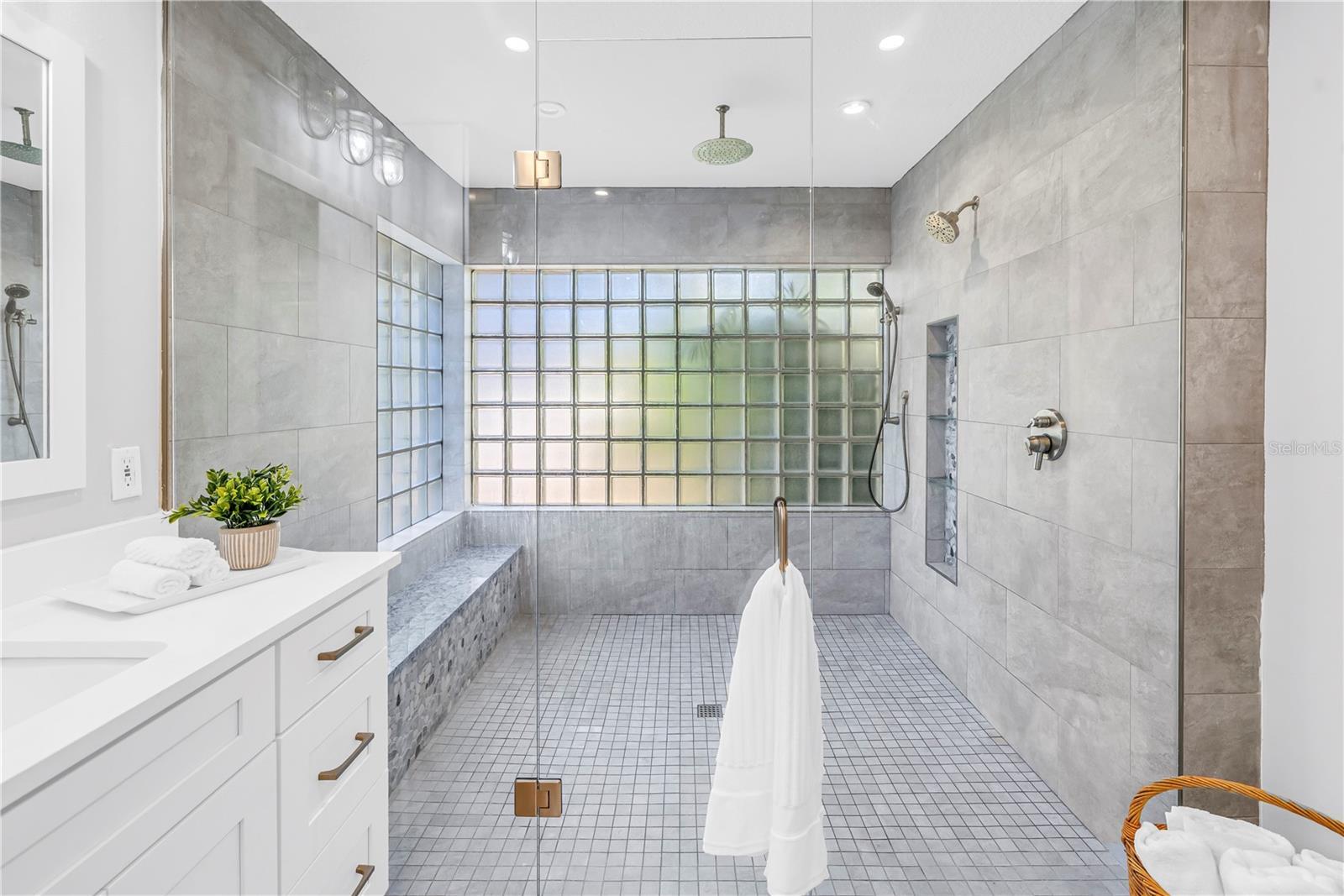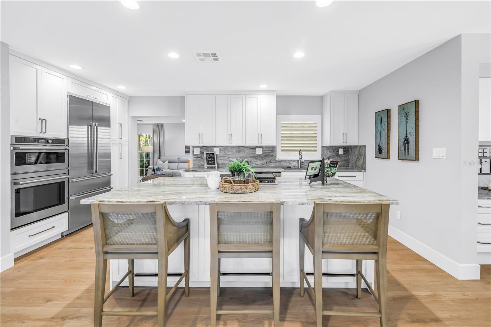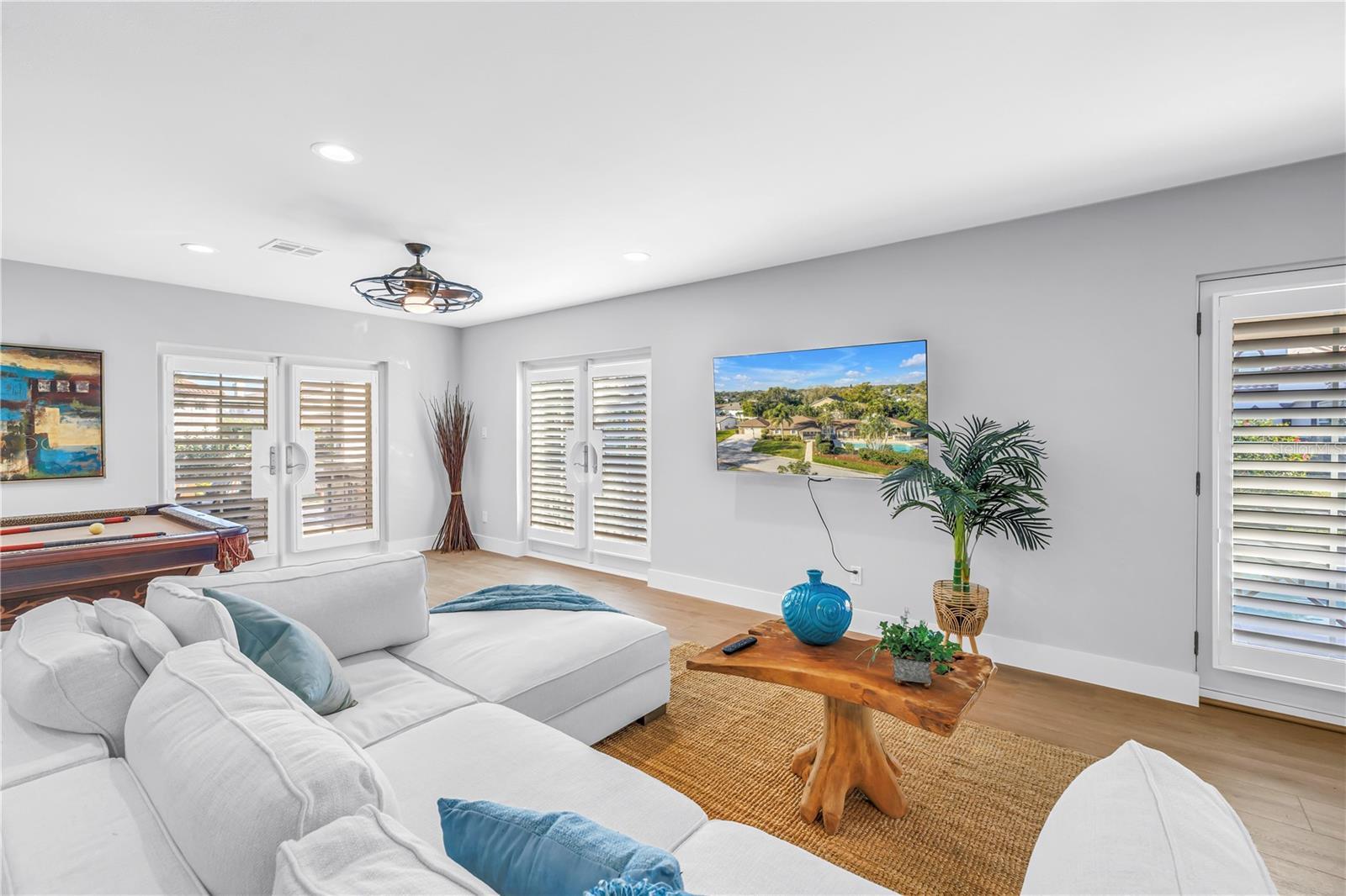 This exceptionally renovated 4-bedroom, 3.5 bath, concrete block estate is set on an oversized corner lot in the Snell Isle community, surrounded by lush, professionally landscaped grounds that provide rare privacy. All renovations have been thoughtfully executed with permits, ensuring quality and peace of mind. A gracious covered entry leads into a refined foyer that anchors the residence. New flooring throughout enhances the home’s aesthetic while offering lasting durability. The expansive family and dining rooms are bathed in natural light from walls of windows, highlighting curated architectural details and offering serene views of the private outdoor retreat. The chef’s kitchen has been recently reimagined with elegant stone countertops, solid wood cabinetry, and top-of-the-line GE Café appliances, blending form and function for elevated entertaining. A generously sized secondary family room offers versatile living space, currently styled as an upscale billiards lounge. The primary suite is a private sanctuary, featuring a spacious walk-in closet, a spa-inspired walk-in shower with glass enclosure, and a dual Quartz-topped vanity. A well-appointed guest suite includes a full bath and exclusive access to the backyard, ideal for hosting guests in comfort and privacy. Outdoor living is unparalleled, with an oversized pool deck and a stunning covered entertaining pavilion featuring a substantial stone island, bar refrigerator, and a built-in gas fireplace, creating a resort-style setting for both intimate evenings and grand gatherings. Additional luxury appointments include a full-size two-car garage and a whole-house tankless gas water heater. Located in one of St. Petersburg’s most coveted neighborhoods, this Snell Isle residence offers timeless elegance, refined comfort, and an exceptional Florida lifestyle.