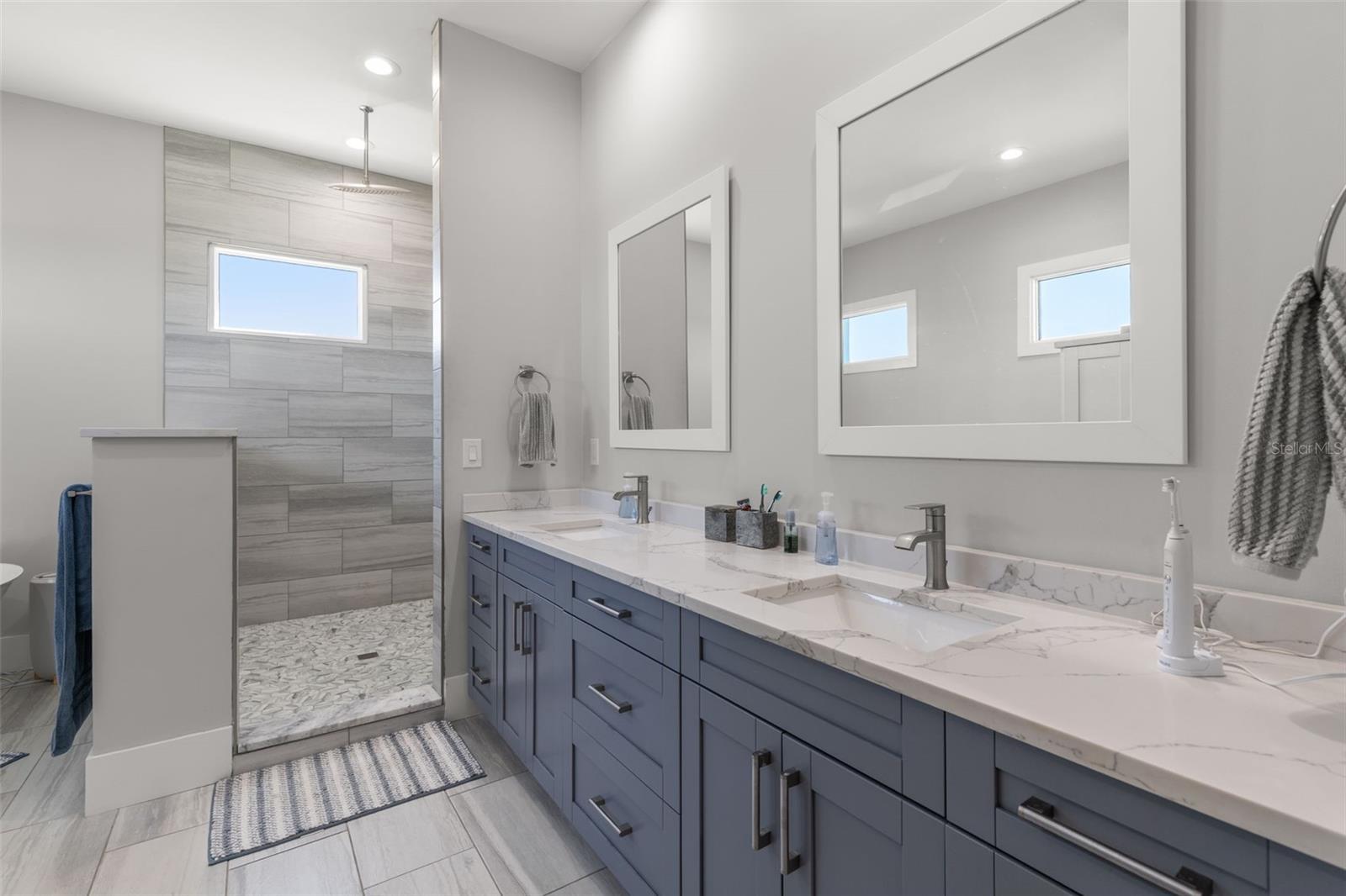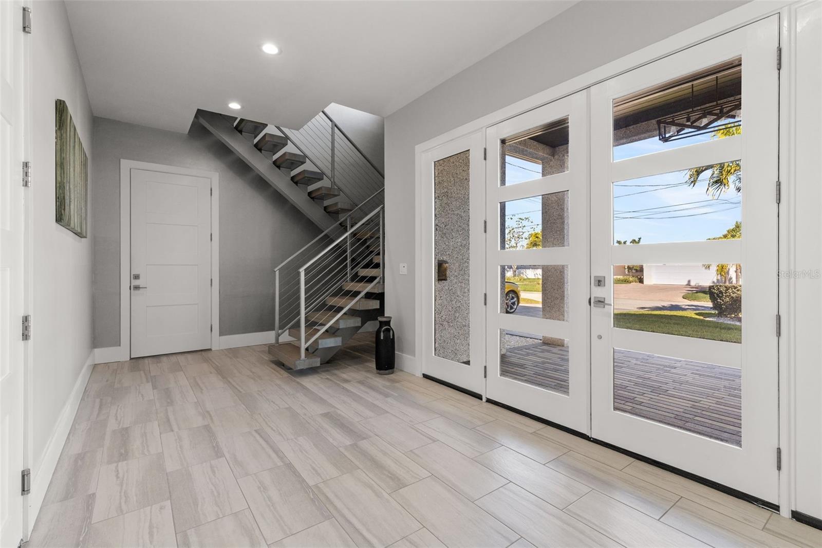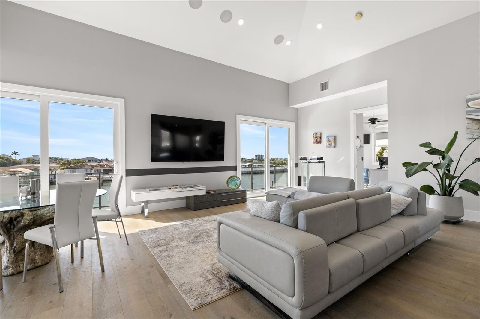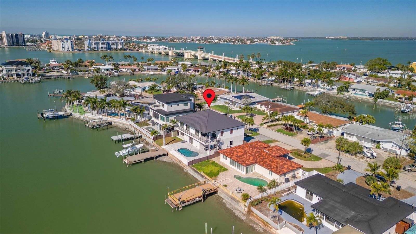 Superior construction, exceptional craftsmanship, and thoughtful design define this 2020 built custom waterfront residence. Located in the coveted Causeway Isles neighborhood, the home was built to exceed standards with solid concrete block construction, hurricane-rated impact windows and doors, metal roof, and Icynene spray-foam insulation—offering durability, efficiency, and long-term peace of mind. As a fully integrated smart home, Alexa-enabled controls enhance comfort, convenience, and energy performance throughout. The entry begins with oversized 16-foot doors, opening to a light-filled foyer anchored by a striking floating staircase. The main living level unfolds upstairs into an expansive open-concept layout with 22-foot vaulted ceilings, wide-plank oak flooring, and sweeping water views. The kitchen is a coastal statement with two-tone cabinetry, quartz surfaces, premium stainless appliances, and an oversized island centered around a farmhouse sink. The primary suite offers a serene escape, complete with water views, 10 foot ceilings, electric blackout blinds, and an enormous walk-in closet. The spa-style bath rivals a five-star resort, featuring dual quartz vanities, a large glass-enclosed shower, and a deep soaking tub. A thoughtfully designed split-bedroom layout ensures privacy and comfort for guests. The exterior is finished with stunning Tabby Shell stucco, slip-resistant pavers, a resort-style pool, covered outdoor kitchen, and ample space for entertaining. Enjoy unforgettable Treasure Island sunsets from the upper-level balcony. Boaters will appreciate the exceptional dock setup, with a 16,000-lb lift, deep protected water, Trex decking, and quick access to Boca Ciega Bay and the Gulf of Mexico. The six-car garage has tons of space for storage, work areas, and has an additional half bathroom.