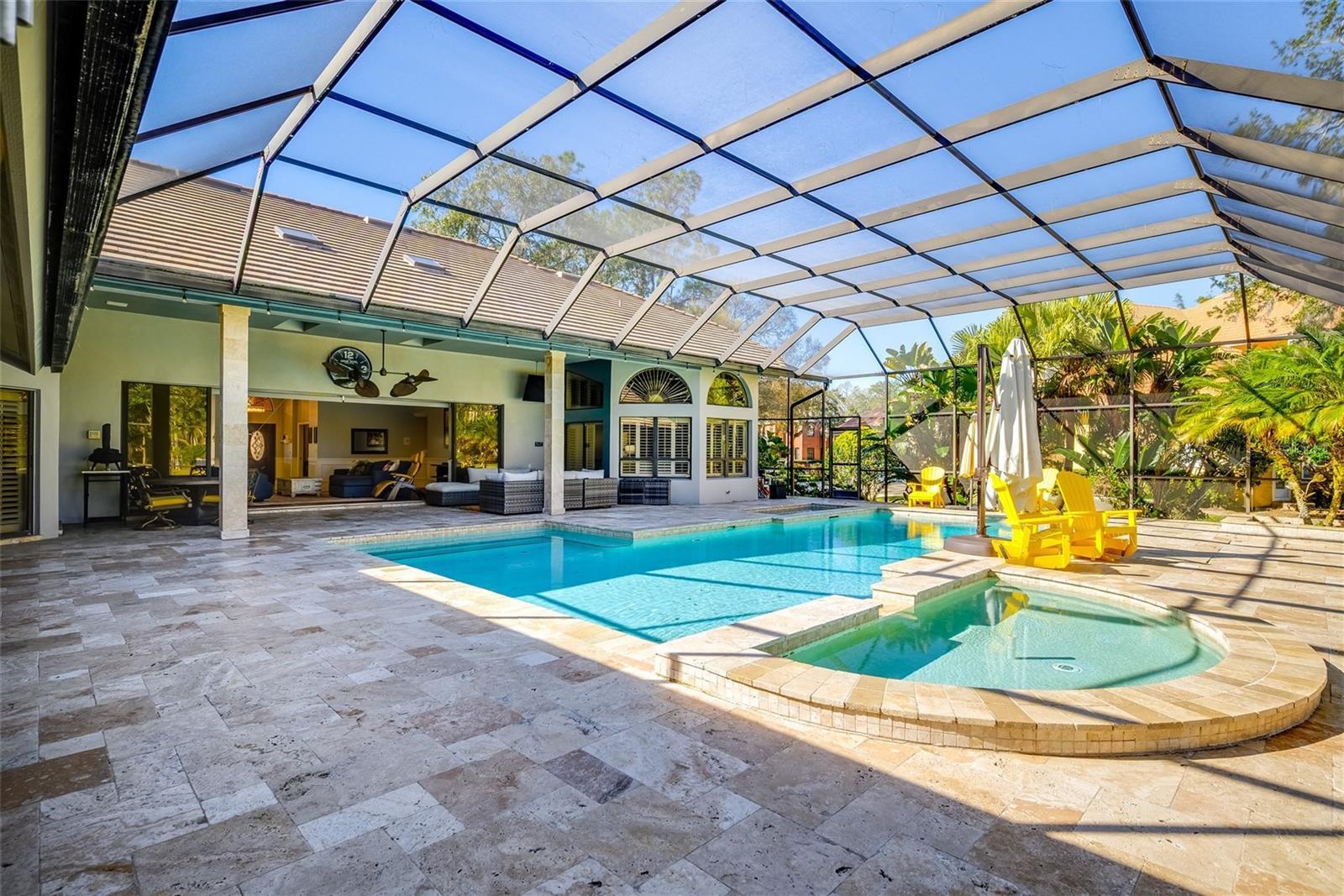 WELCOME HOME to this exceptional luxury residence in THE RESERVE AT TAMPA PALMS—the only gated, 24-hour security enclave within this highly coveted golf course community. From the moment you arrive, the brick-paver circular driveway and grand DOUBLE DOOR entry make a striking first impression. Step inside to a bright, open layout designed for both elegant living and effortless entertaining, featuring a formal dining area, private office/den, and an expansive main living space highlighted by soaring ceilings, architectural details, and floor-to-ceiling windows that fill the home with natural light. Your eyes are immediately drawn to the show-stopping outdoor space, where oversized sliding pocket doors open wide to reveal a WIDE WATER VIEW and an impressive RESORT STYLE POOL and SPA complete with water features, creating the ultimate seamless indoor-outdoor Florida lifestyle. The beautifully appointed kitchen opens into a secondary living space with a GAS FIREPLACE and sunroom-style dining or flex area, offering GRANITE COUNTERTOPS, abundant cabinetry, a built-in custom WALL REFRIGERATOR, upgraded appliances, and a CUSTOM BUILT BAR conveniently located adjacent to the kitchen—making this home a dream for entertaining. The split-bedroom floorplan provides maximum privacy with a serene owner’s retreat tucked away on its own wing, featuring VOLUME CEILINGS, striking architectural windows, two walk-in closets, and a spa-inspired ensuite bath with a SOAKING TUB, walk-in shower, double vanities, and a peaceful, relaxing ambiance. On the opposite side of the home, you’ll find three additional bedrooms including a Jack-and-Jill layout, plus a guest bath that also functions as a pool bath, while thoughtful upgrades like custom cabinetry, extra storage, trim work, and designer paint selections elevate every space. Outside, enjoy an expansive covered lanai with room for lounging and dining, an OUTDOOR KITCHEN, and serene views of a TRANQUIL POND, perfect for relaxing evenings and weekend gatherings. Additional upgrades include a side-entry 3-car garage with pristine epoxy flooring and a high-end ProSlat wall and cabinet storage system, an electric vehicle charging port, whole-home water softener and reverse osmosis drinking water system, fully fenced property, professional exterior landscape lighting, and permanent custom holiday lighting with remote-controlled color options. Inside, plantation shutters throughout and electric shades in the main living area add comfort and style, along with fruit trees on the property and natural gas throughout for added efficiency. Living in Tampa Palms also means enjoying an incredible community lifestyle with a luxury clubhouse, wine club, tennis courts, swimming pools, and a state-of-the-art fitness center, all conveniently located near top-rated schools, hospitals, shopping, dining, and entertainment—offering the rare combination of privacy, security, luxury, and lifestyle that truly can’t be beat.