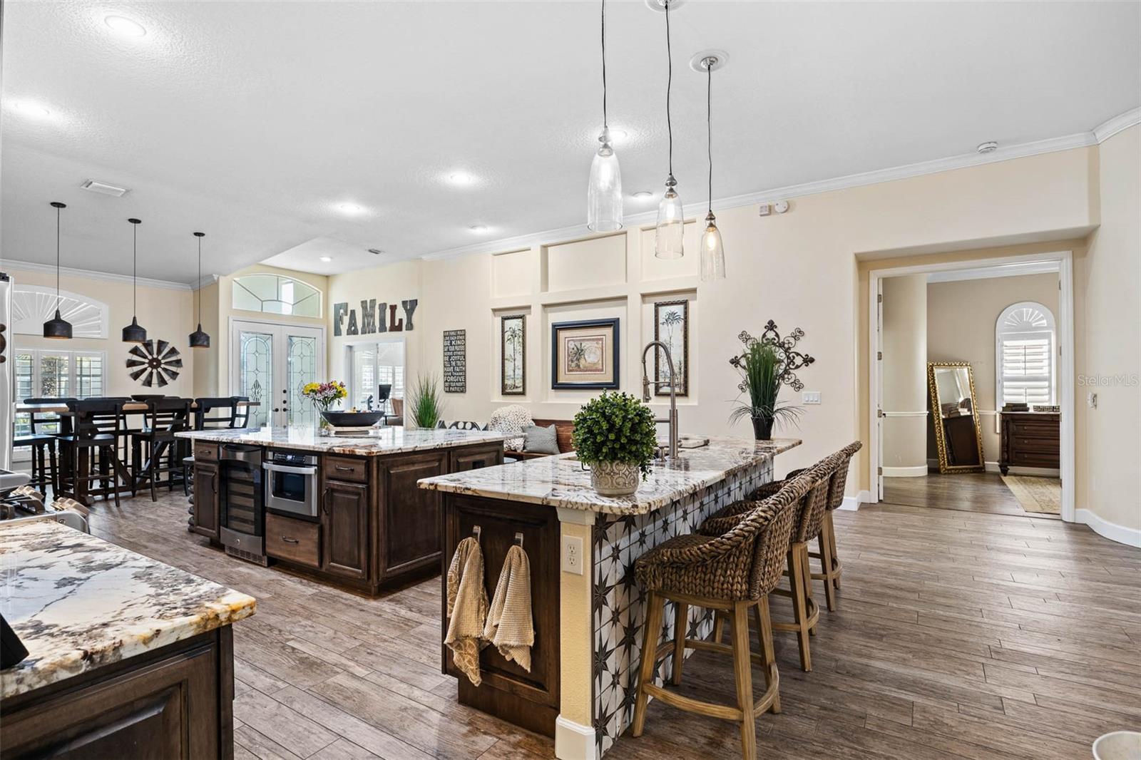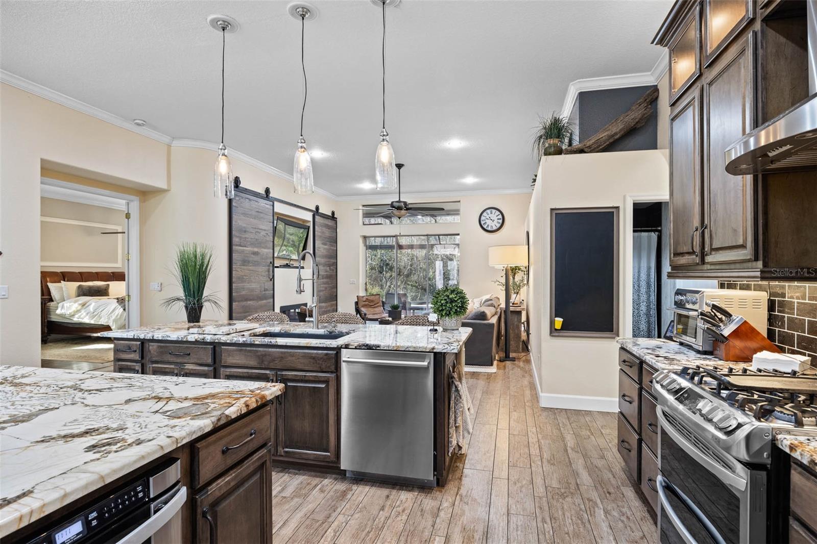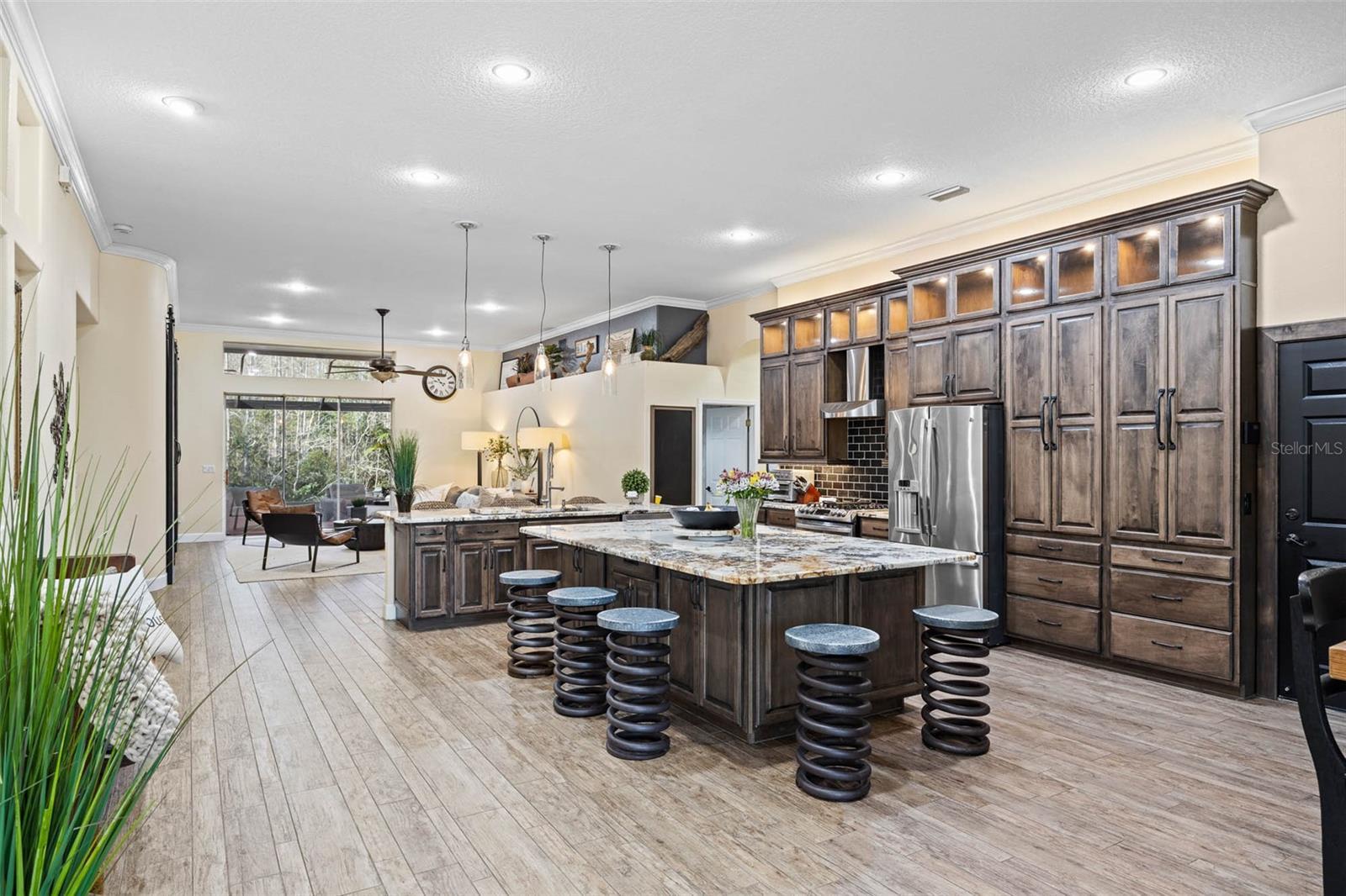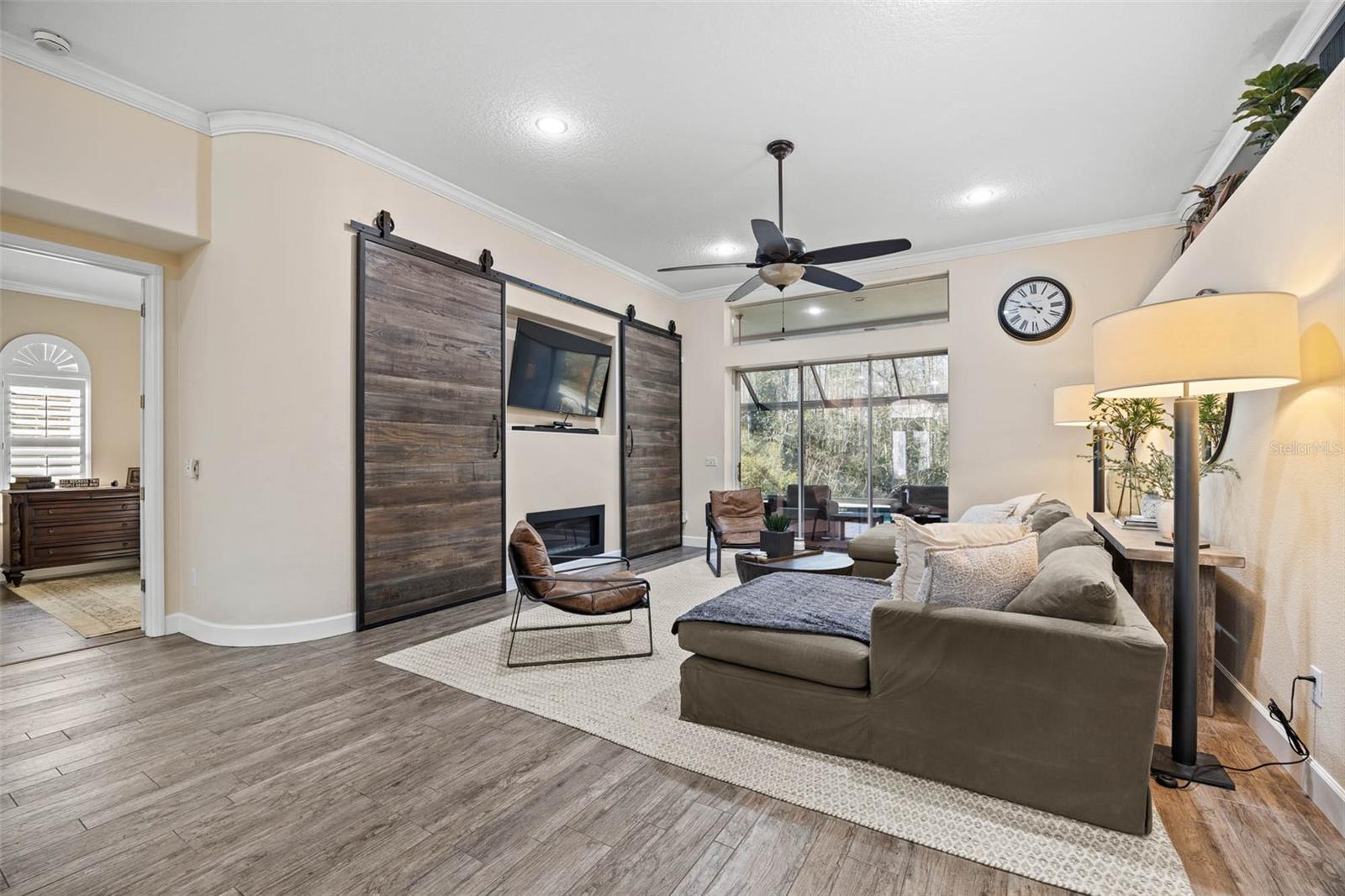 Welcome to this beautifully designed one-story pool home, perfectly situated on a quiet cul-de-sac and backing to a serene conservation lot with no rear neighbors. Offering 4 bedrooms plus a dedicated office, 3 full bathrooms, and a 3-car garage, this home combines space, privacy, and functionality. The thoughtfully designed split floor plan places three bedrooms on one side of the home while the private primary suite is tucked away on the opposite side. At the heart of the home, an open and airy layout seamlessly connects the kitchen, dining room, and living room, creating the perfect setting for everyday living and entertaining. The home is also equipped with a water purification system, adding an extra layer of comfort and convenience to daily living. Sliding doors open to a private outdoor retreat featuring a screened-in, solar-heated pool, offering energy-efficient enjoyment year-round. The expanded backyard is designed for fun and relaxation, showcasing an expansive turf area with a putting green, a full-size bocce ball court, and a large exterior chess set—all set against peaceful conservation views with no backyard neighbors. Additional highlights include a generator-ready setup with a dedicated pad and connector, providing peace of mind and preparedness. Whether hosting gatherings or enjoying quiet evenings at home, this property delivers exceptional indoor-outdoor living, privacy, energy-conscious features, and a prime cul-de-sac location—all on one level.